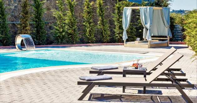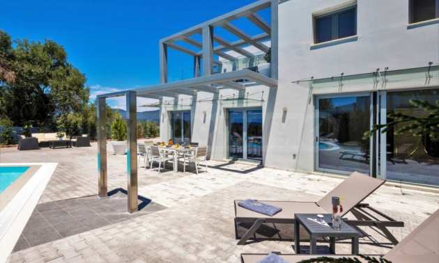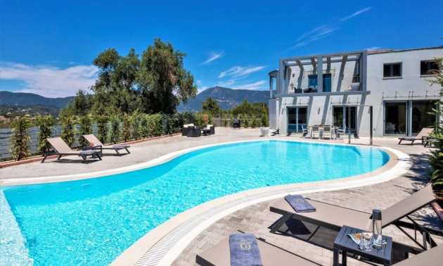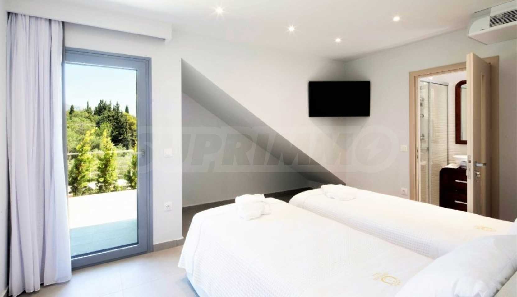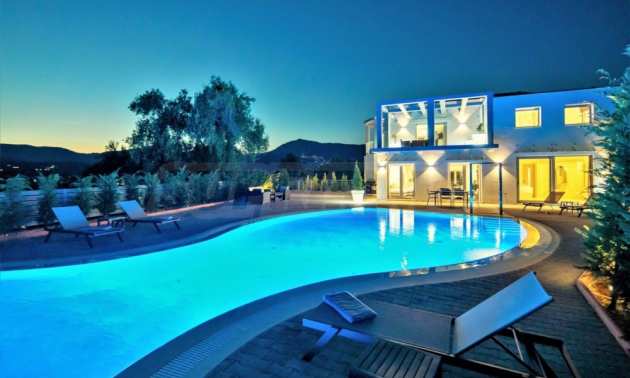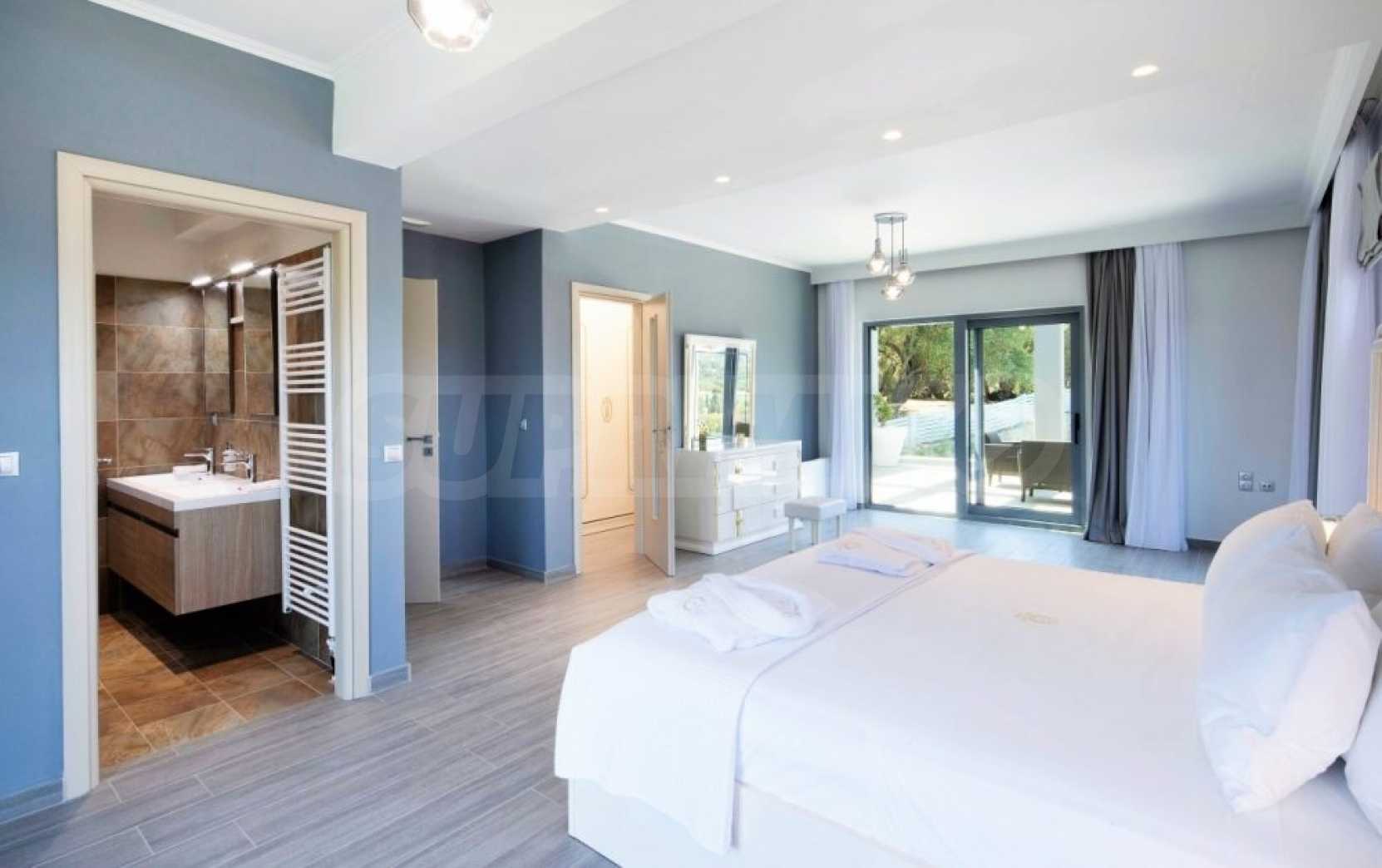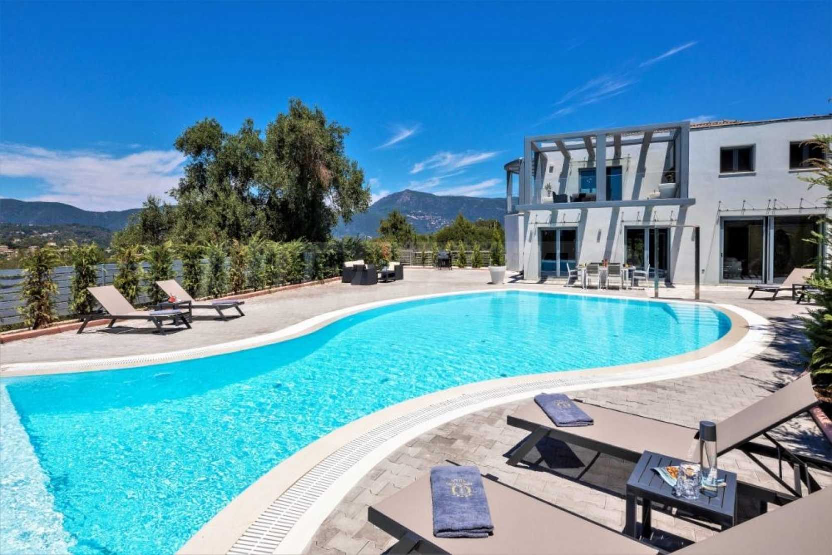 Тази уникална луксозна вила с обща площ от 436 кв.м. с тенис корт и 2 плувни басейна е построена на едно от най-добрите места на острова, района Комено, който се намира централно на Корфу.