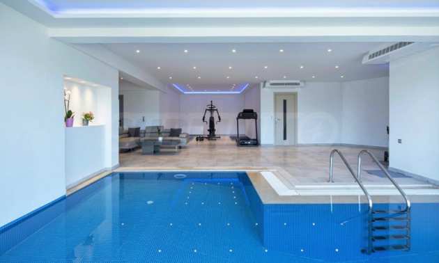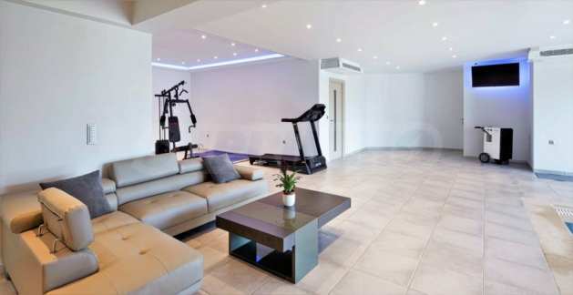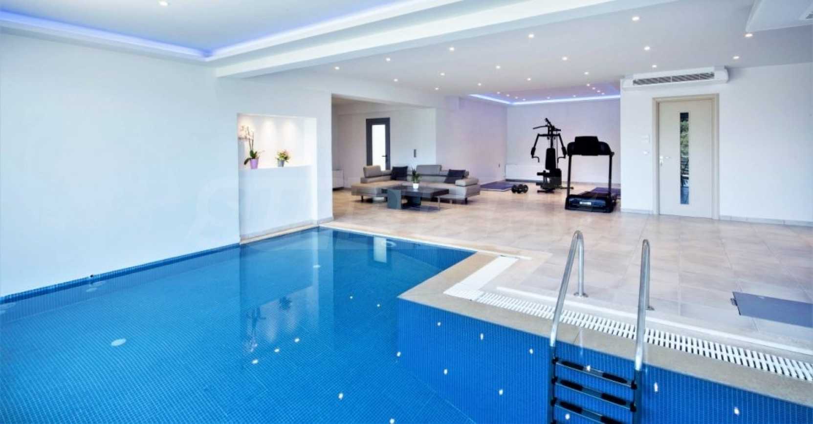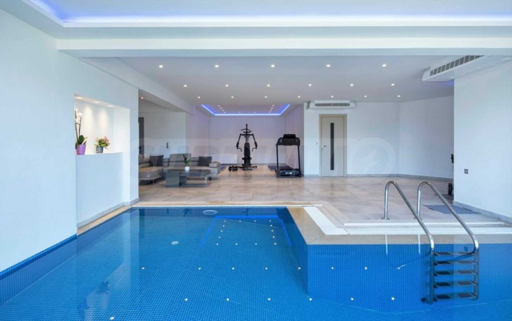 Първото ниво се състои от фитнес зала с отопляем басейн, гараж, една спалня, една баня, дрешник, соларна система, която осигурява електричество и машинно отделение.