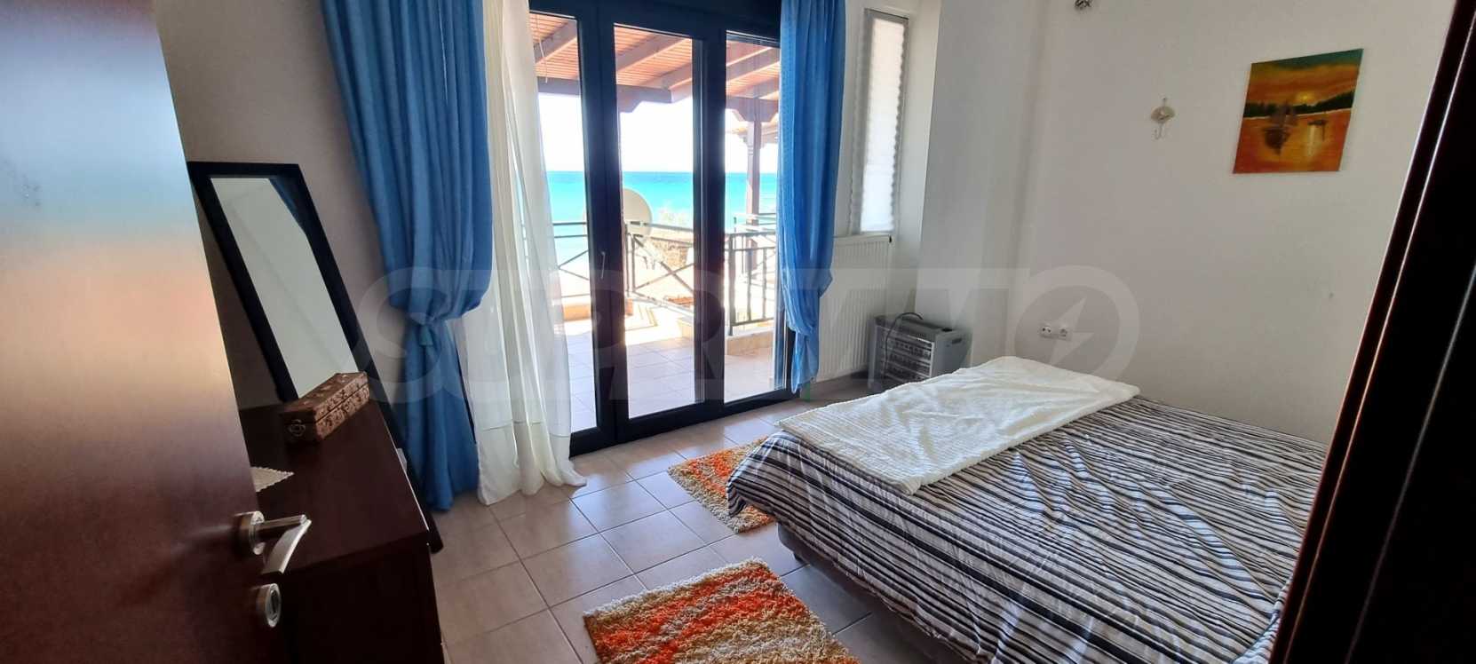 Уникален мезонет На брега на морето, на много красиво място в Касандра, в малкия рай на Халкидики. Имотът е разположен на площ от 180 кв.м. , с невероятна морска панорама, на 200 .м от центъра на селото. Състои се от 2 нива с общо 115 кв.м. жилищна площ. Имотът включва 3 спални, склад и 2 бани