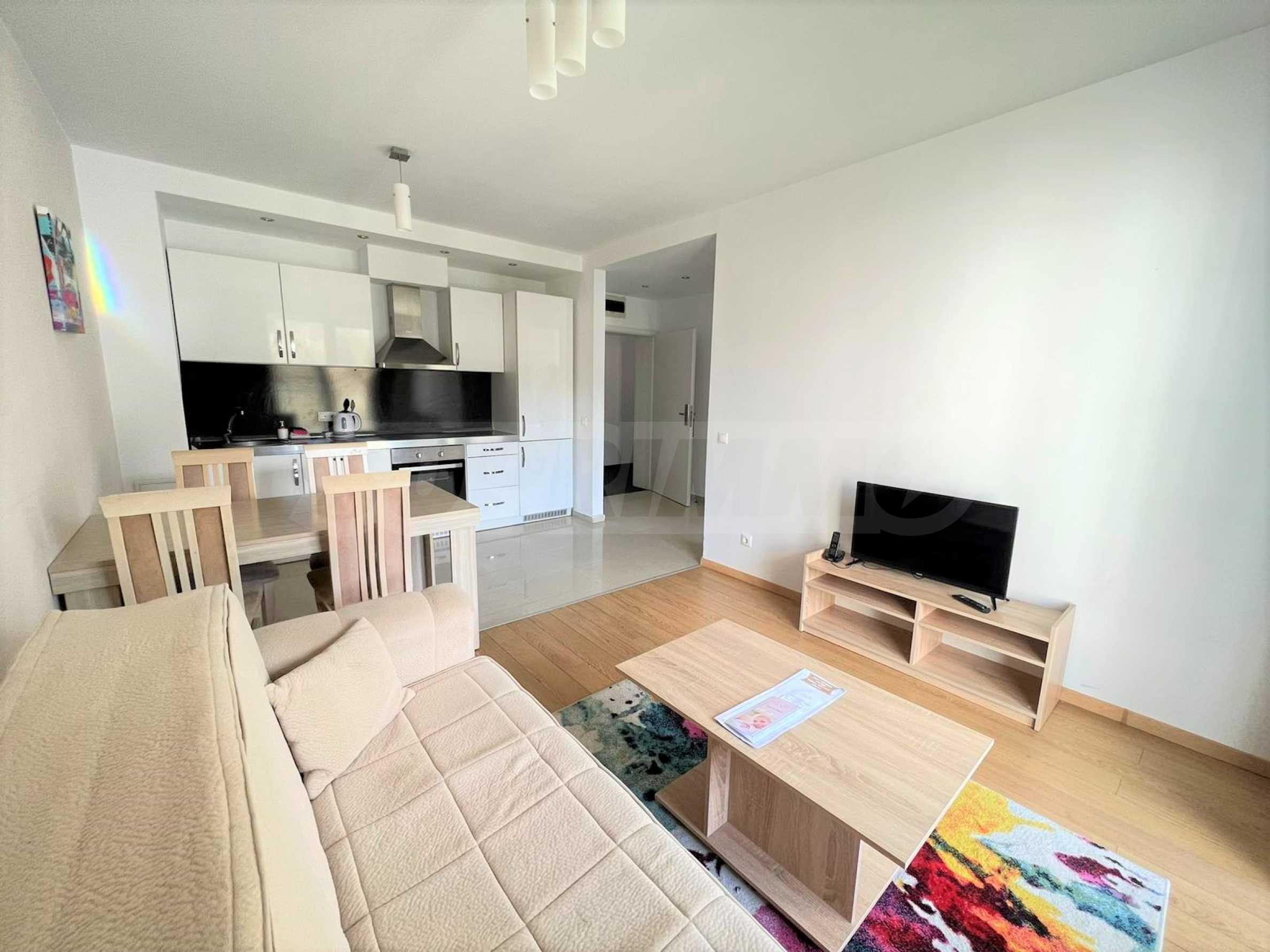 Функционално разпределение от: коридор. просторен хол с два дивана, телевозор, напълно оборудвана кухня с маса за хранене, балкон, голяма спалня, баня с душ кабина и тоалетна;