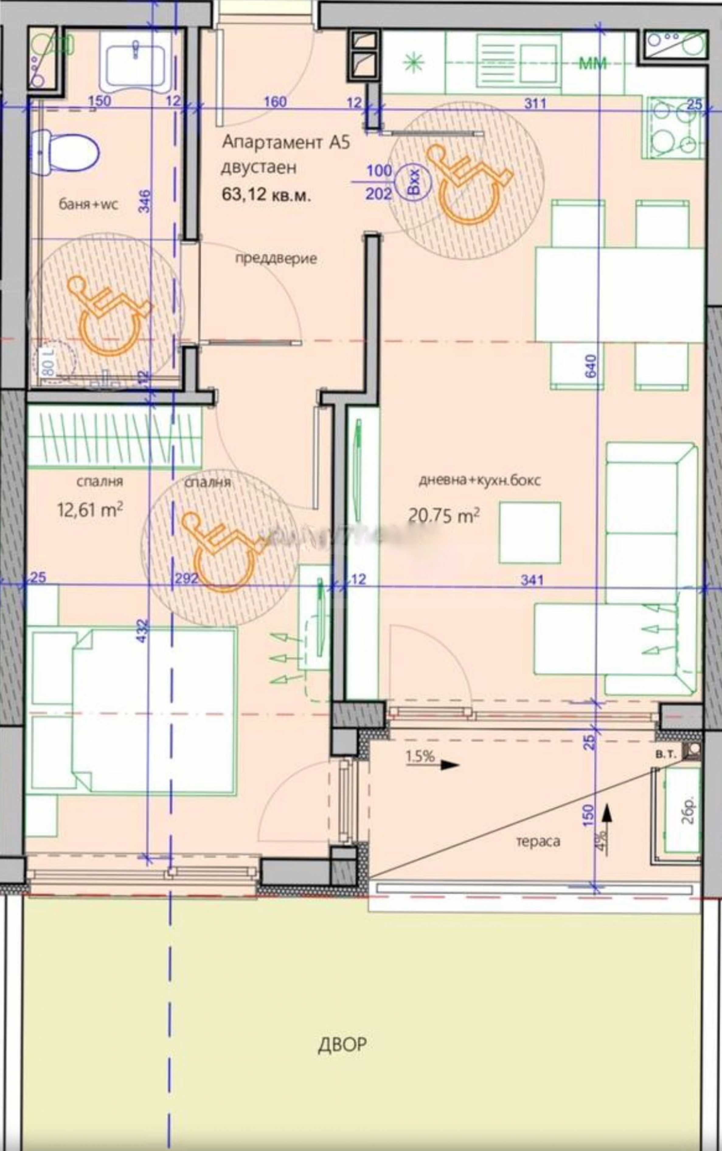 Имотът се намира на 1-ви етаж с изложение юг и изток и с обща площ 63,07 кв. м.