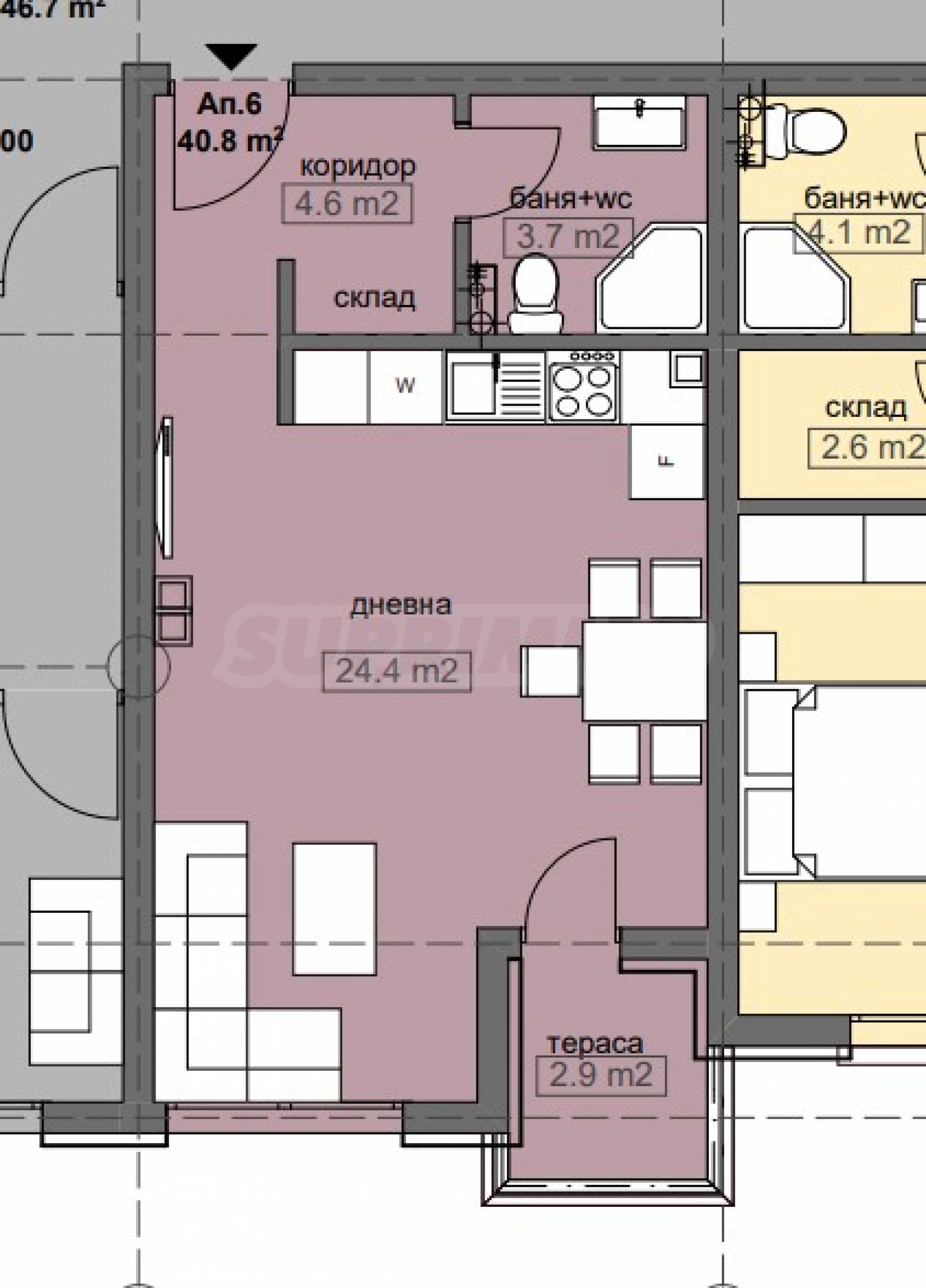Сградата е качествено ново строителство, с първокласни материали, и жилищата се отличават с просторни, комфортни планировки.