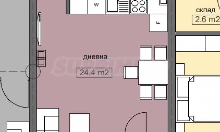 Намира се на първи етаж и има обща площ 52,22 кв.м, състои се от антре, склад, баня/тоалетна, дневна с кухня - 24.4 кв.м и балкон от 2.9 кв.м.