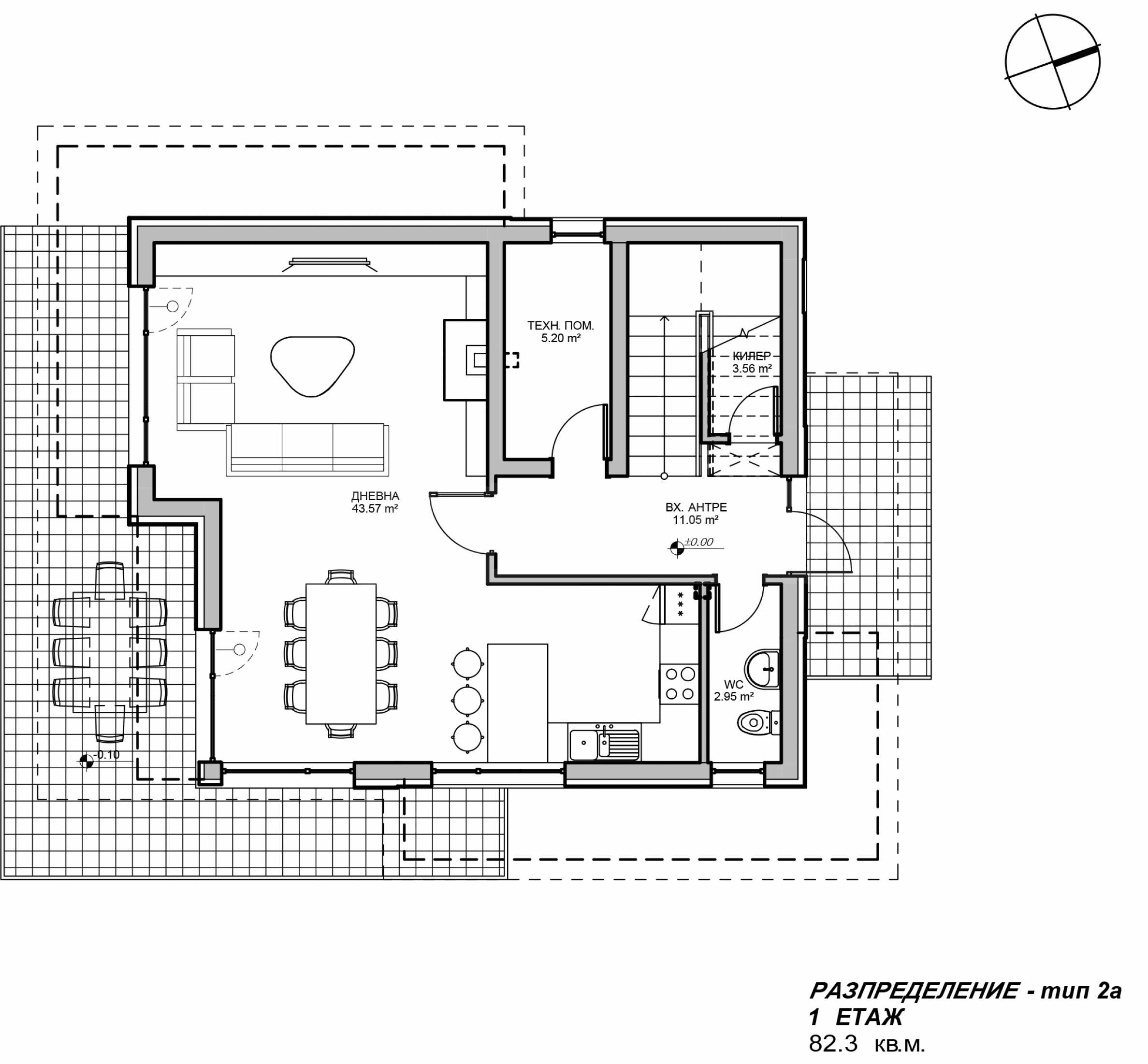 Етаж 1: дневна, баня, антре, техническо помещение, складово помещение