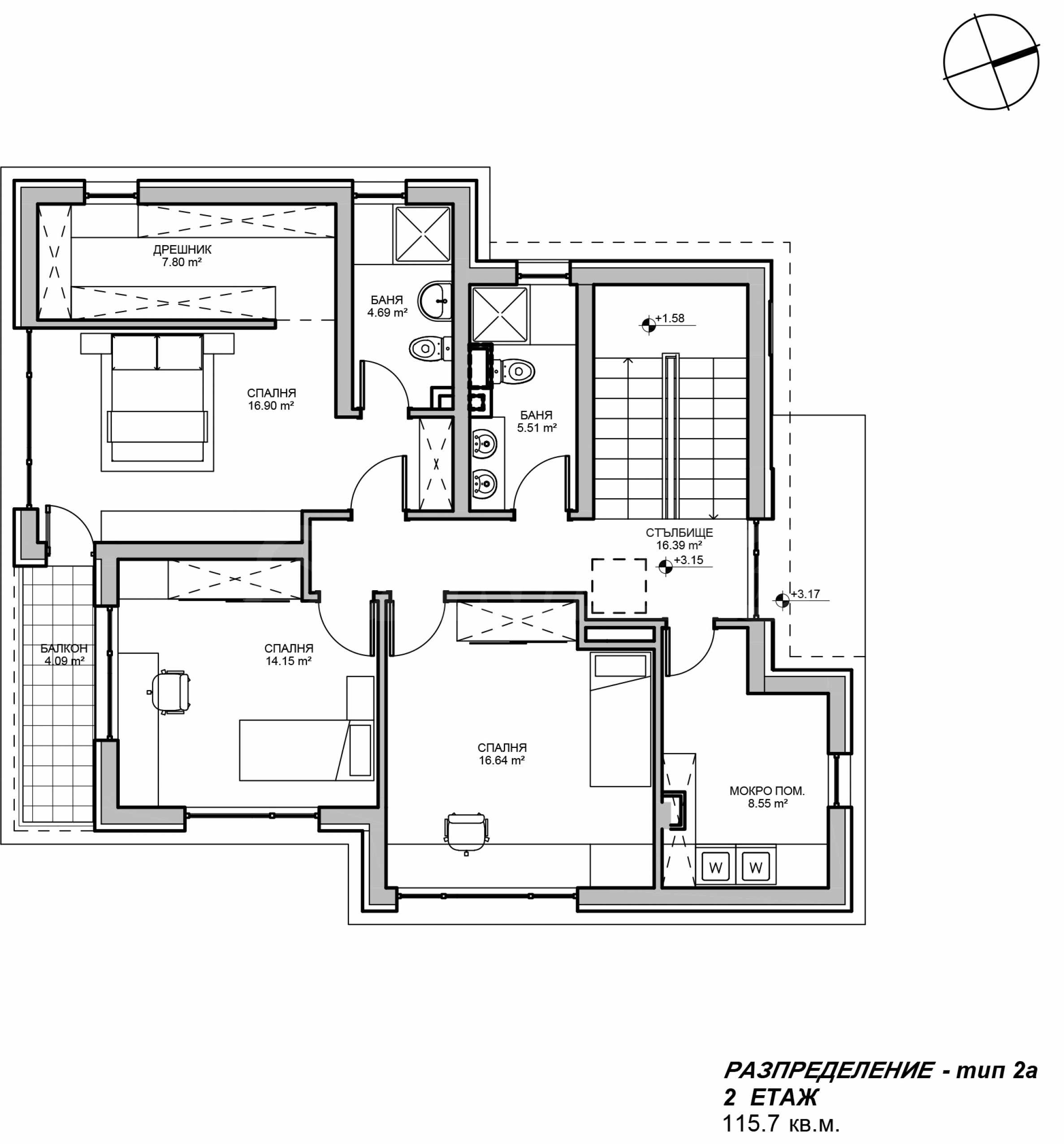 Етаж 2: три спални, две бани, дрешник, балкон, мокро помещение