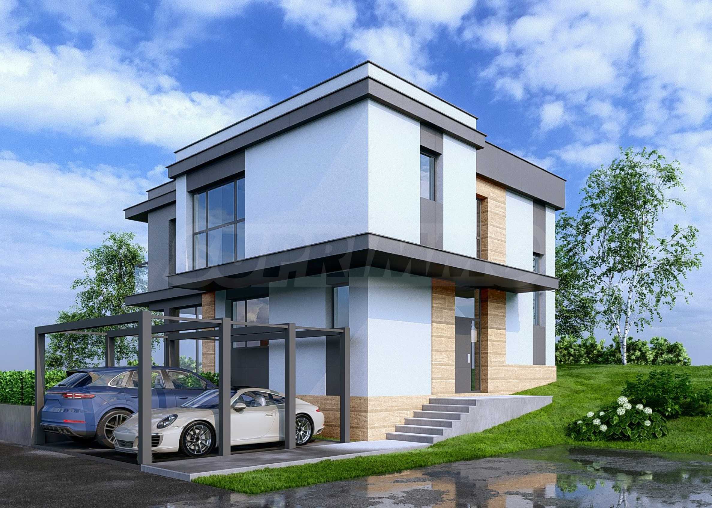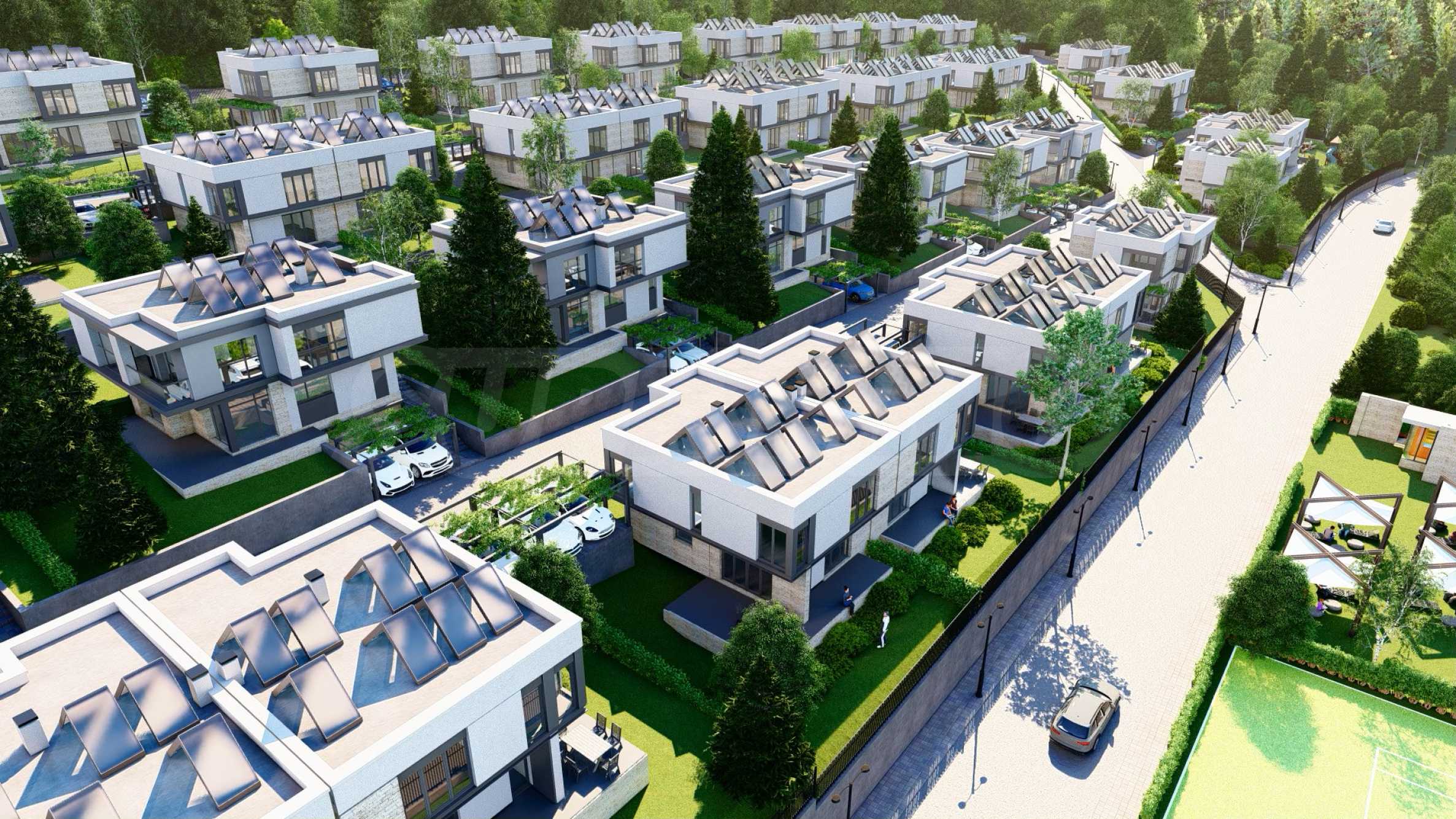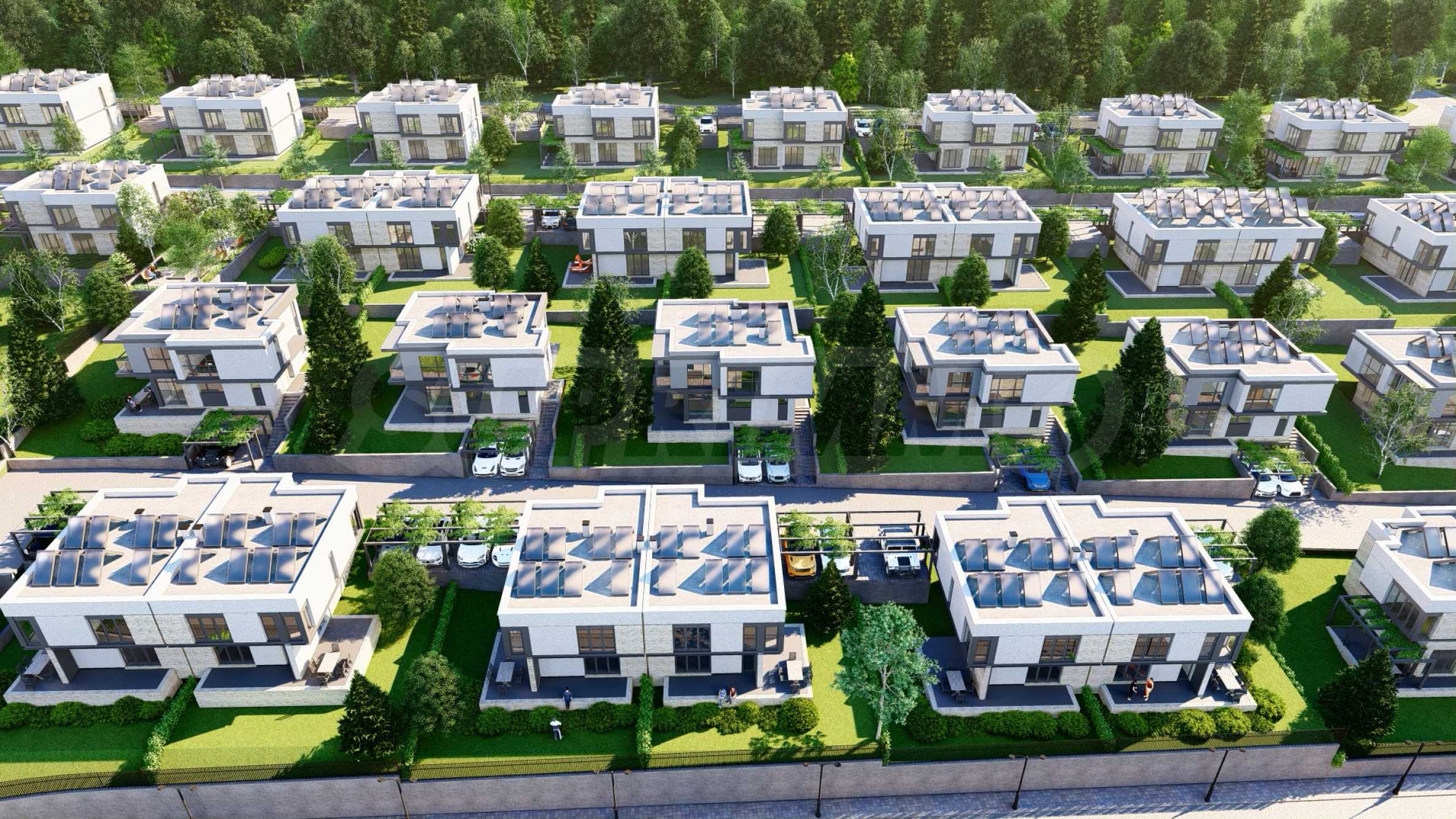 Къщите в комплекса са проектирани на два етажа в модерен изчистен стил и разполагат със собствен двор до 600 кв.м, който е идеален за релаксация или за дружески събирания на открито. Строителството е с висок клас материали и с изключителна прецизност и внимание към детайла. Уникалността на терена и разположението на отделните къщи осигуряват панорамна и успокояваща гледка на всеки имот.