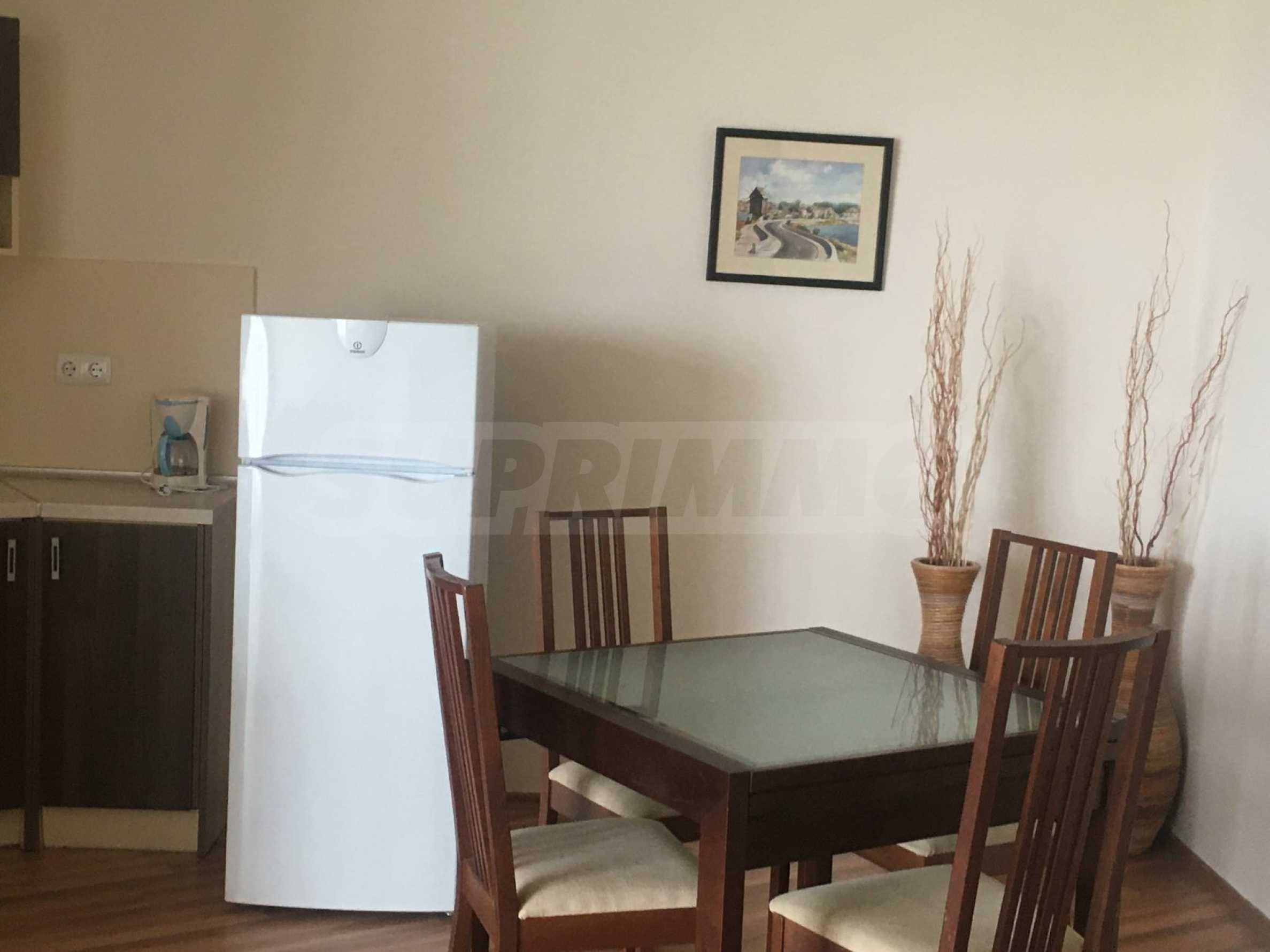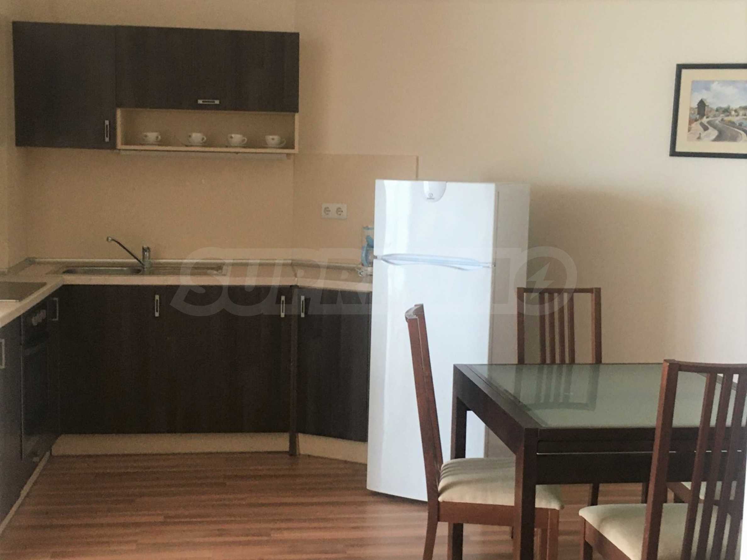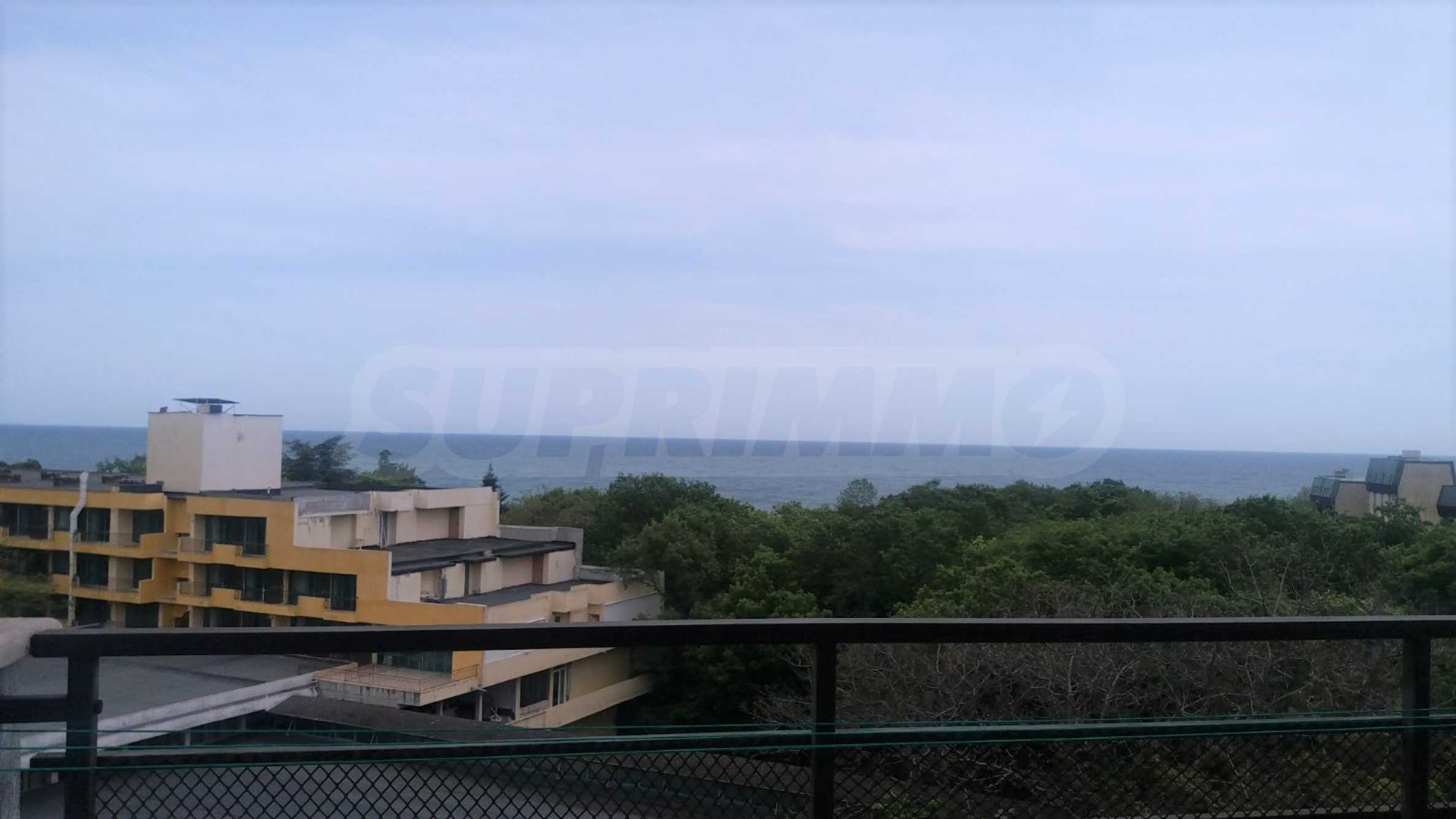 Намира се на 5-и етаж и има обширна тераса с приятна гледка към зеленината на курорта и морето. Панорамата е фронтална, терасата е прекрасно място за отдих на открито.