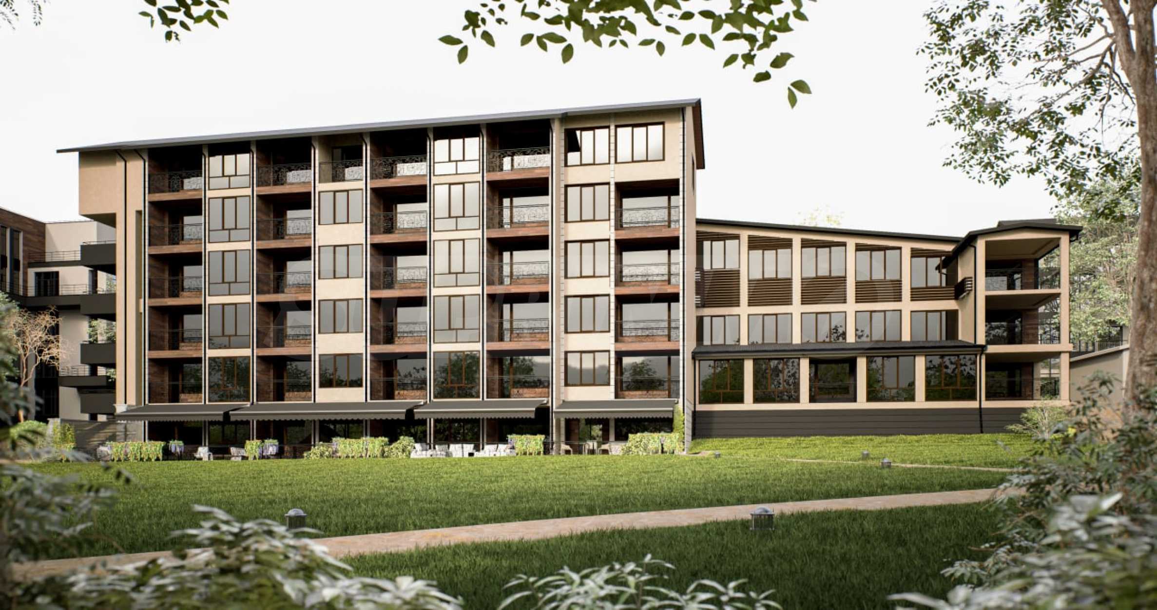 Сградата е разпределена на 6 етажа, намира се в затворена територия с денонощна охрана. Целият комплекс е заобиколен от дъбова гора, с езерото в гората, с отлични възможности за активен отдих сред природата, с различни места за почивки с пейки, беседки и зони за барбекю.