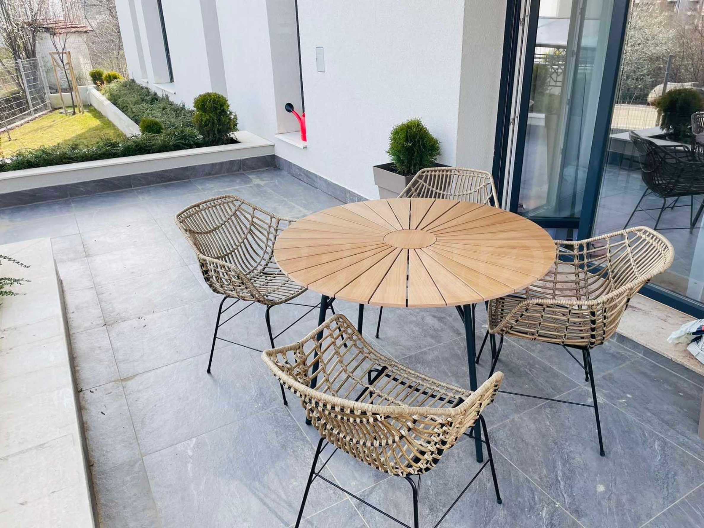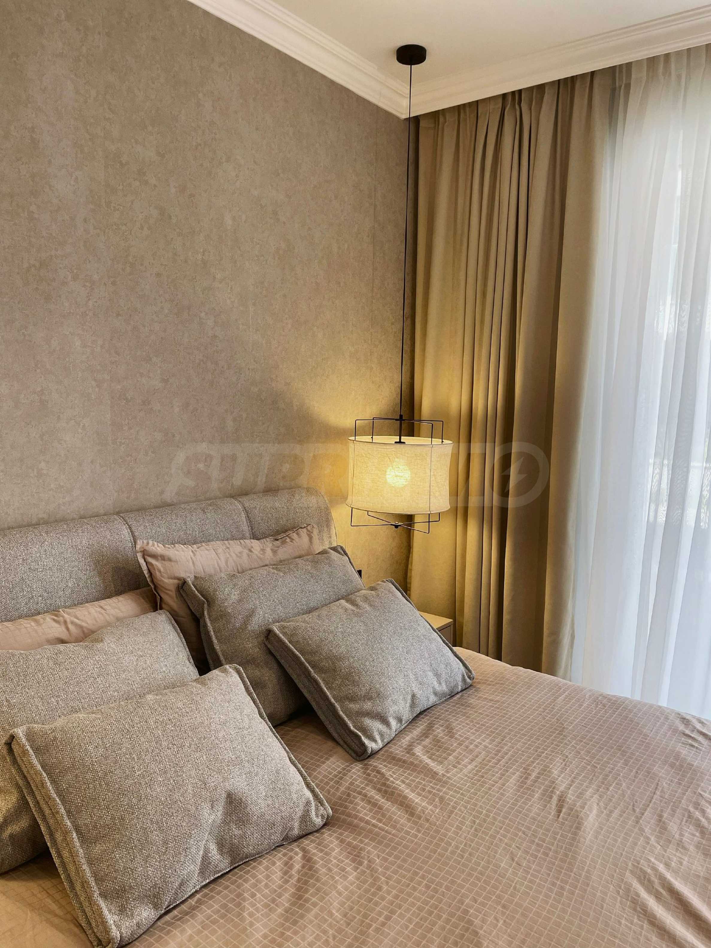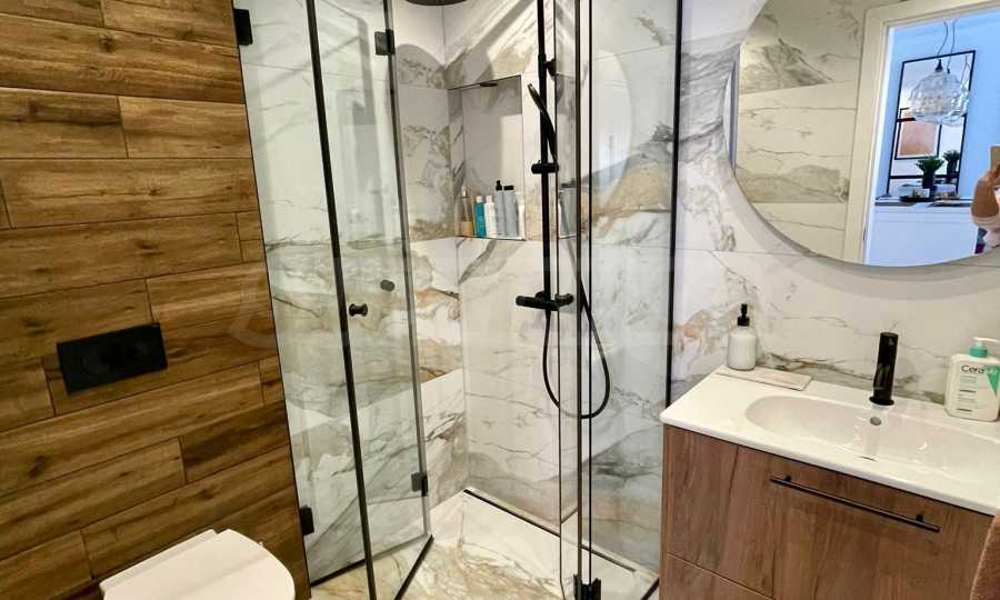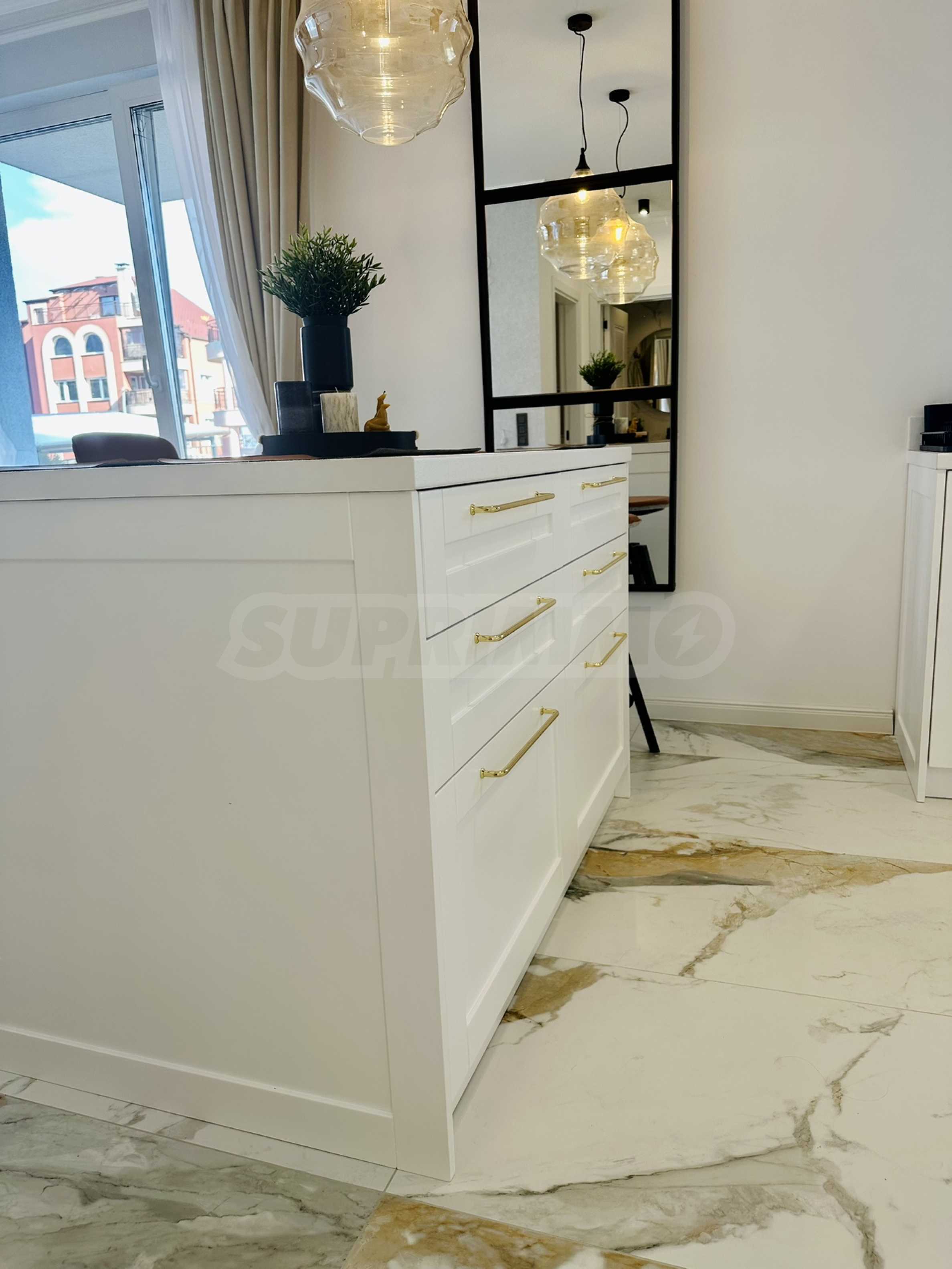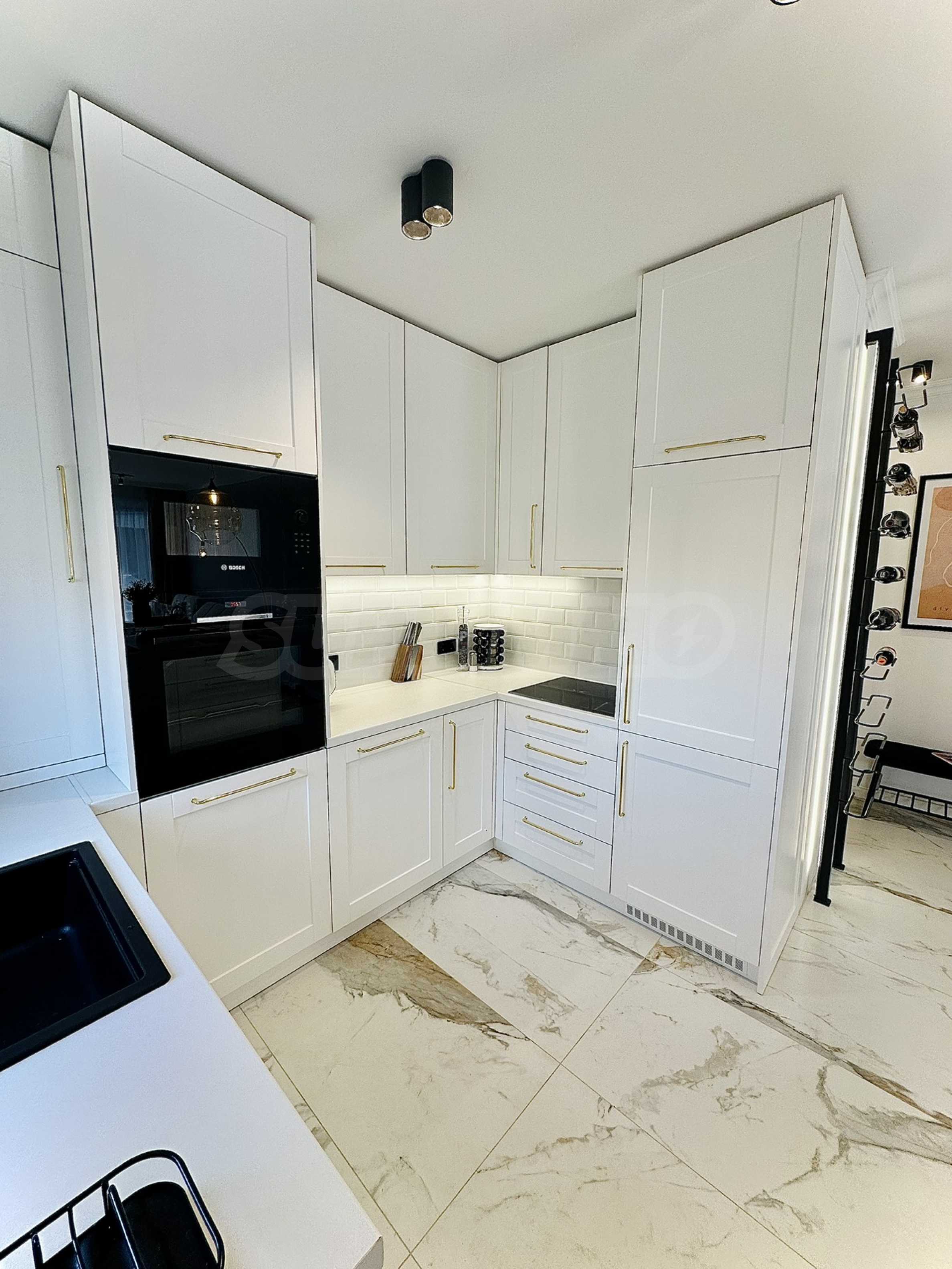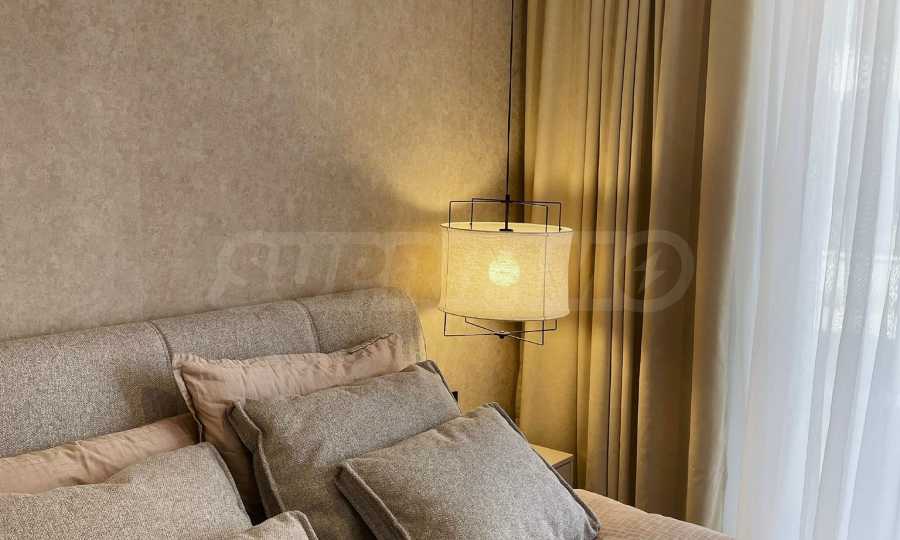 Жилището е завършено по индивидуален дизайнерски проект, като е заложено на изчистени линии, меки тонове и удобни функционални решения. Обзаведено е с модерни мебели, оборудването е от висок клас - котлони Bosch, миялна машина Bosch, печка Bosch, пералня AEG, сушилня AEG, климатик Fujitsu General, телевизор LG, а за допълнителен комфорт и уют във всекидневната е вградена камина на биоетанол. Отоплението е на газ , има монтирани климатици и бойлер. За желана и равномерна топлина апартамента е с подово отопление във всички помещения . За по-голяма сигурност ,защита от топлина студ и шум жилището е с монтирани външни ролетни щори.