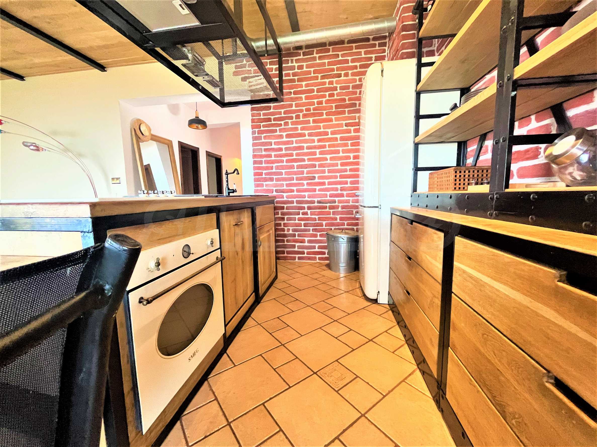 - първи жилищен етаж - просторна и светла дневна с кухня (от естествено дърво с висок клас уреди SMEG), голяма веранда с прекрасни гледки към залива, спалня, мокро помещение;