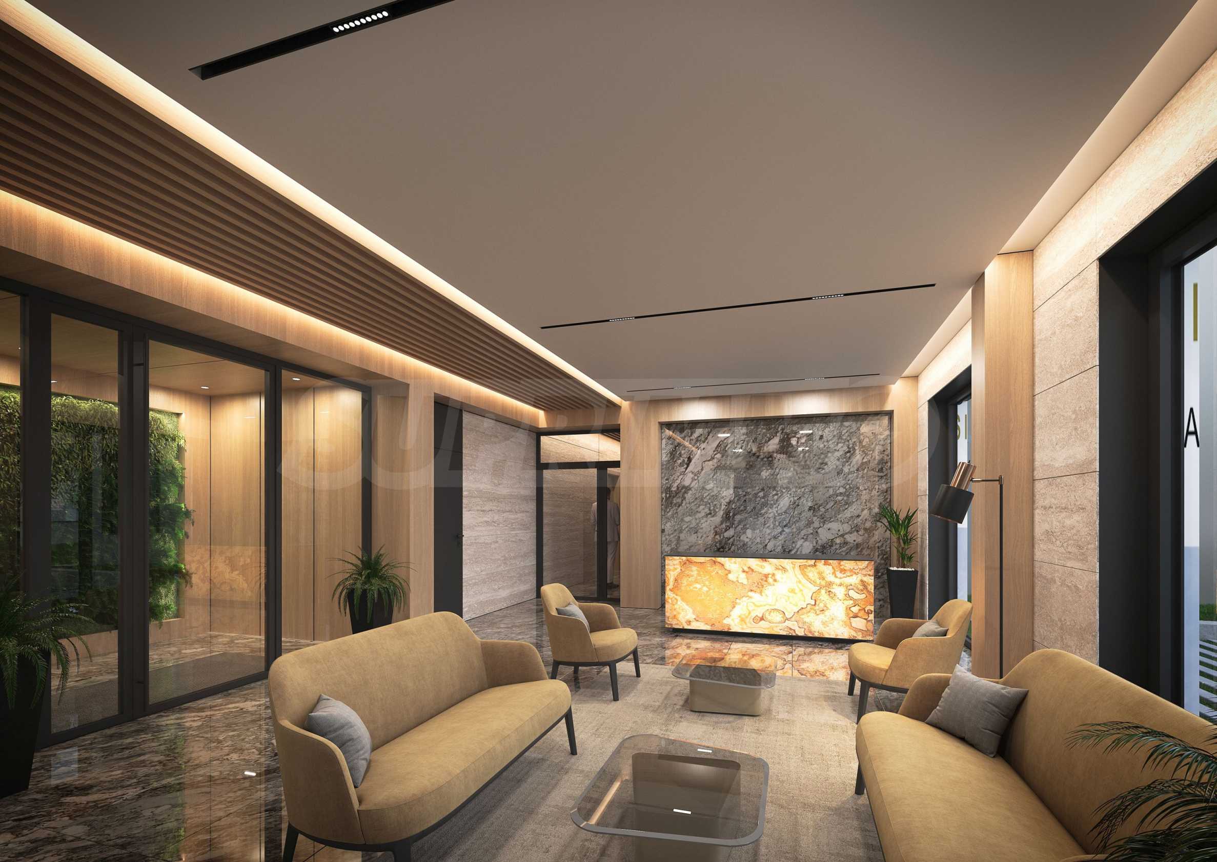 - общи части с луксозни естествени камъни, парапет по индивидуален проект, дизайнерско осветление, просторна рецепция с портиер и зона с мека мебел;