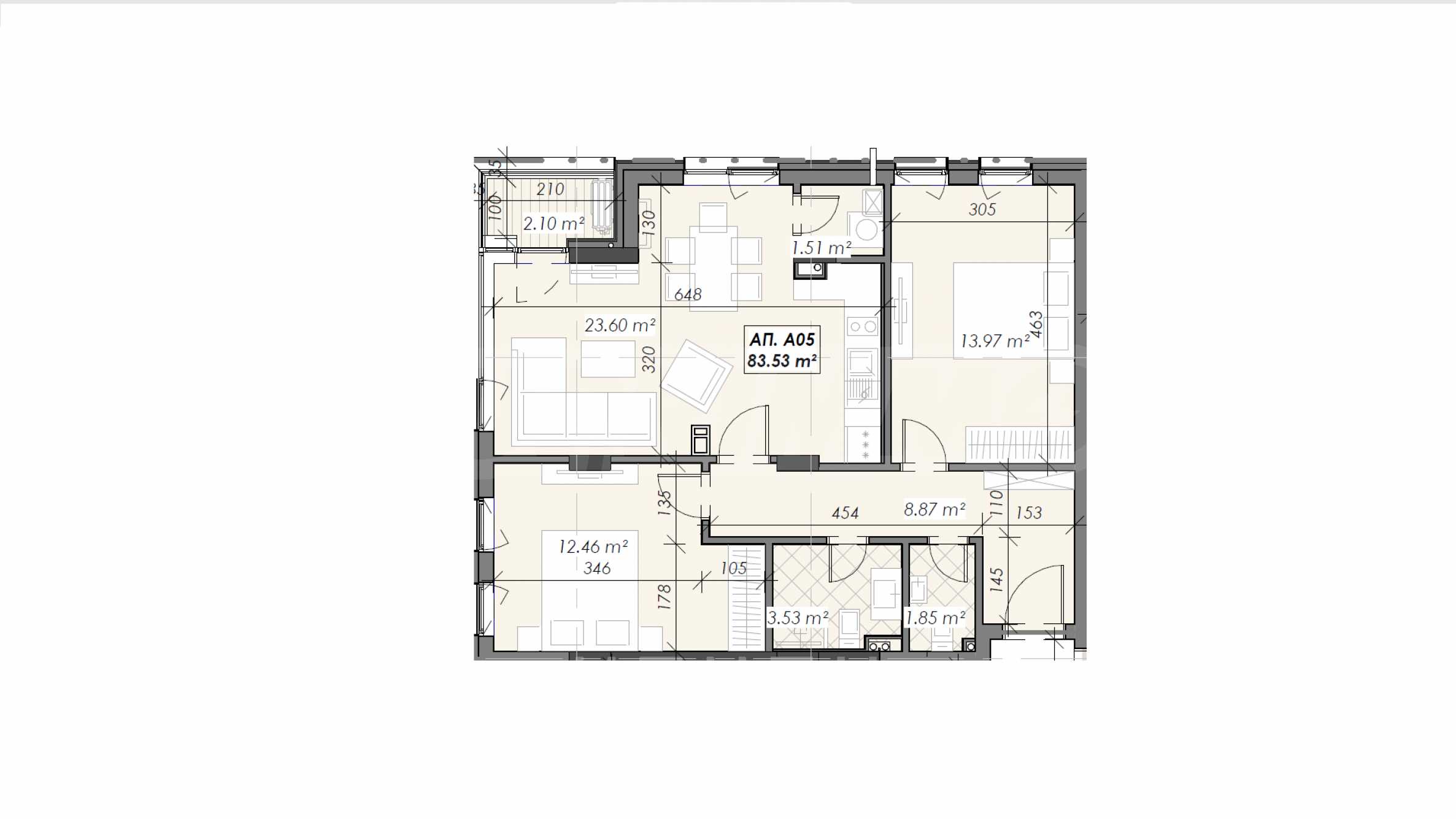 Имотът е разположен на втори етаж от общо 6 и предлага 97.07 кв.м обща площ, разпределена в антре, всекидневна с кухненски бокс и излаз на тераса, две спални, баня с тоалетна, тоалетна.