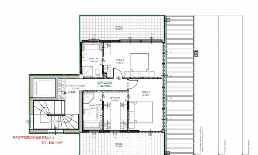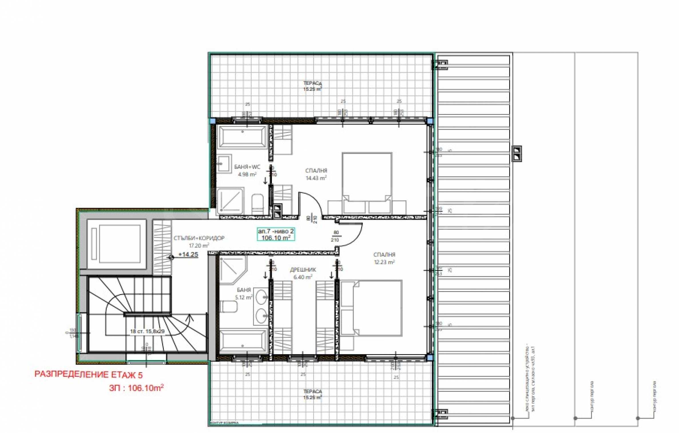 Кокетната сграда е проектирана на пет нива с подземен гараж и предлага лимитиран брой комфортни жилища с една, две и три спални: 1 двустаен, 4 тристайни, 1 четиристаен, 1 пентхаус.