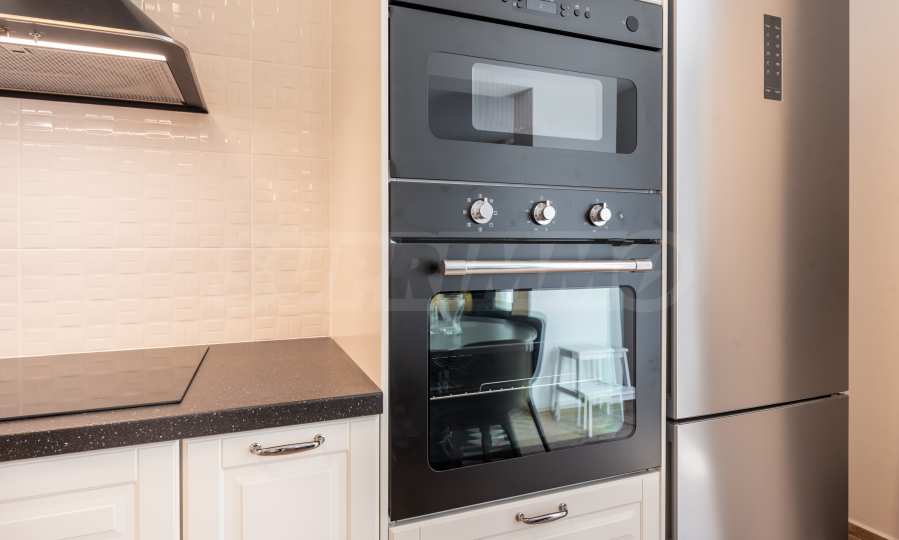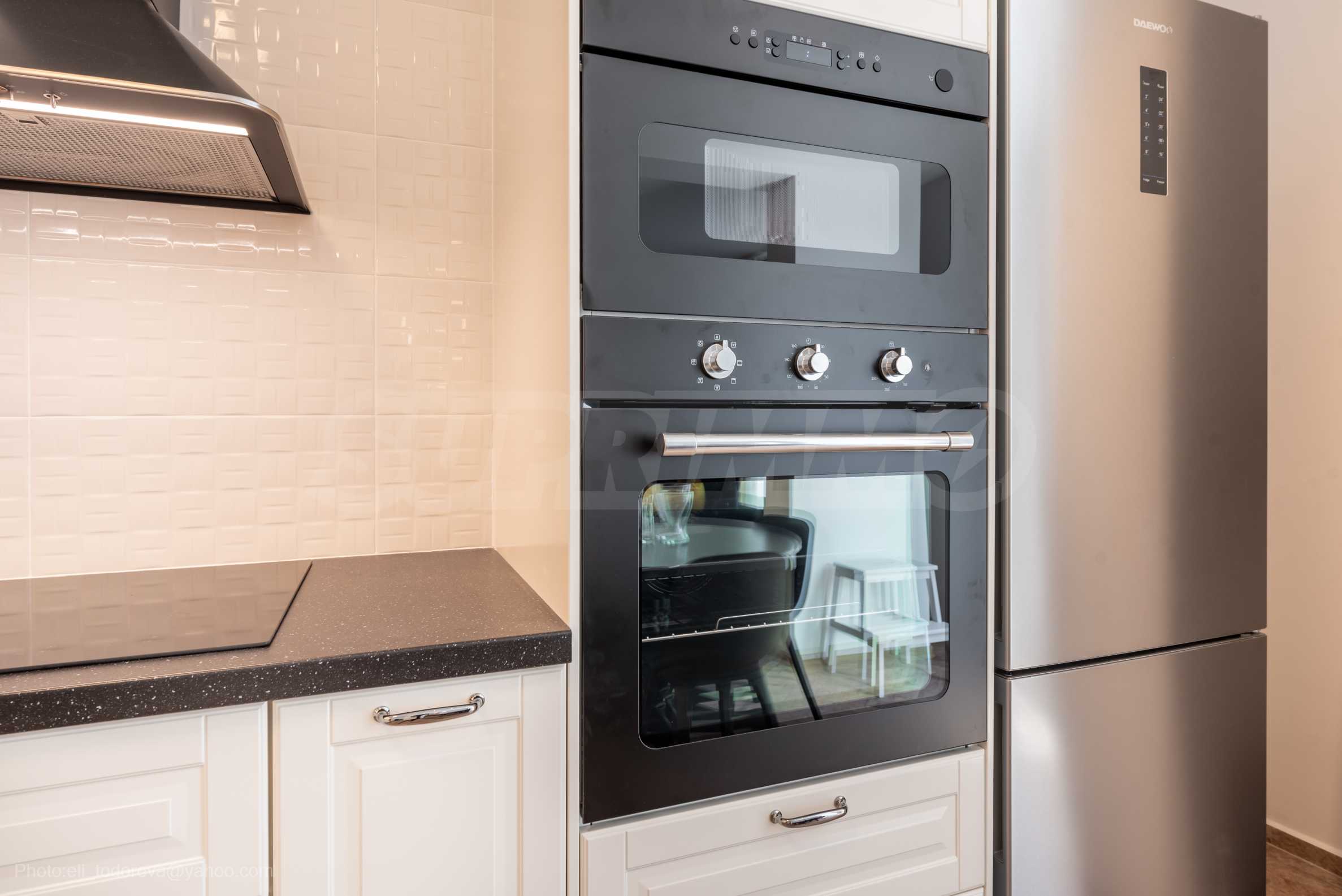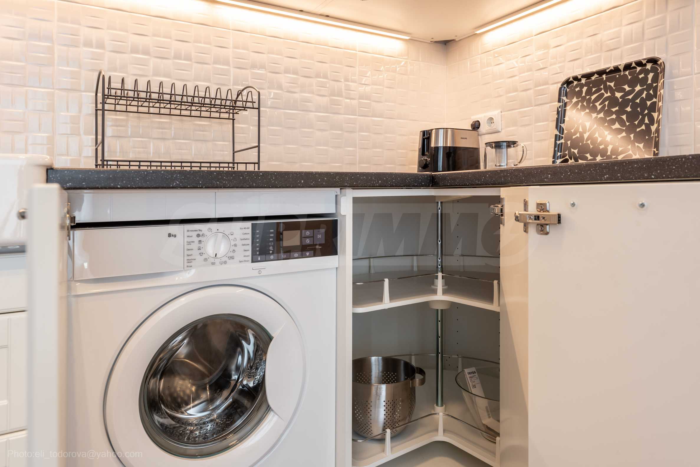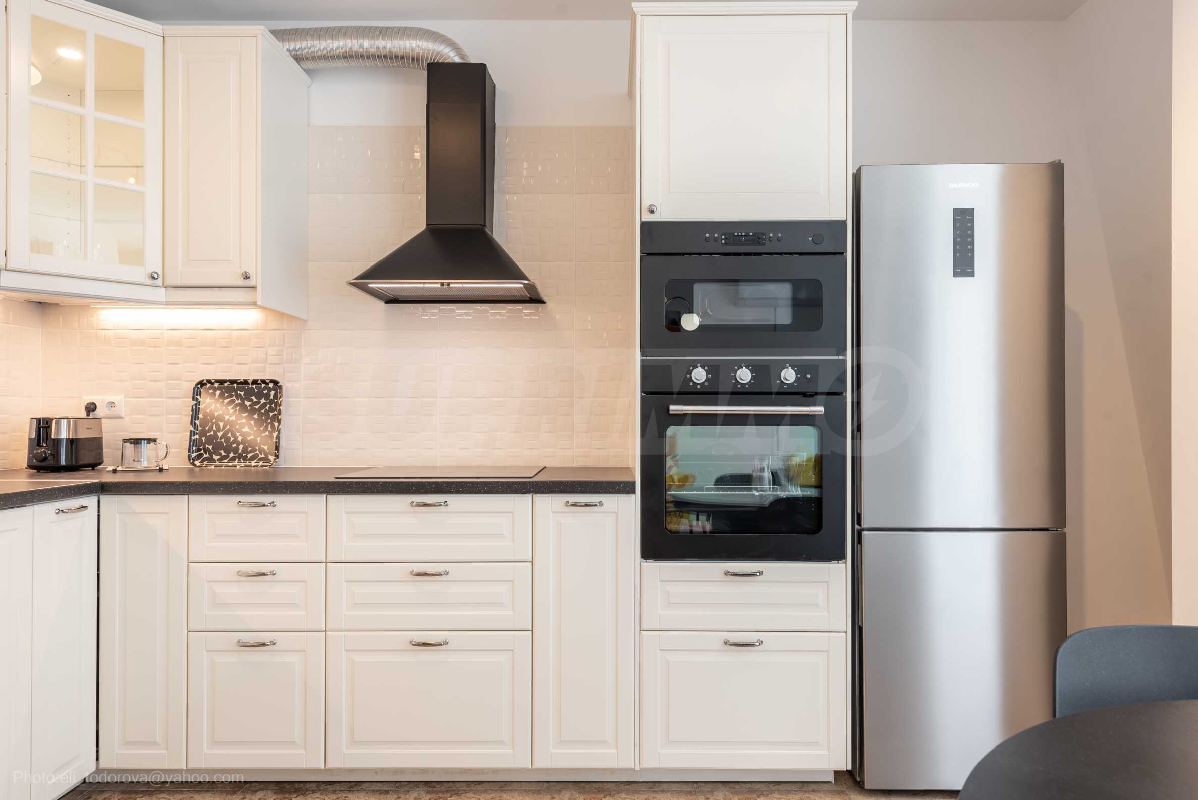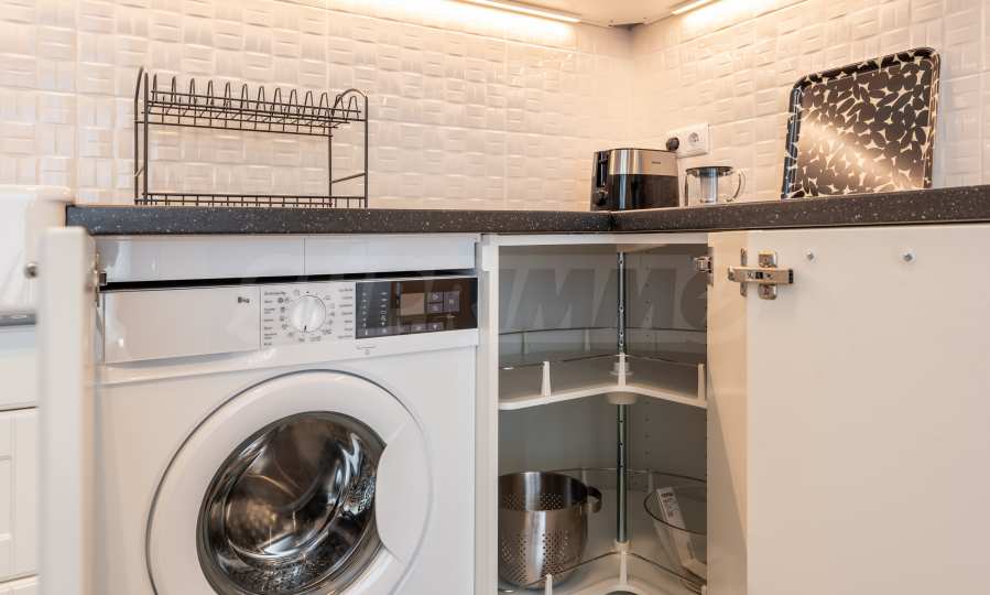 Оборудването в кухнята включва стъклокерамичен котлон, фурна, хладилник, аспиратор, миялна машина, пералня, кафемашина, термокана и посуда.