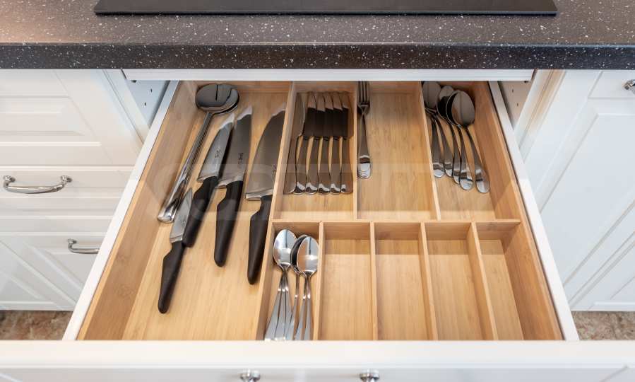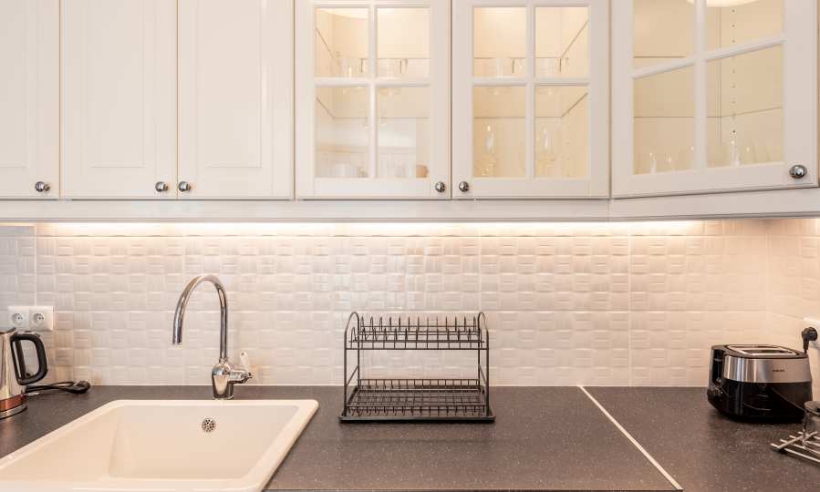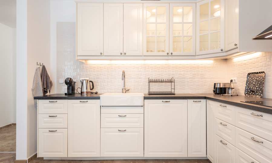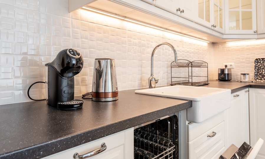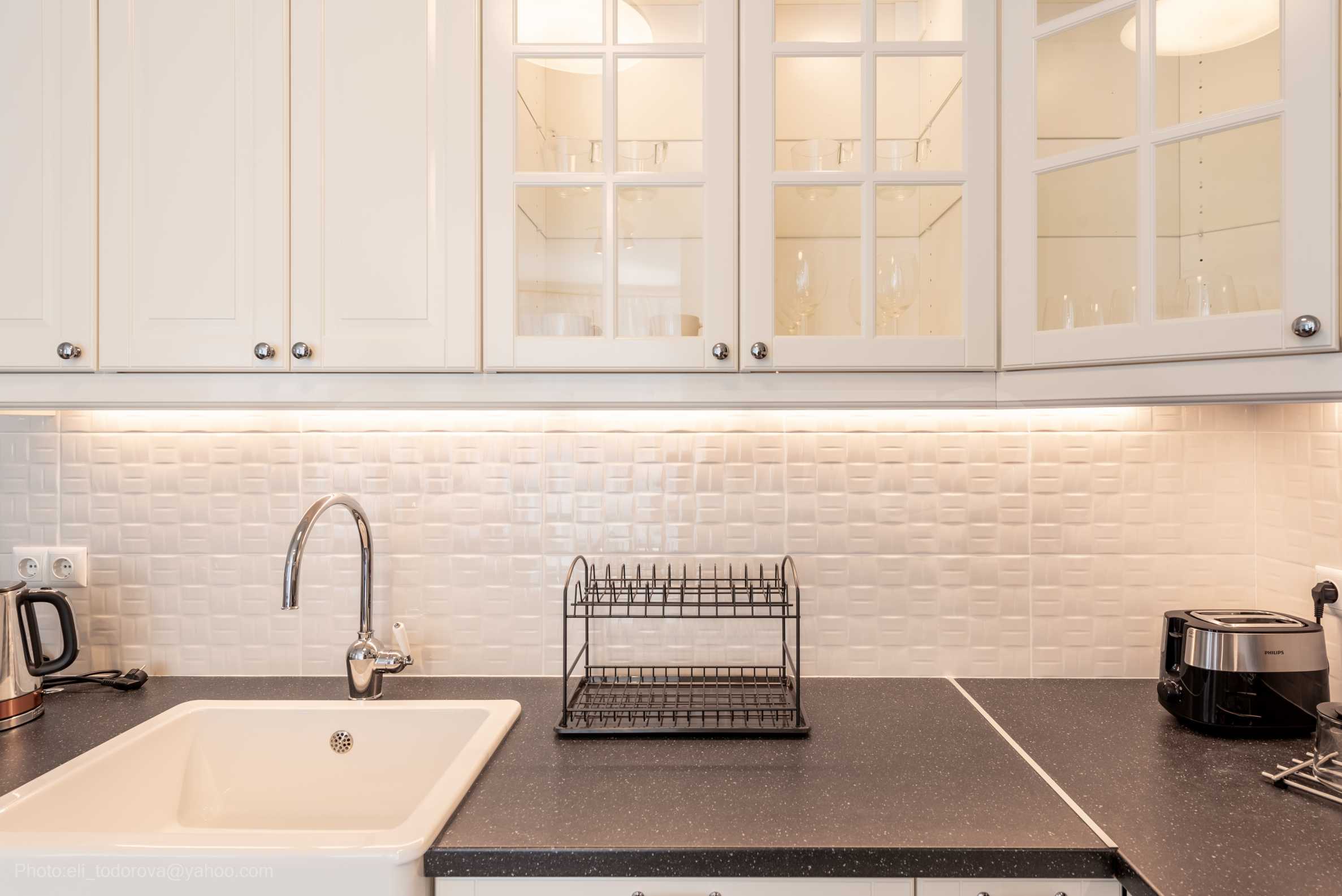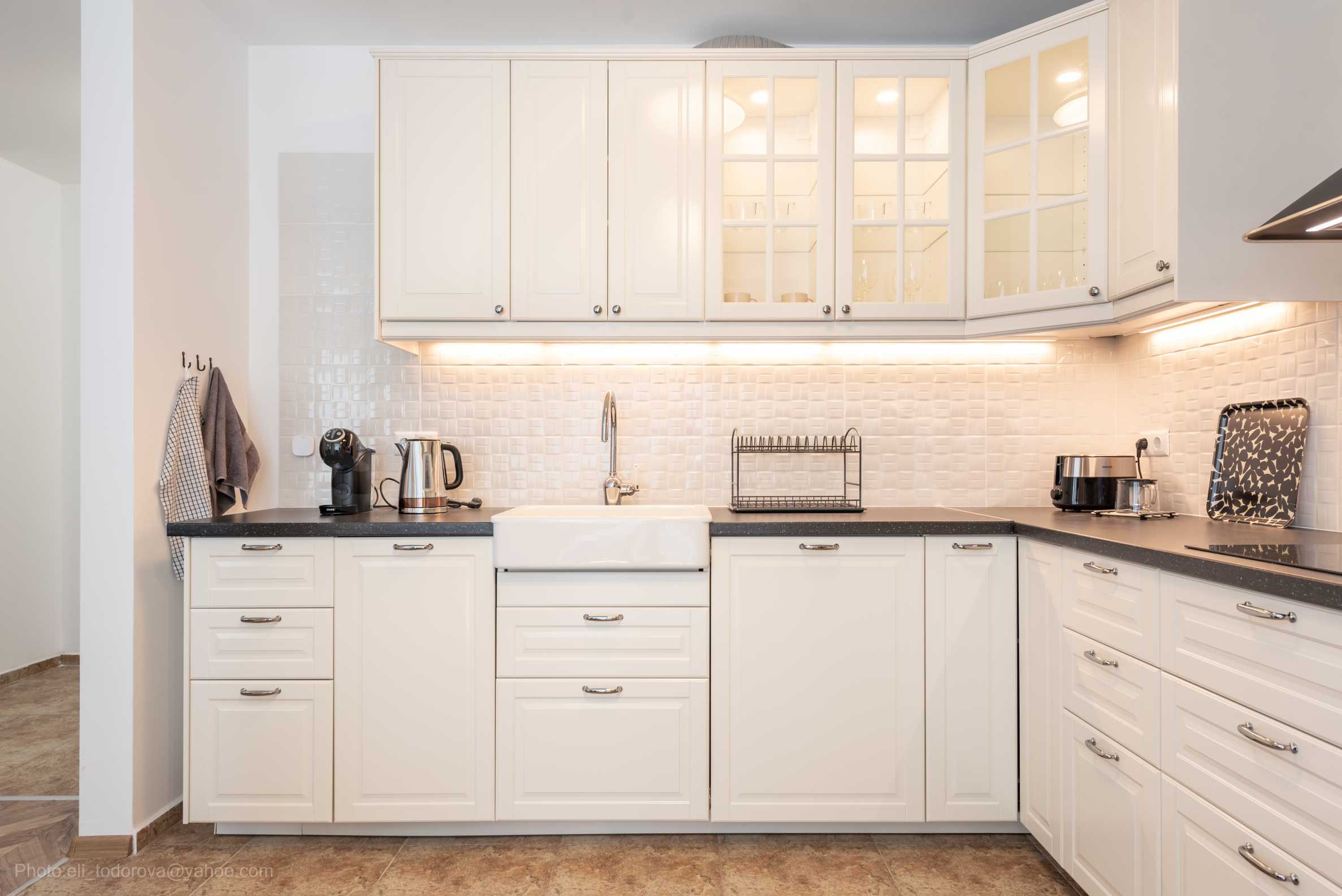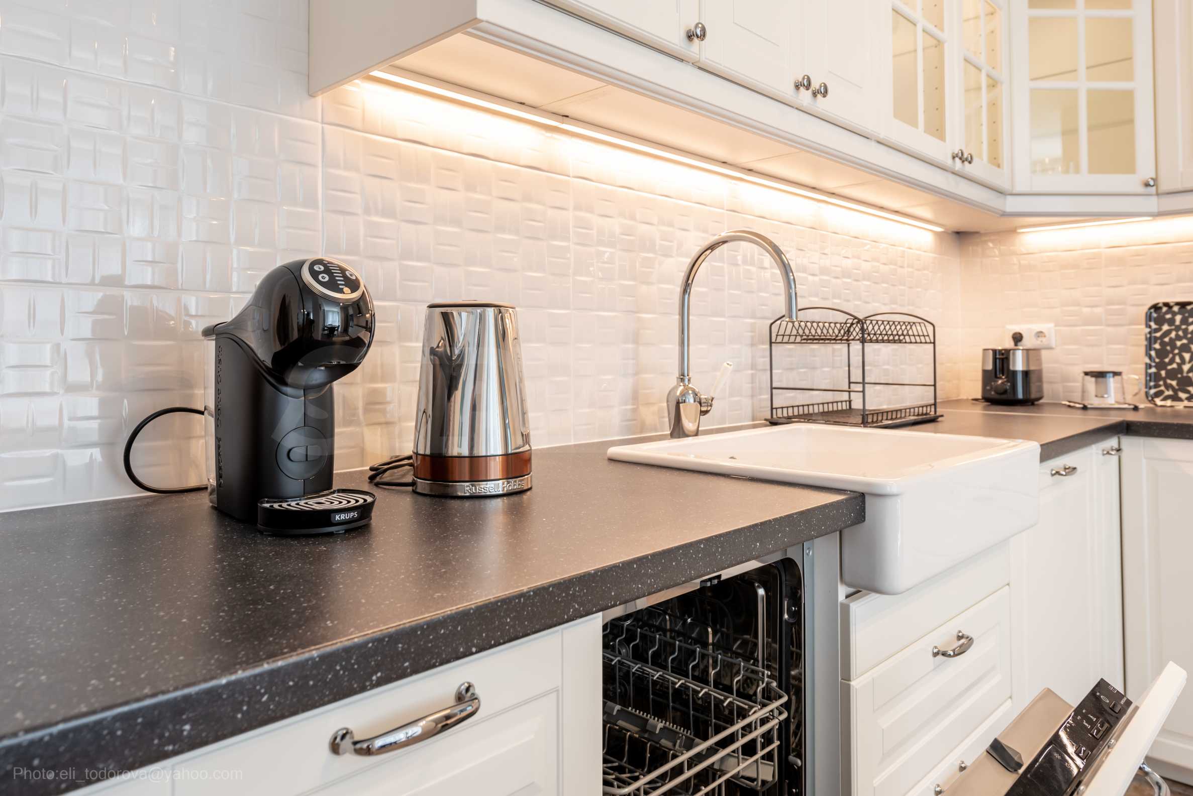 Оборудването в кухнята включва стъклокерамичен котлон, фурна, хладилник, аспиратор, миялна машина, пералня, кафемашина, термокана и посуда.
