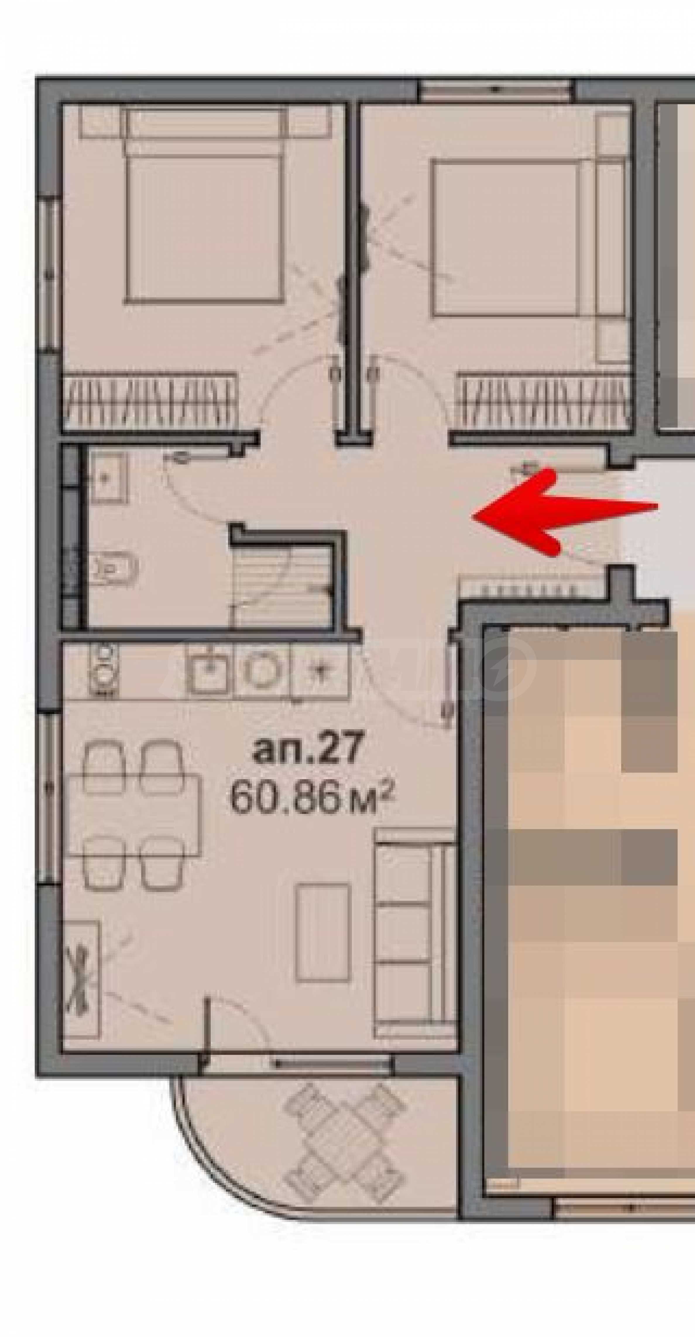 Имотът се намира на 2-ри етаж и се състои от дневна, зона за кухня, две спални, баня/тоалетна, прекрасна тераса с гледка към басейна.