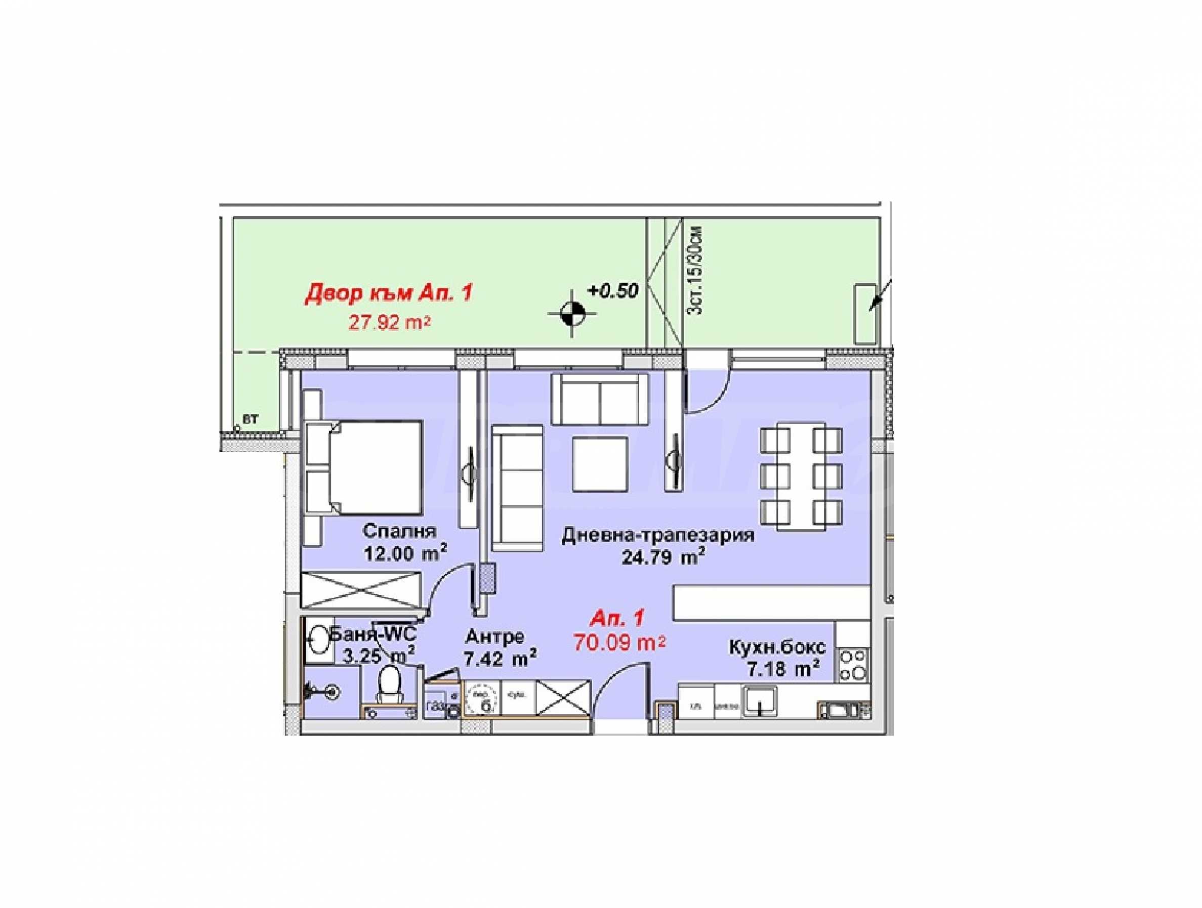 Жилището е ситуирано на ниво партер и предлага 70.09 кв.м обща площ и 27.92 кв.м двор. Състои се от антре, всекидневна с кухненска част, спалня, баня с тоалетна.