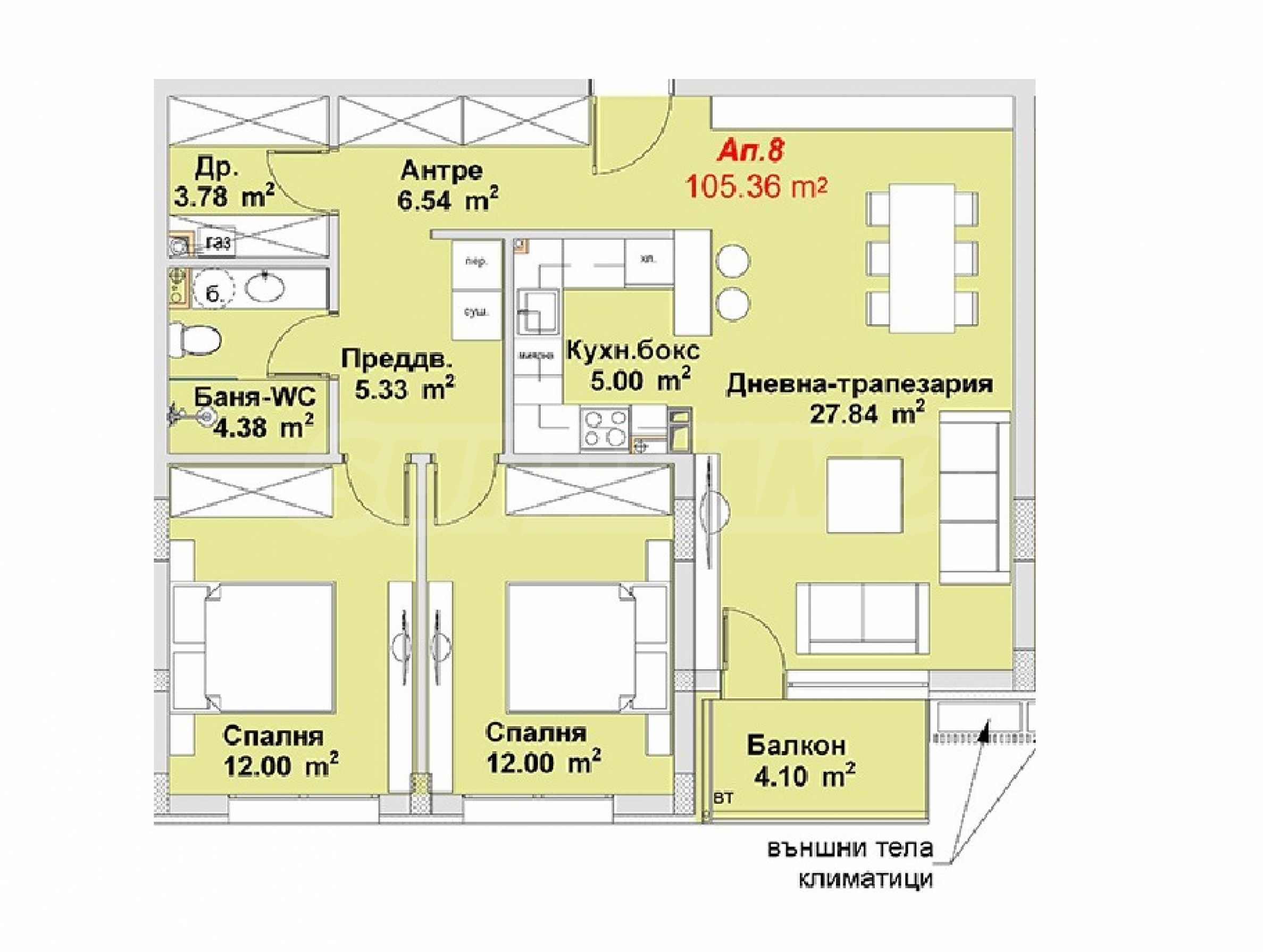 Жилището е ситуирано на вори етаж над партер и предлага 103.36 кв.м обща площ. Състои се от антре, всекидневна с кухня, две спални, баня с тоалетна, балкон.