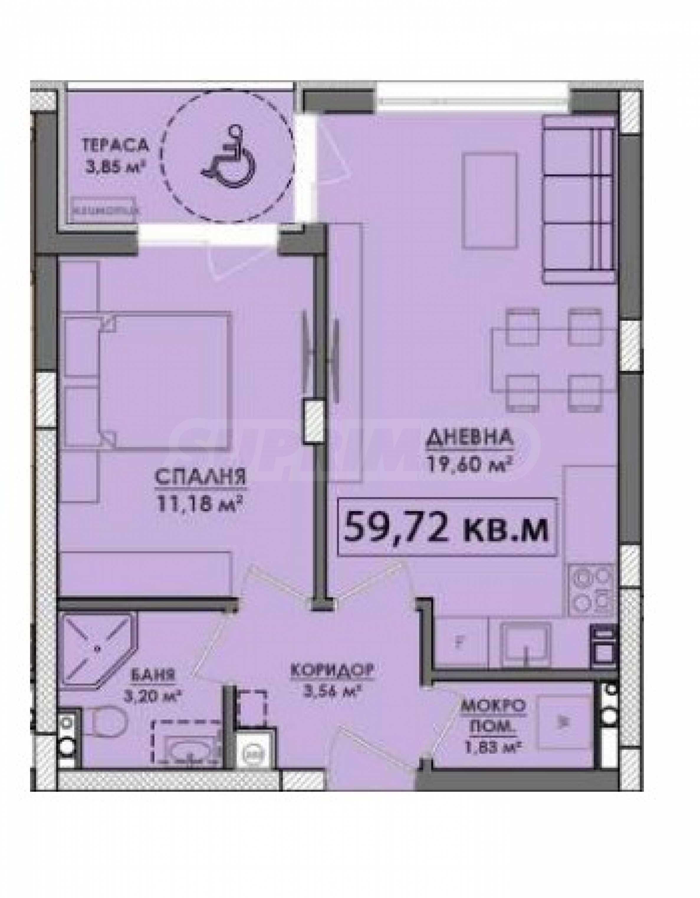 Имотът с обща площ от 59.72 кв.м е разположен на 3-ти етаж и се състои от коридор, баня с тоалетна, мокро помещение, дневна/кухня - 19.60 кв.м, една спалня - 11.18 кв.м, тераса - 3.85 кв.м.
