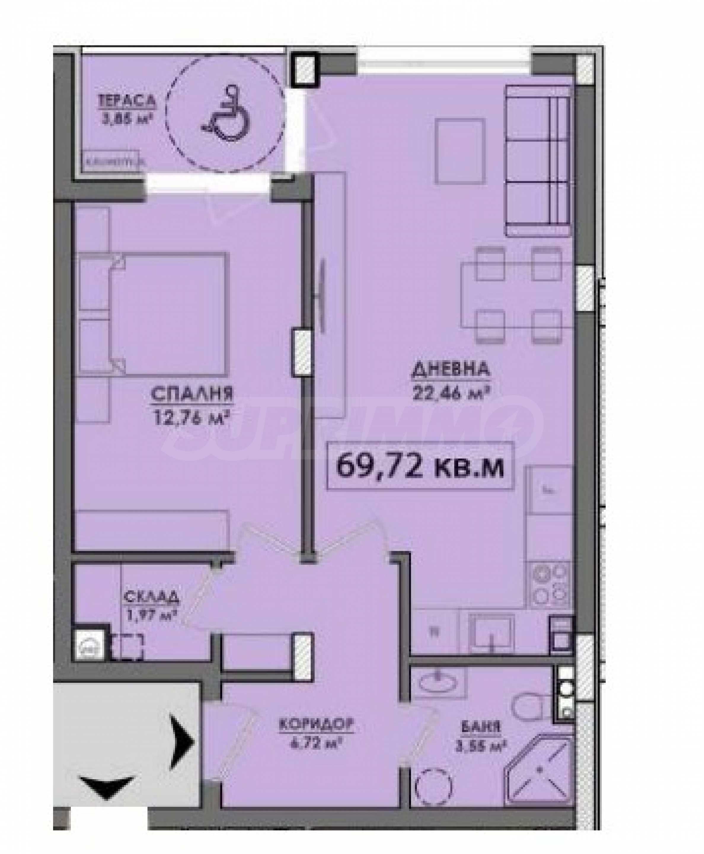 Имотът с обща площ от 69.72 кв.м е разположен на 5-и етаж и се състои от коридор, баня с тоалетна, мокро помещение, дневна/кухня - 22.46 кв.м, една спалня - 12.76 кв.м, тераса - 3.85 кв.м.