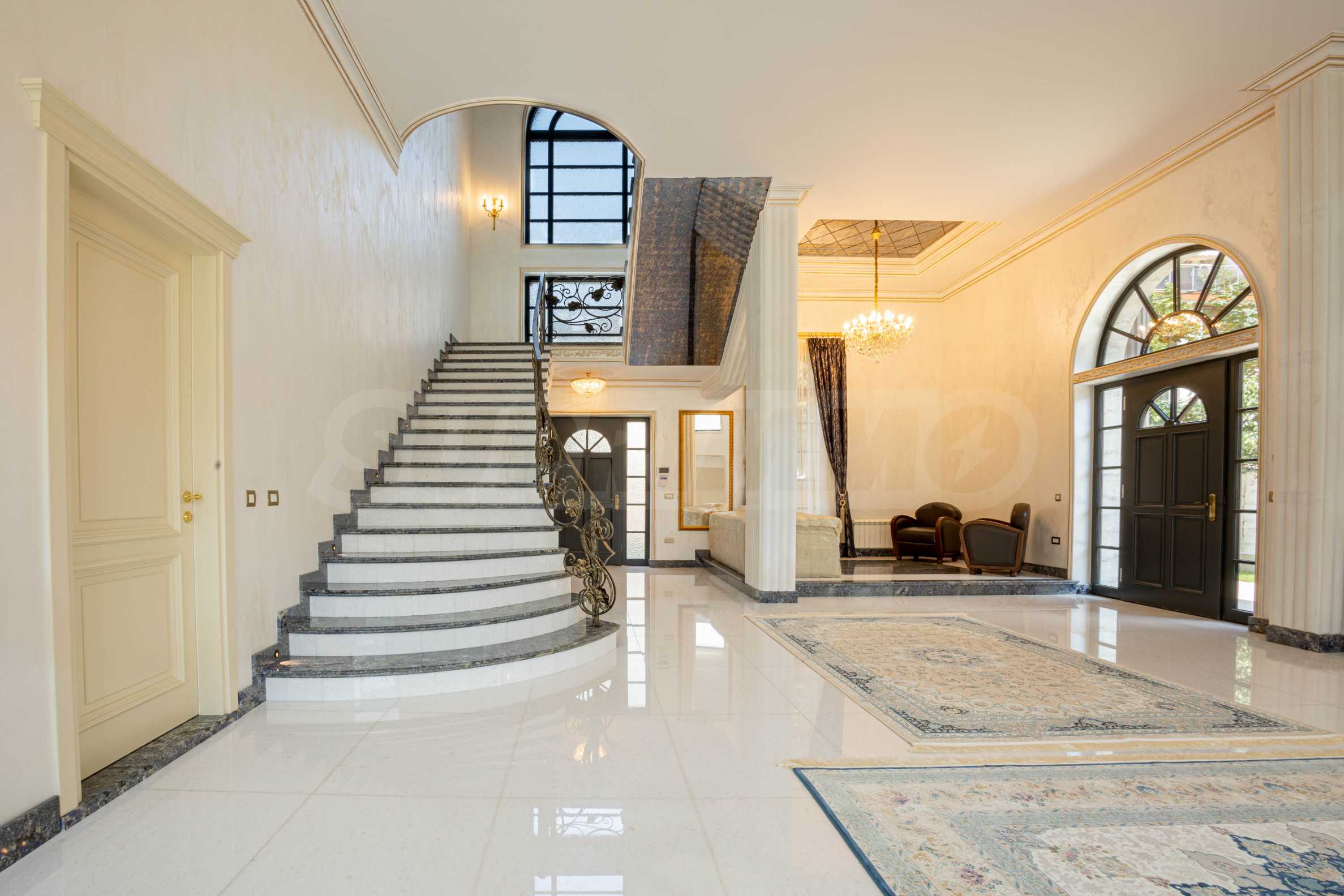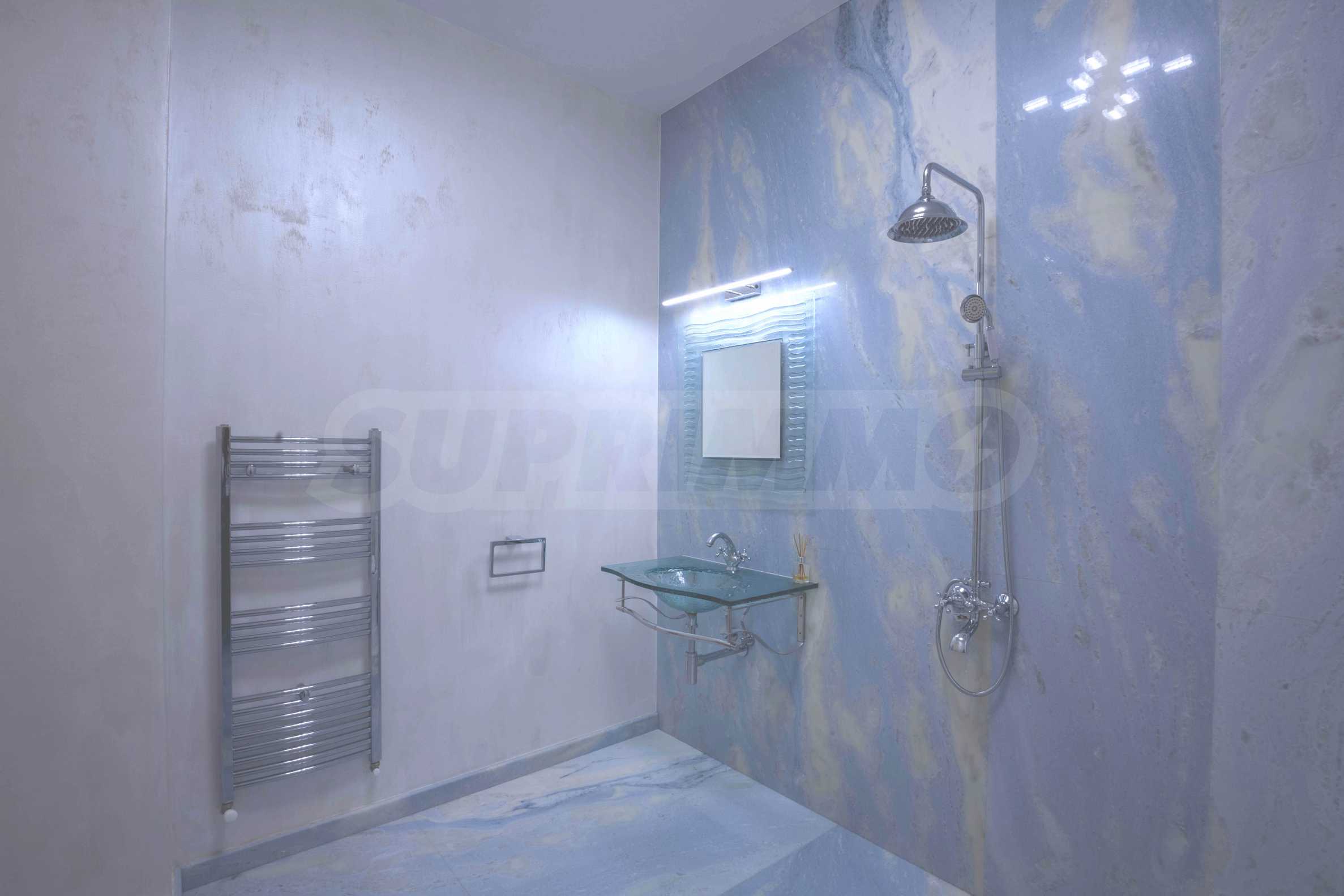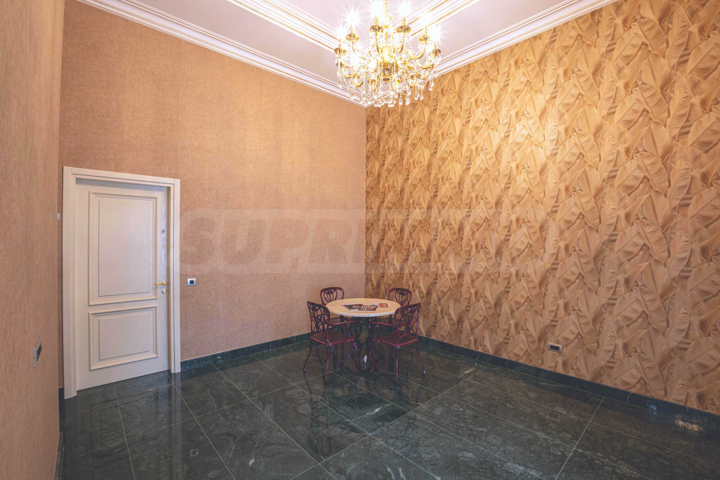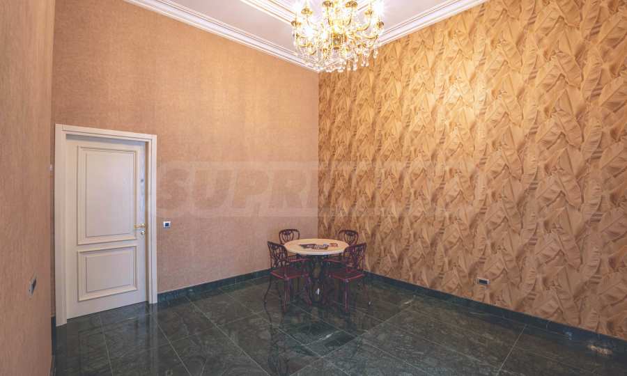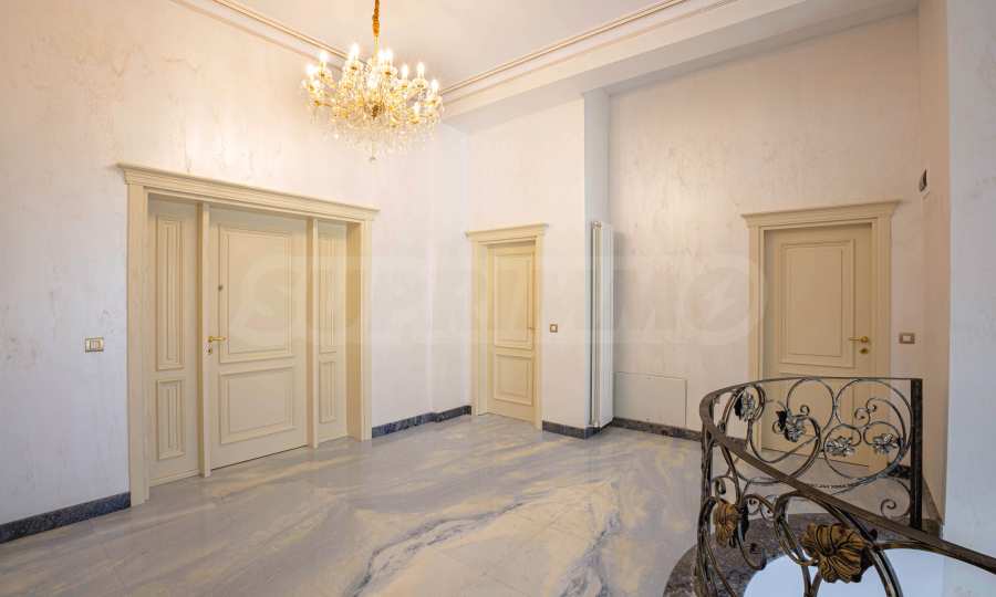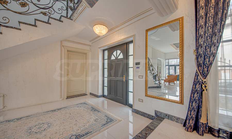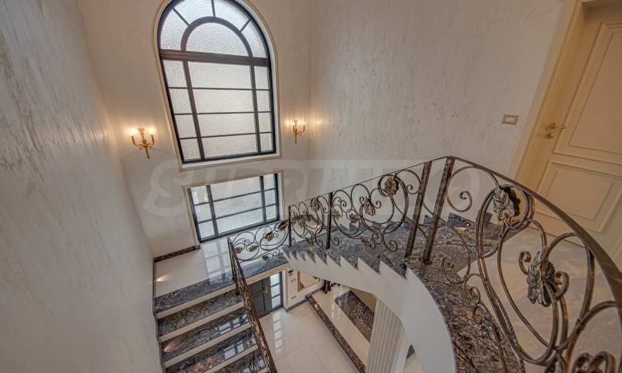Интериорът е изпълнен с красиви линии, прадразполагащ към комфортна и стилна атмосфера. Довършителните работи са от естествени висококачествени материали, като мрамор, гранит, дървен масив и др.: