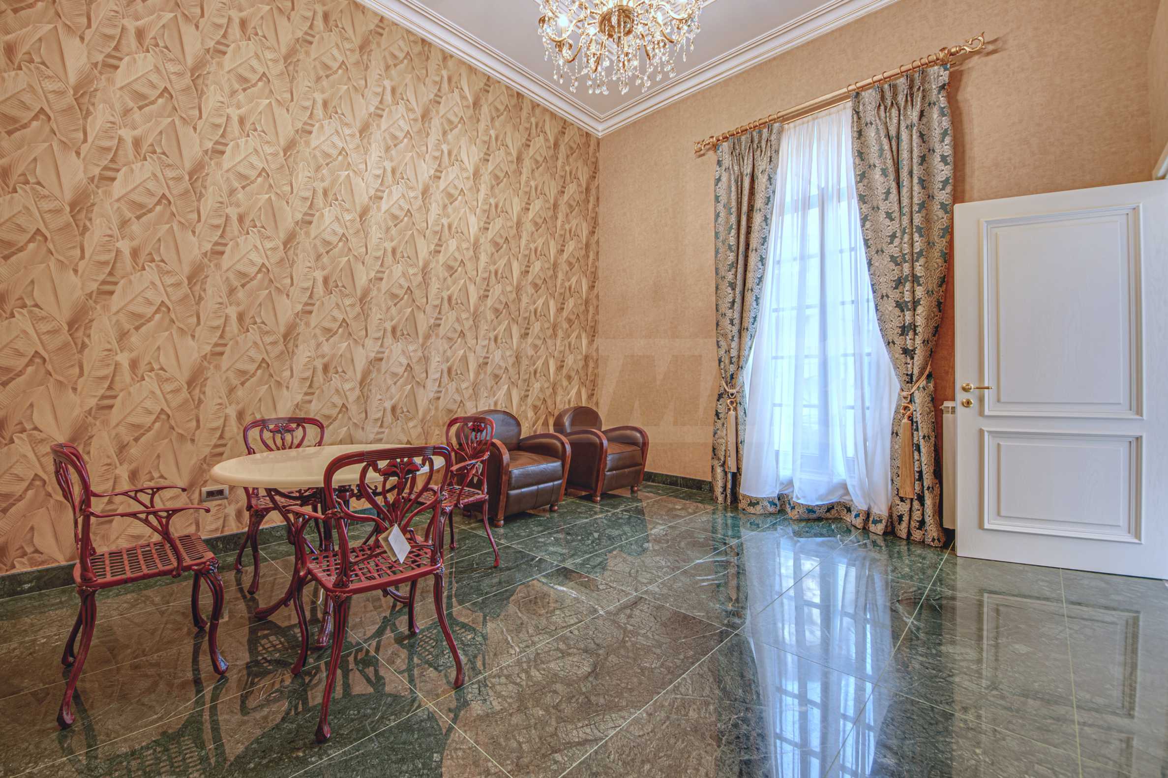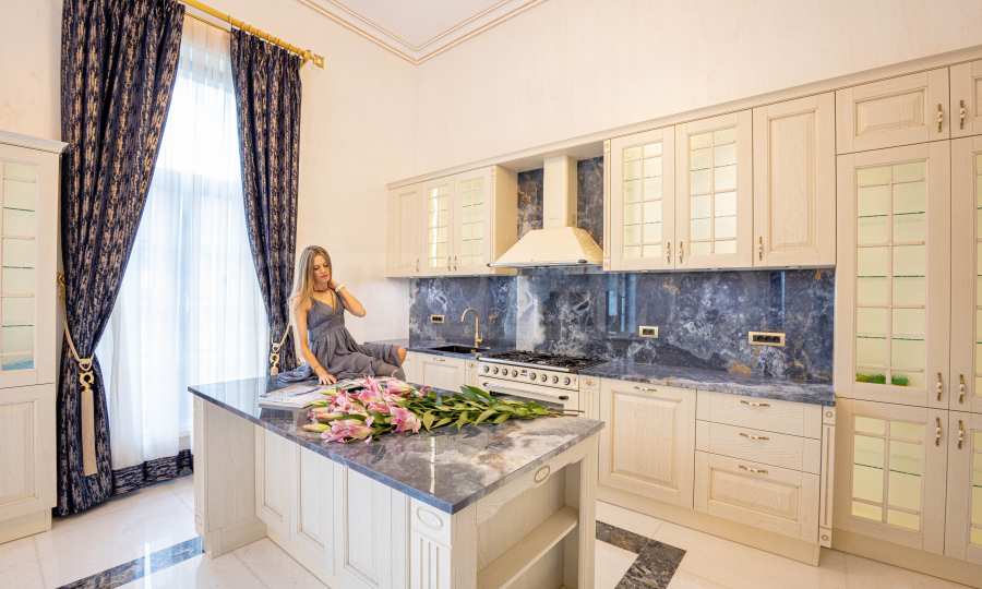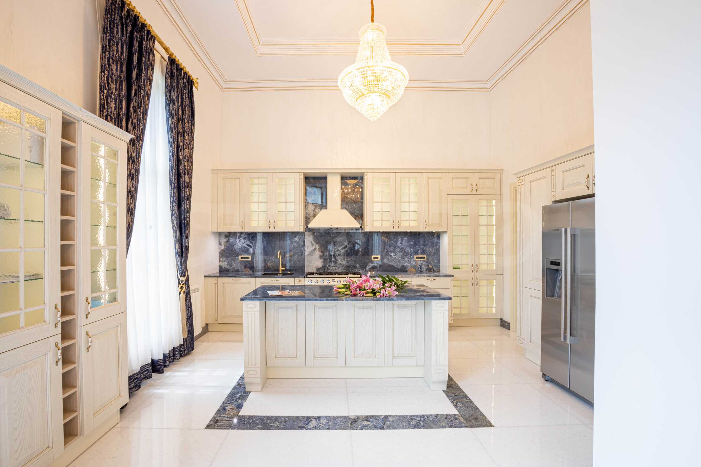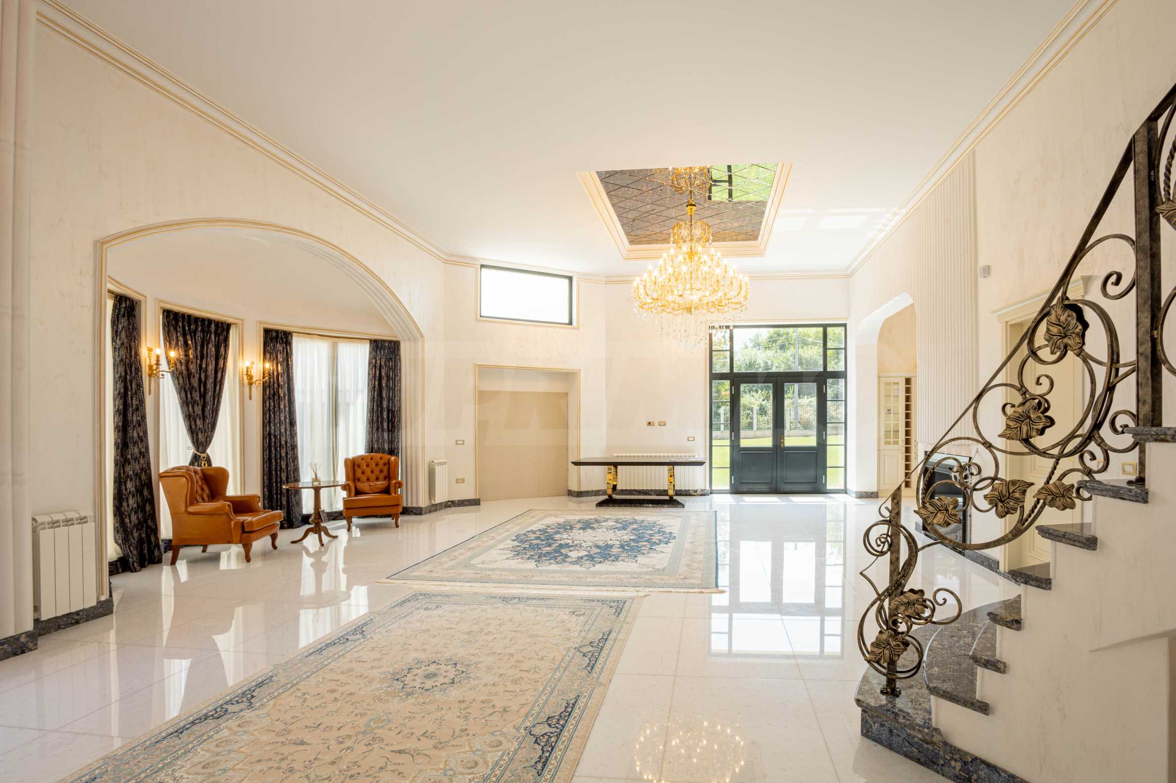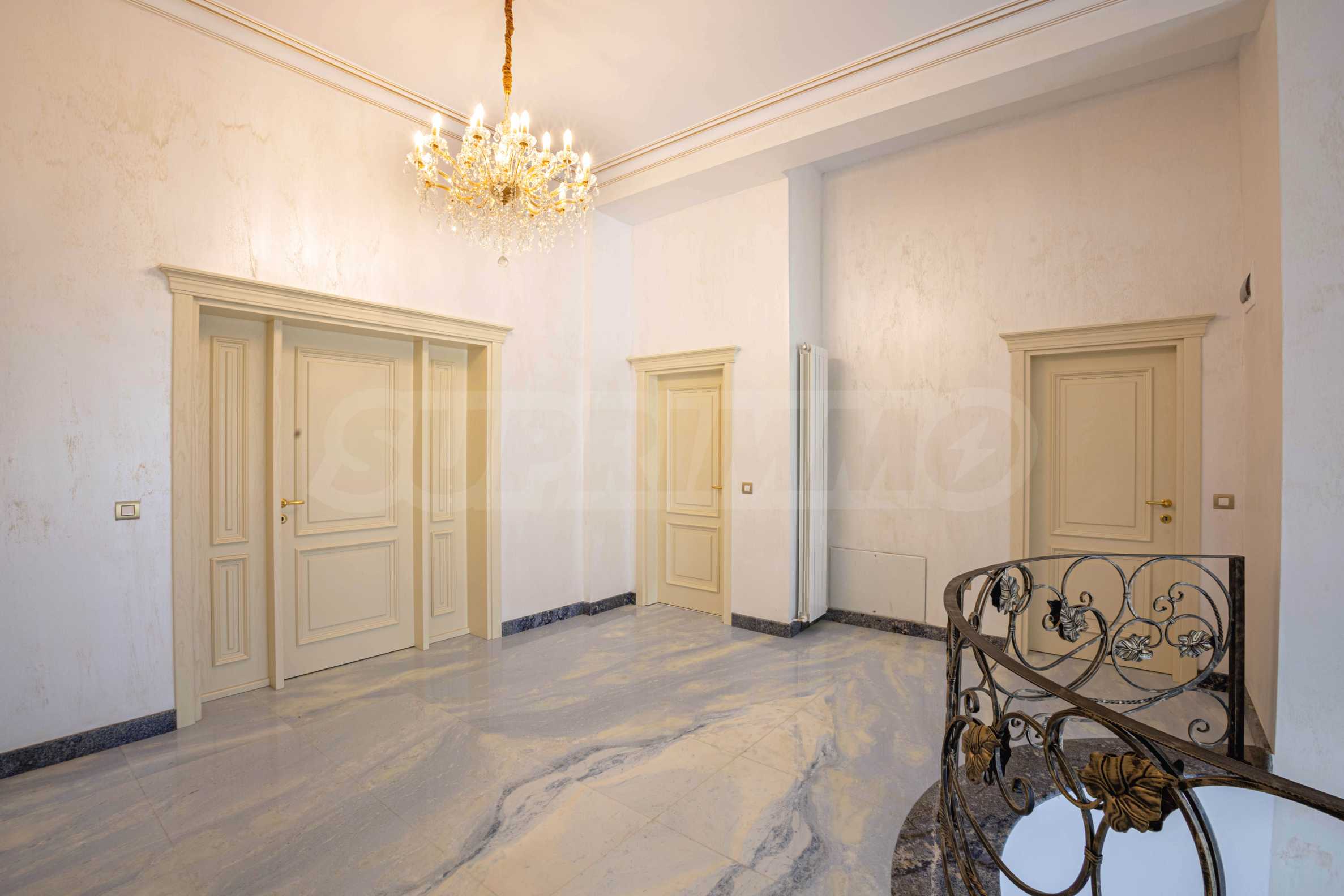 Интериорът е изпълнен с красиви линии, прадразполагащ към комфортна и стилна атмосфера. Довършителните работи са от естествени висококачествени материали, като мрамор, гранит, дървен масив и др.:
