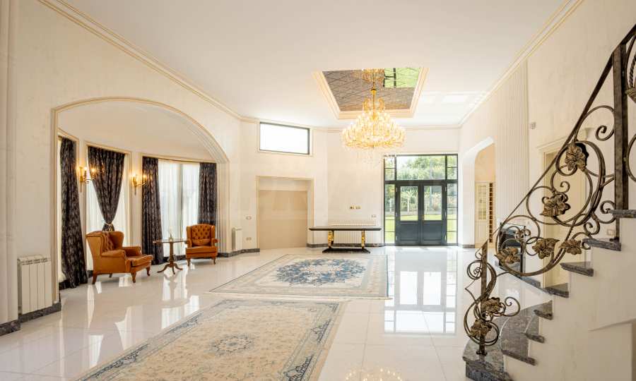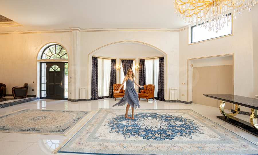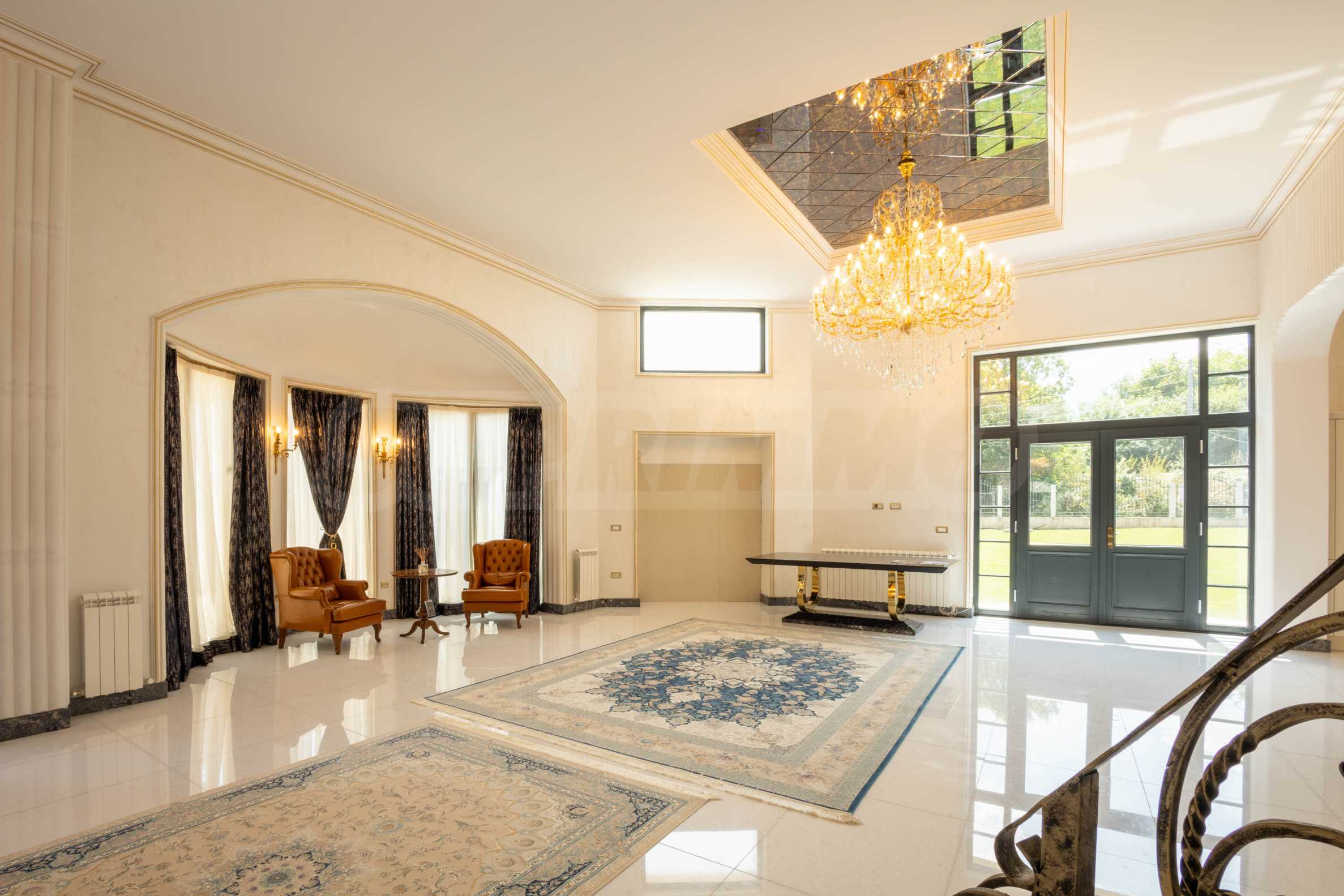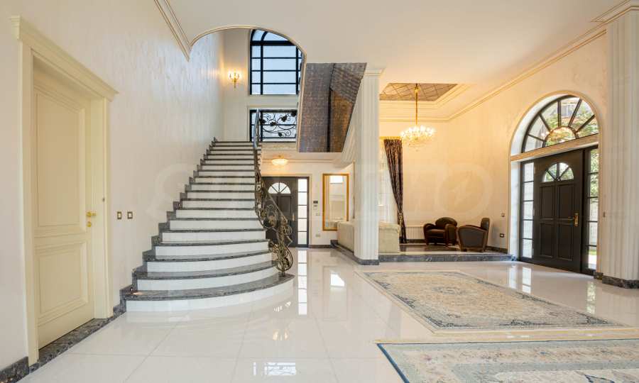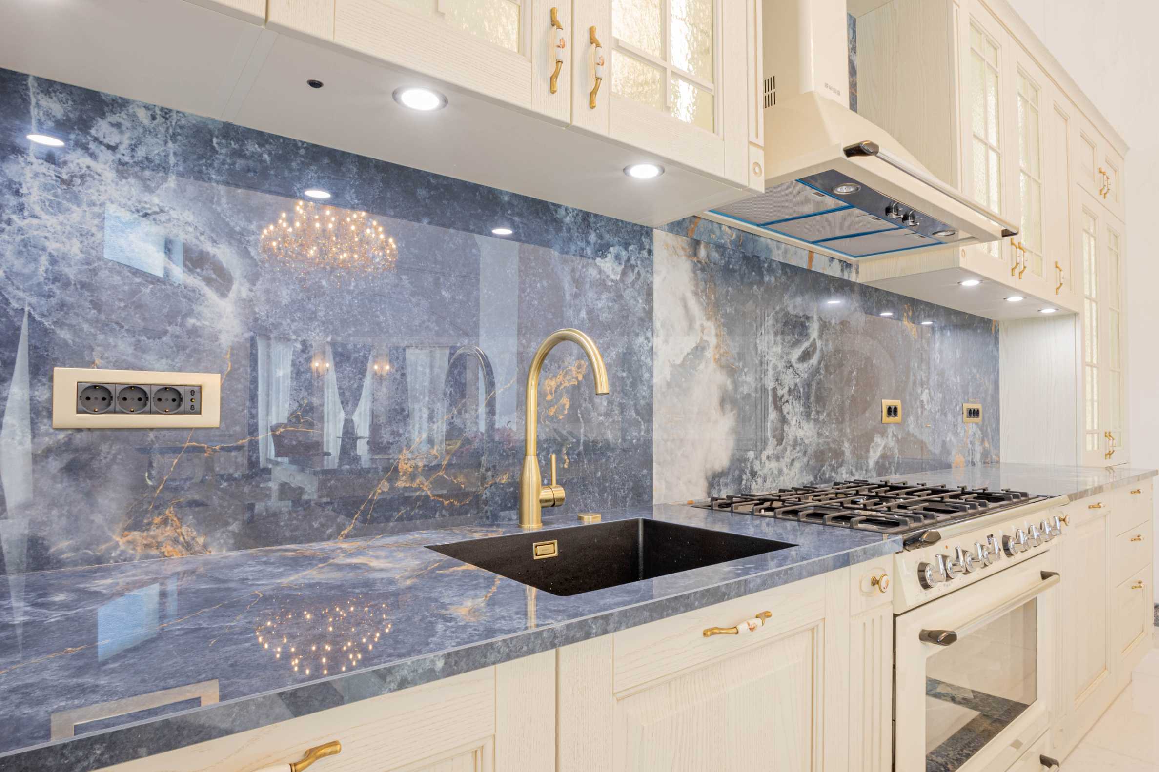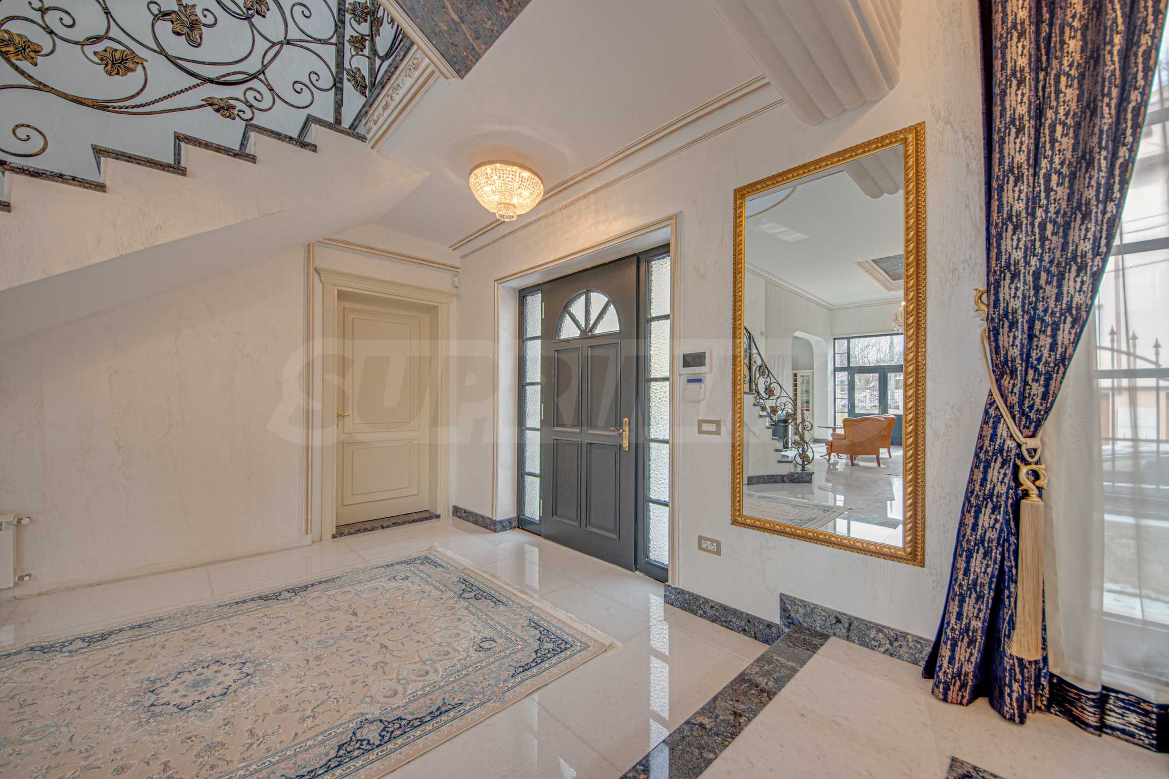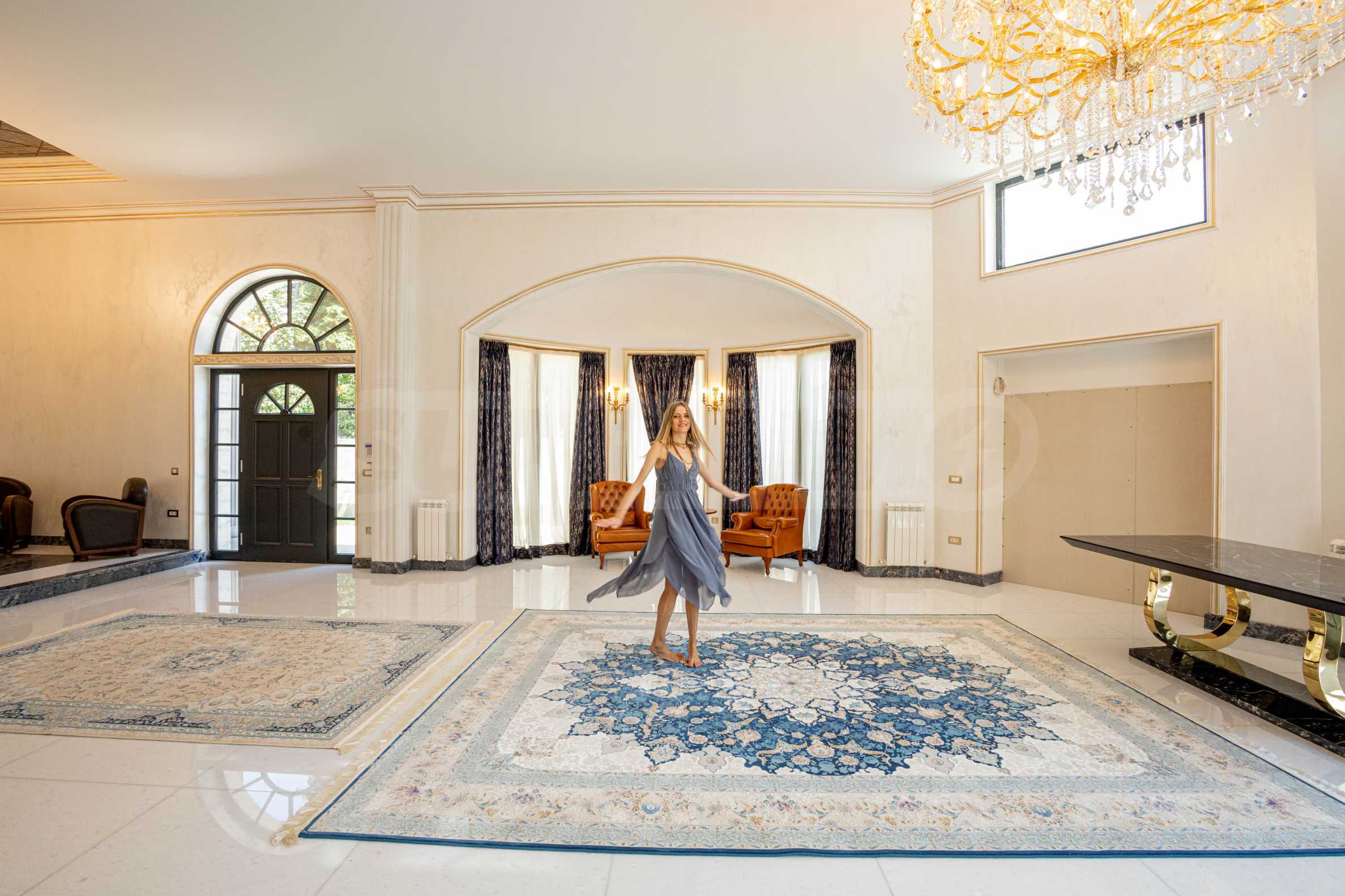 Интериорът е изпълнен с красиви линии, прадразполагащ към комфортна и стилна атмосфера. Довършителните работи са от естествени висококачествени материали, като мрамор, гранит, дървен масив и др.:
