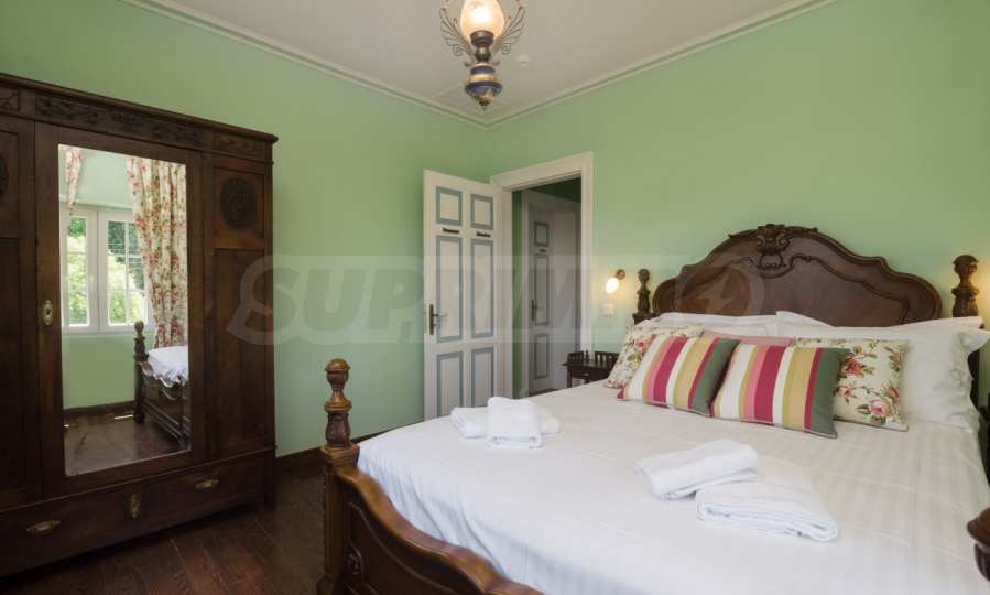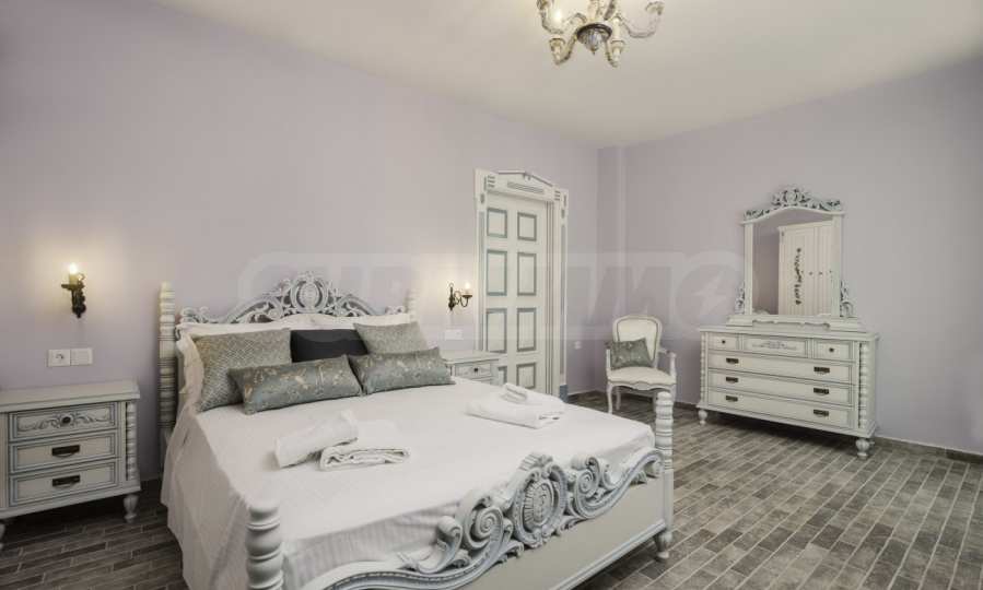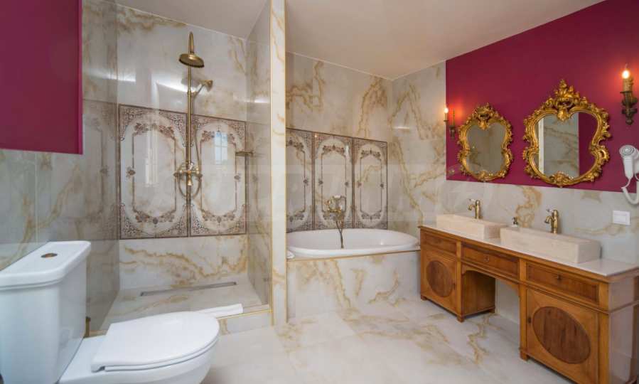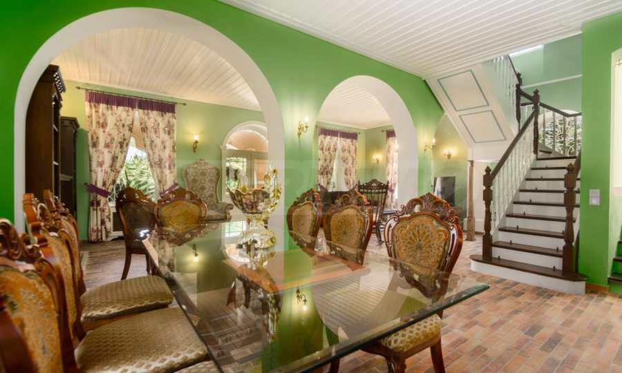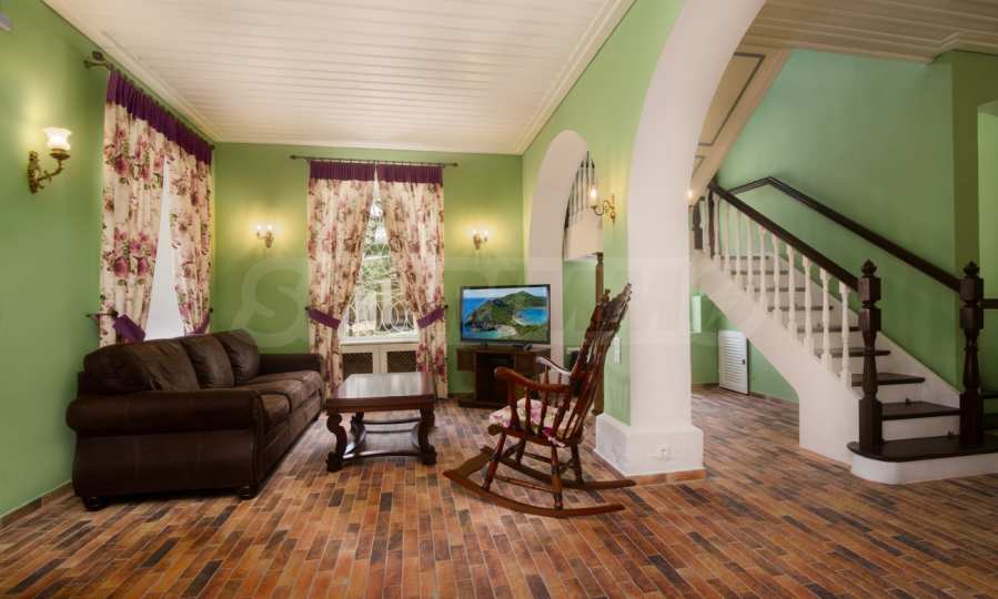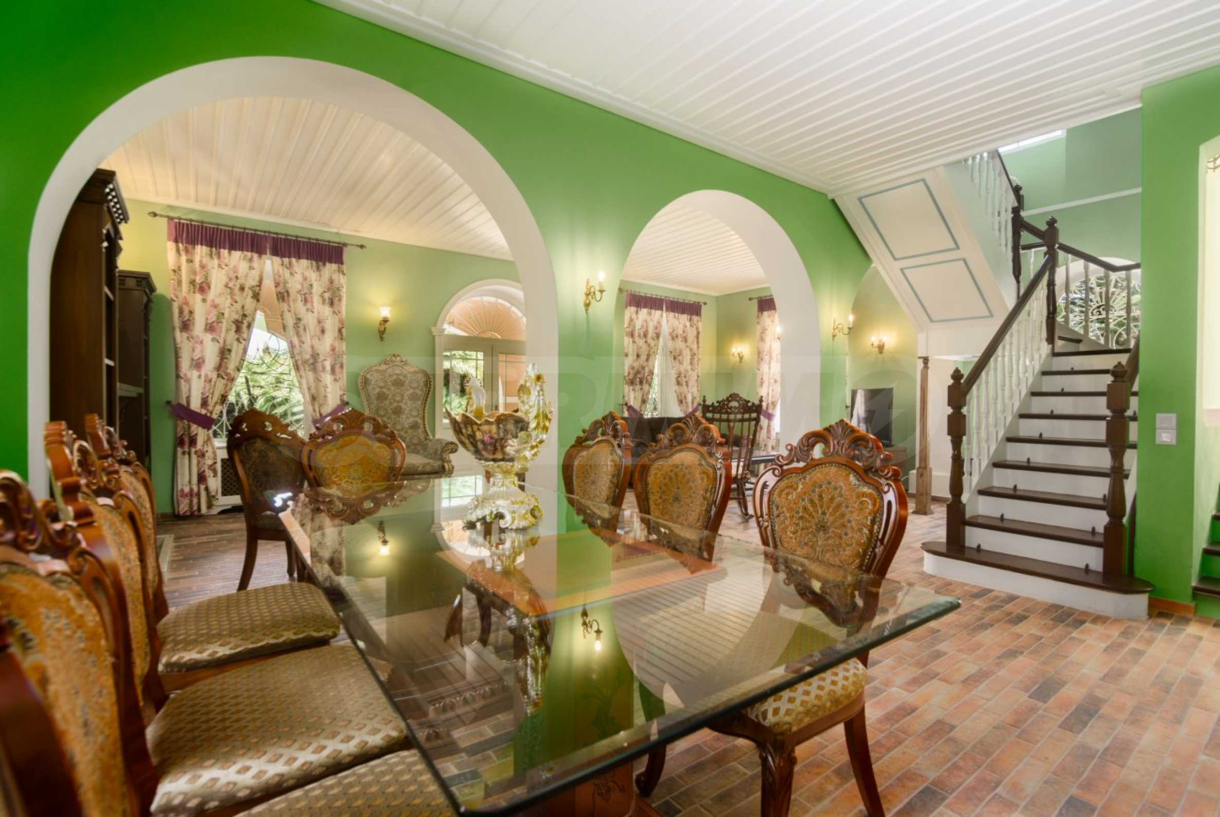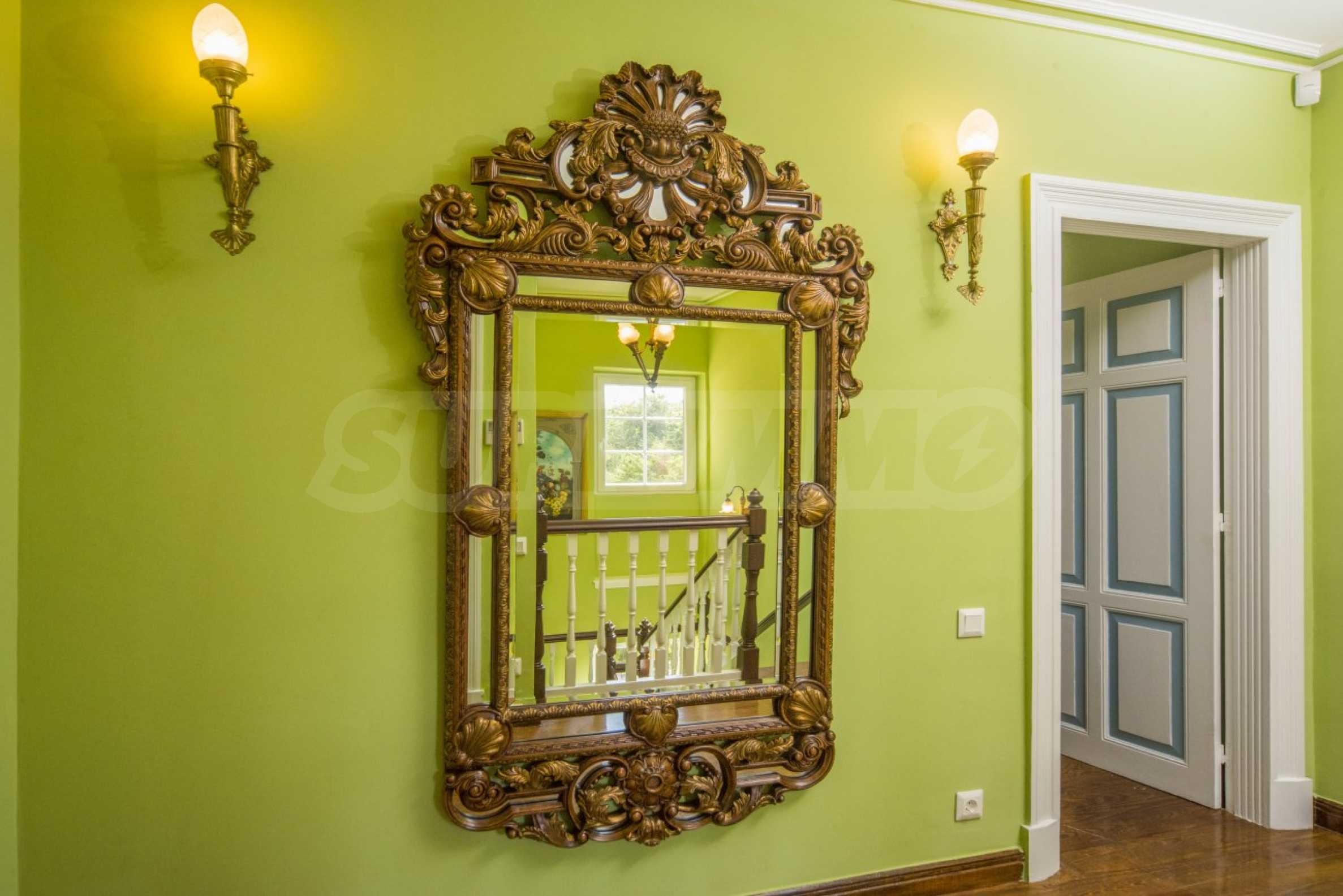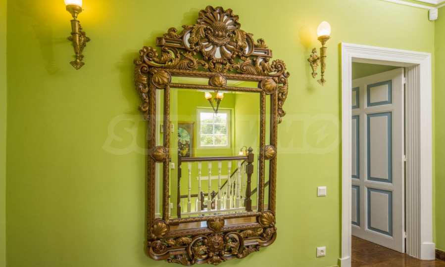 Привлекателността на вилата се простира до нейните детайли, улавяйки същността на изтънчеността във всеки аспект. Дървена врата от 19-ти век със сложна метална конструкция украсява главния вход, канейки ви в свят на несравнима красота. Интериорно дървено стълбище, стилизирано в английската традиция, свързва грациозно триетажните етажи, въплъщавайки елегантност и финес на всяка крачка.