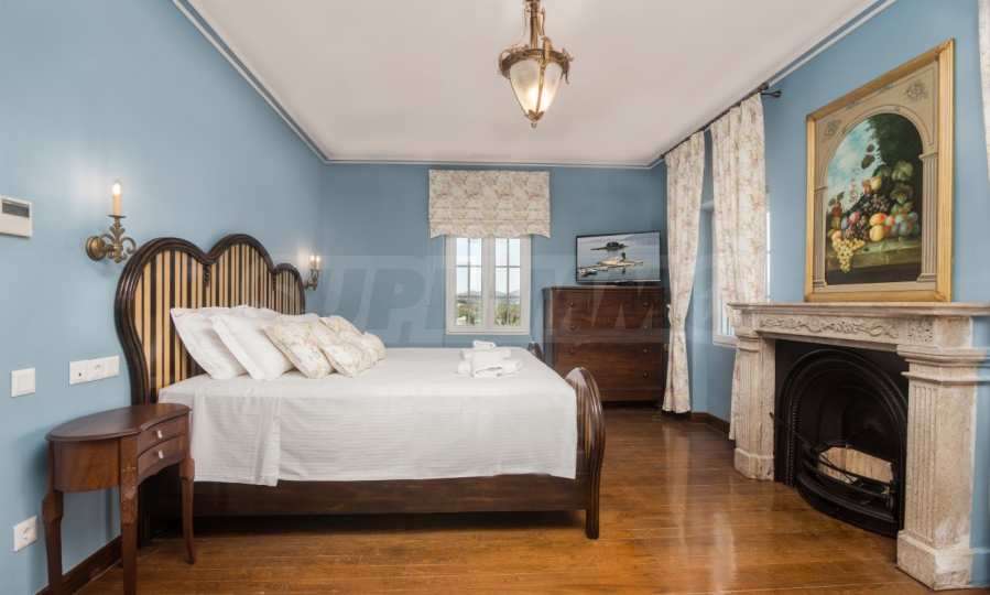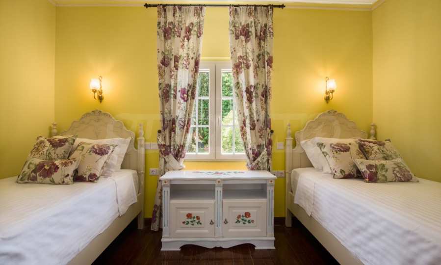 Вилата може да се похвали с ръчно изработени антични мебели, внимателно събрани от Корфу и далечни земи, като всяка част разказва своята уникална история. Издълбаните и ръчно рисувани гардероби излъчват усещане за артистичност и елегантност, улавяйки същността на една отминала епоха.