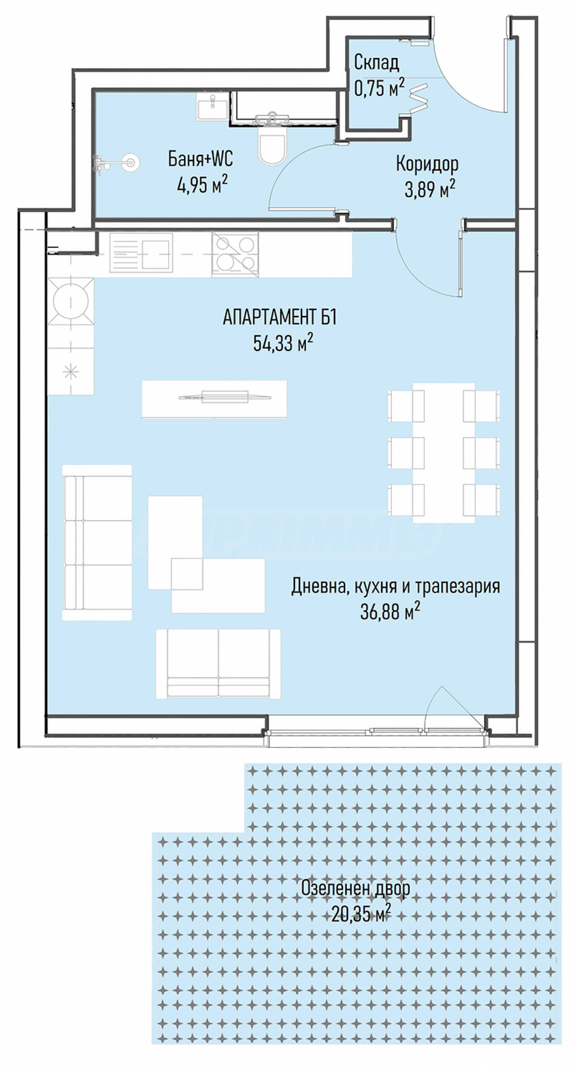 Имотът е разположен на ниво партер, предлага 66.35 кв.м обща площ и двор с площ 20.35 кв.м.