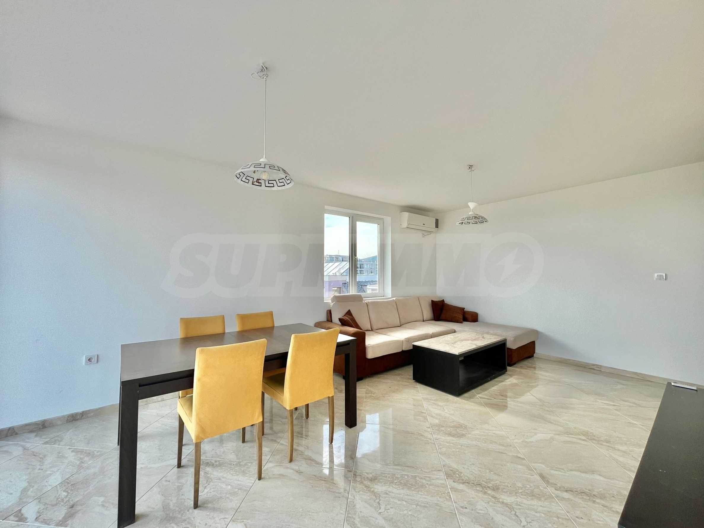 Имотът е ситуиран на 5-и последен етаж и разкрива панорамни гледки към града и морето. Предлага 136 кв.м обща площ и се състои от всекидневна с кухня, две спални, баня с тоалетна, две тераси - едната с панорамна гледка към града и морето, а другата е с изглед към вътрешен двор.