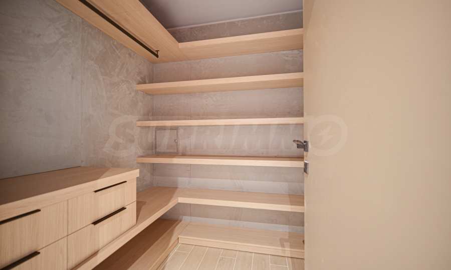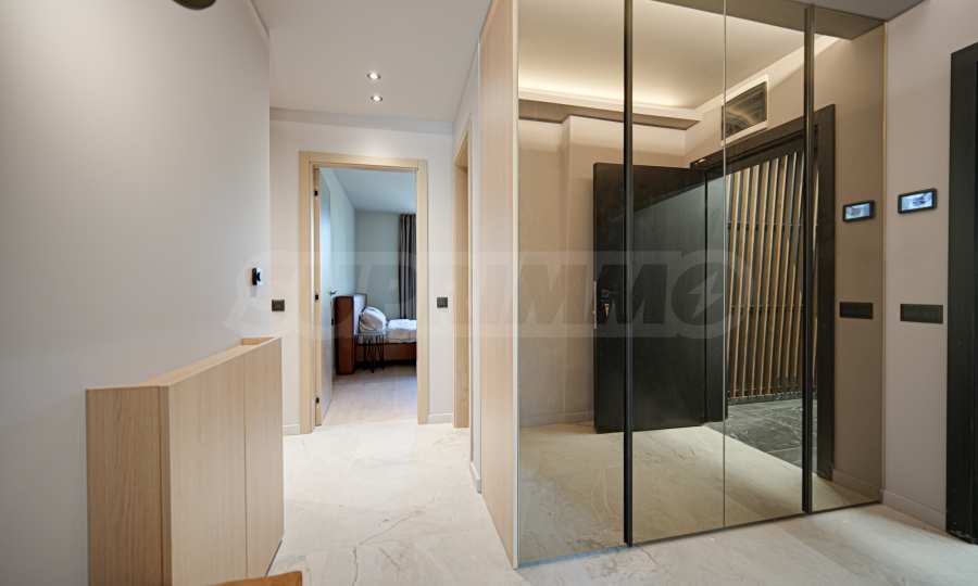 Разпределение на имота: просторно входно антре, дневна с кухня, две спални, две бани, гардеробна и тераса.