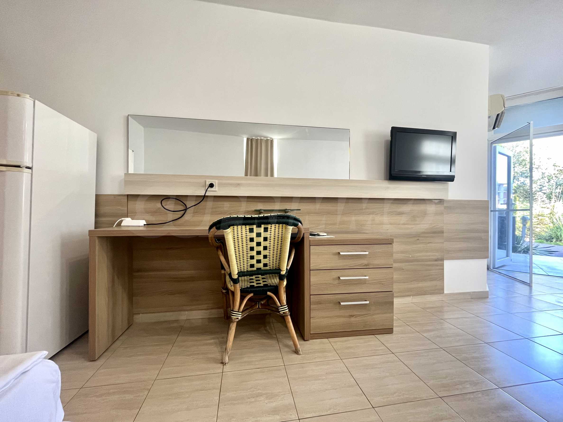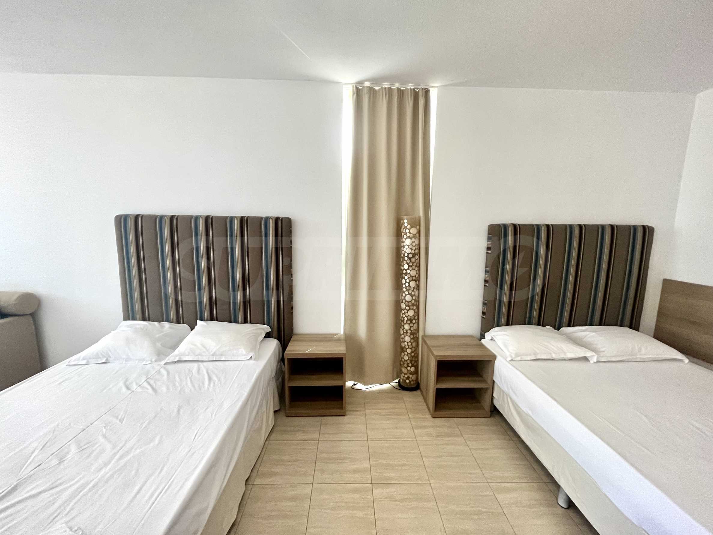 Жилището има обширна веранда с панорама море и гледка към зеленината на местността. Състои се от удобен коридор, оборудвана кухня, уютна светла стая с две отделни легла, баня с вана и тоалет. Предлага се с мебели и техника, с пълно оборудване и всичко необходимо за живеенето или отдаването под наем.