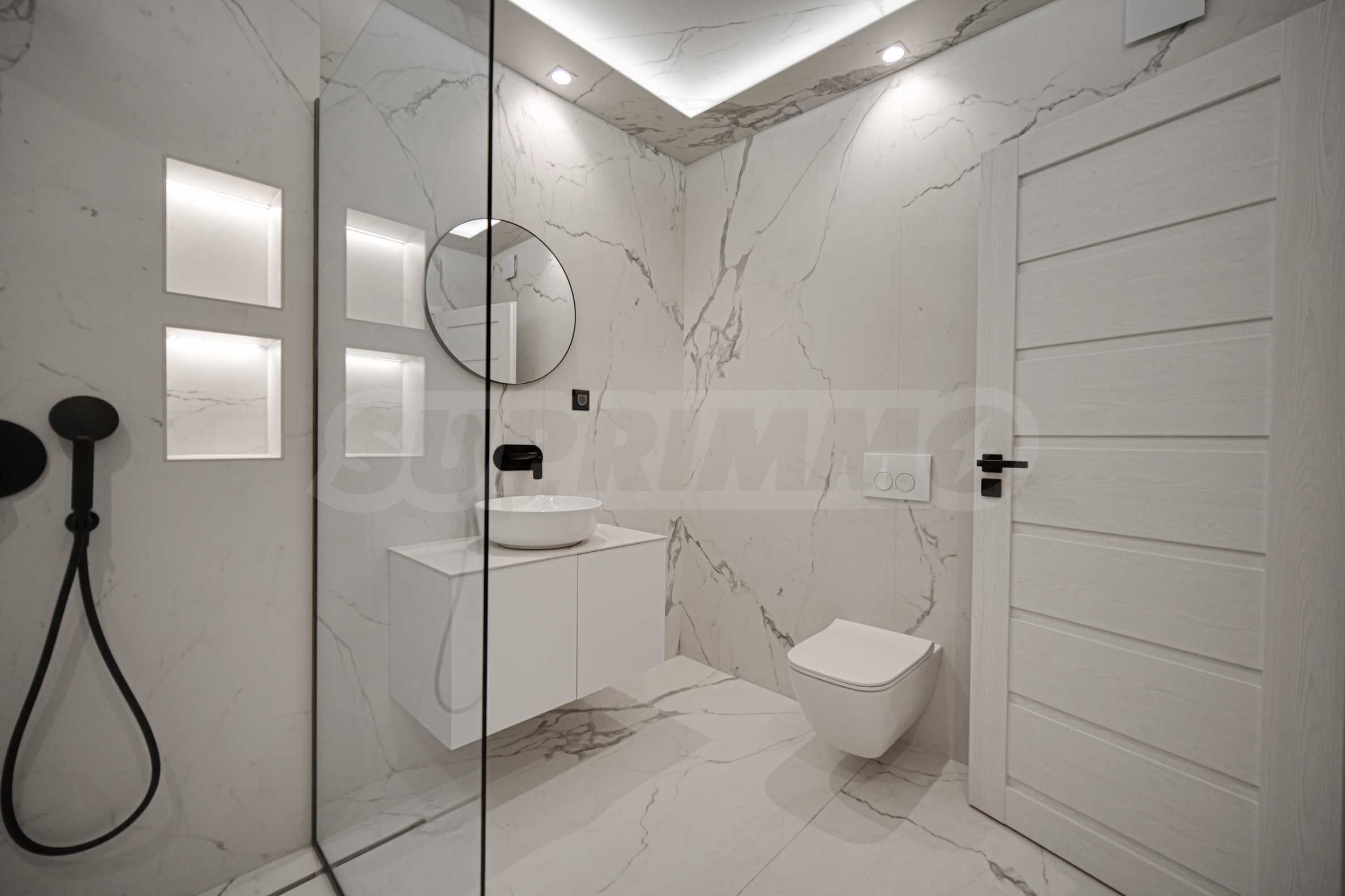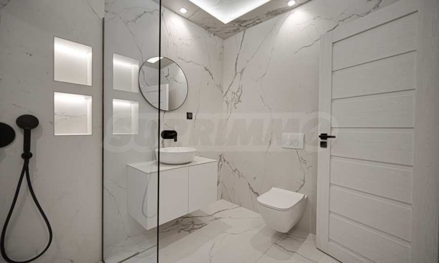 Подовите настилки са от мрамор и естествен паркет, мебелите са модерни, а кухнята е напълно оборудвана с хладилник, стъклокерамични котлони с абсорбатор, комбинирана пералня със сушилня, голяма миялна машина.