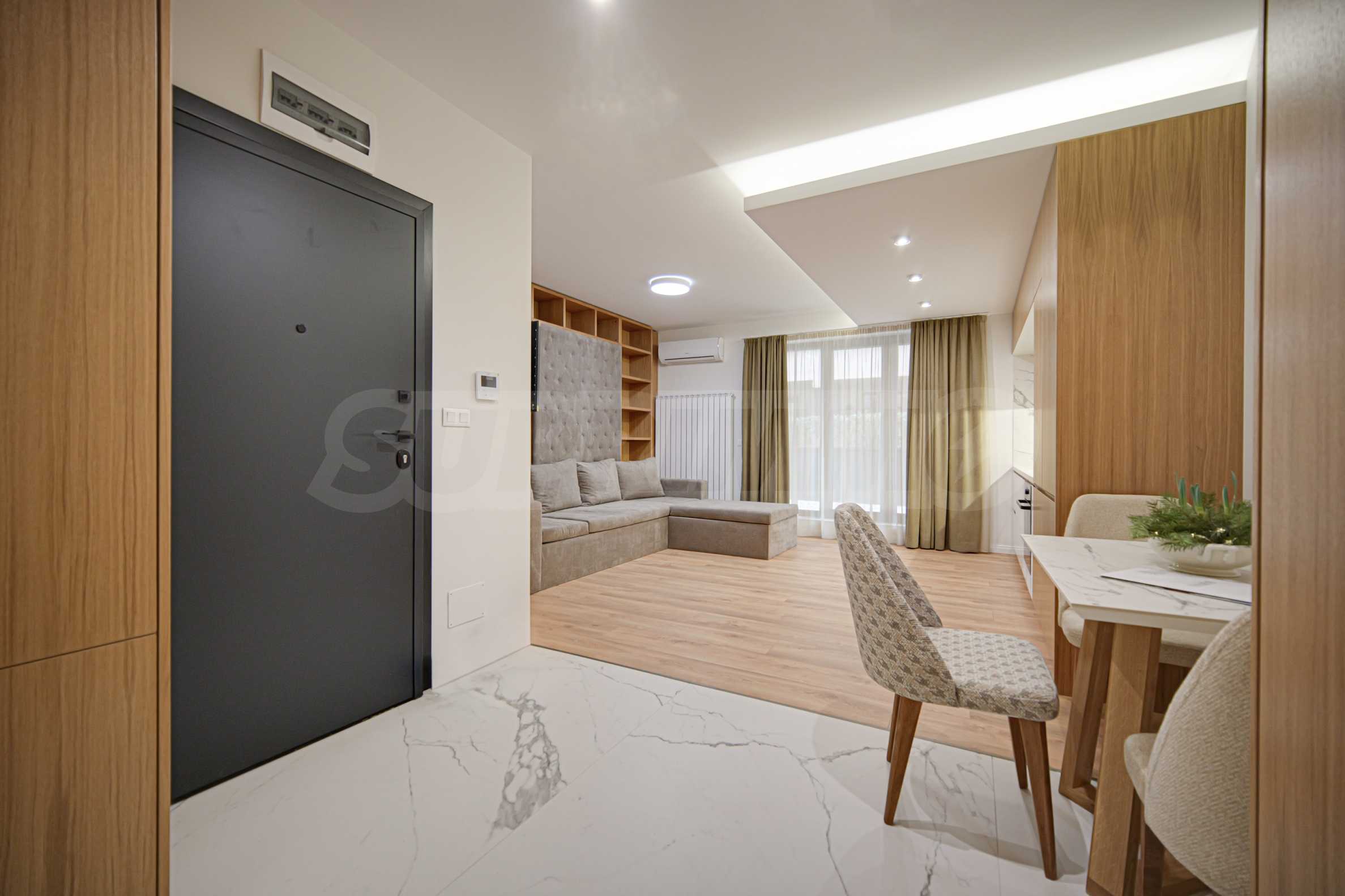 Имотът се състои от просторна всекидневна с трапезария и кухненски бокс, баня. Има падащо легло, което е скрито в стената с две странични ракли.