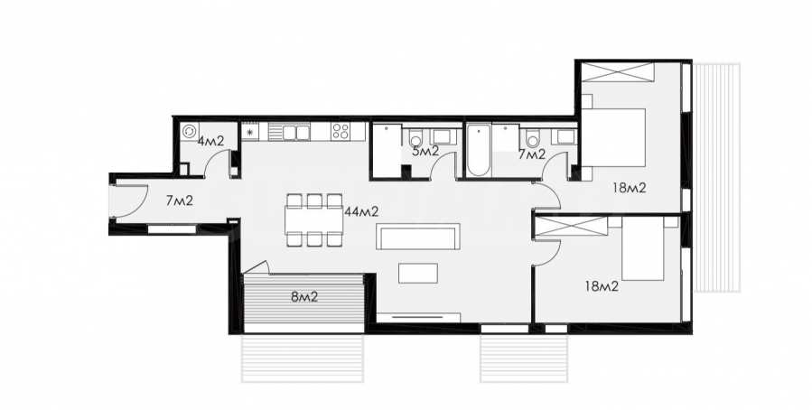 Жилището е ситуирано на втори жилищен етаж и се състои от всекидневна с кухня, 2 спални, 2 бани с тоалетни, мокро помещение сервизно помещение и тераси