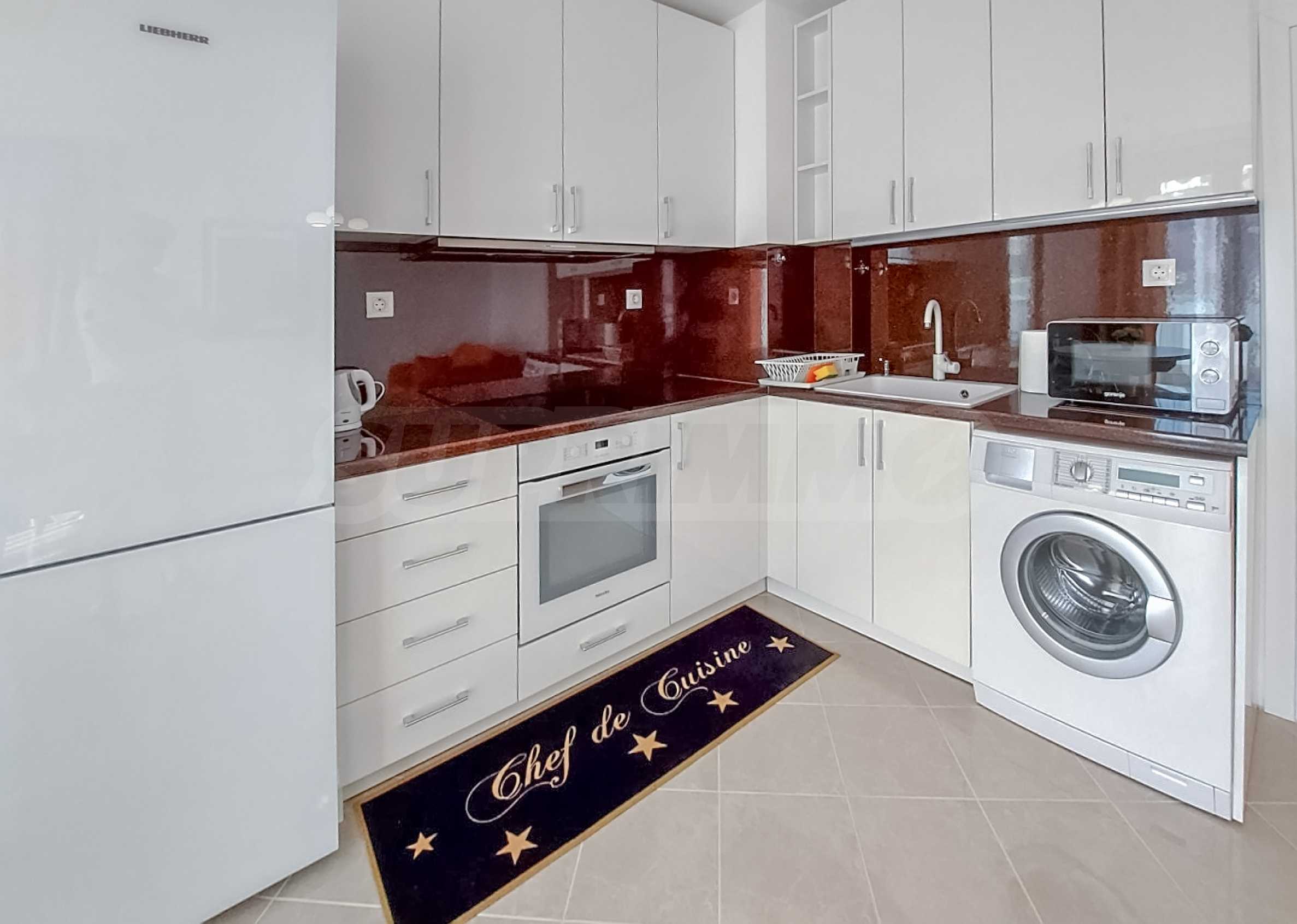 Апартаментът е напълно обзаведен и оборудван с всички необходими ел. уреди - хладилник, керамични котлони, вградена фурна, пералня, прахосмукачка и микровълнова фурна, телевизори и др.