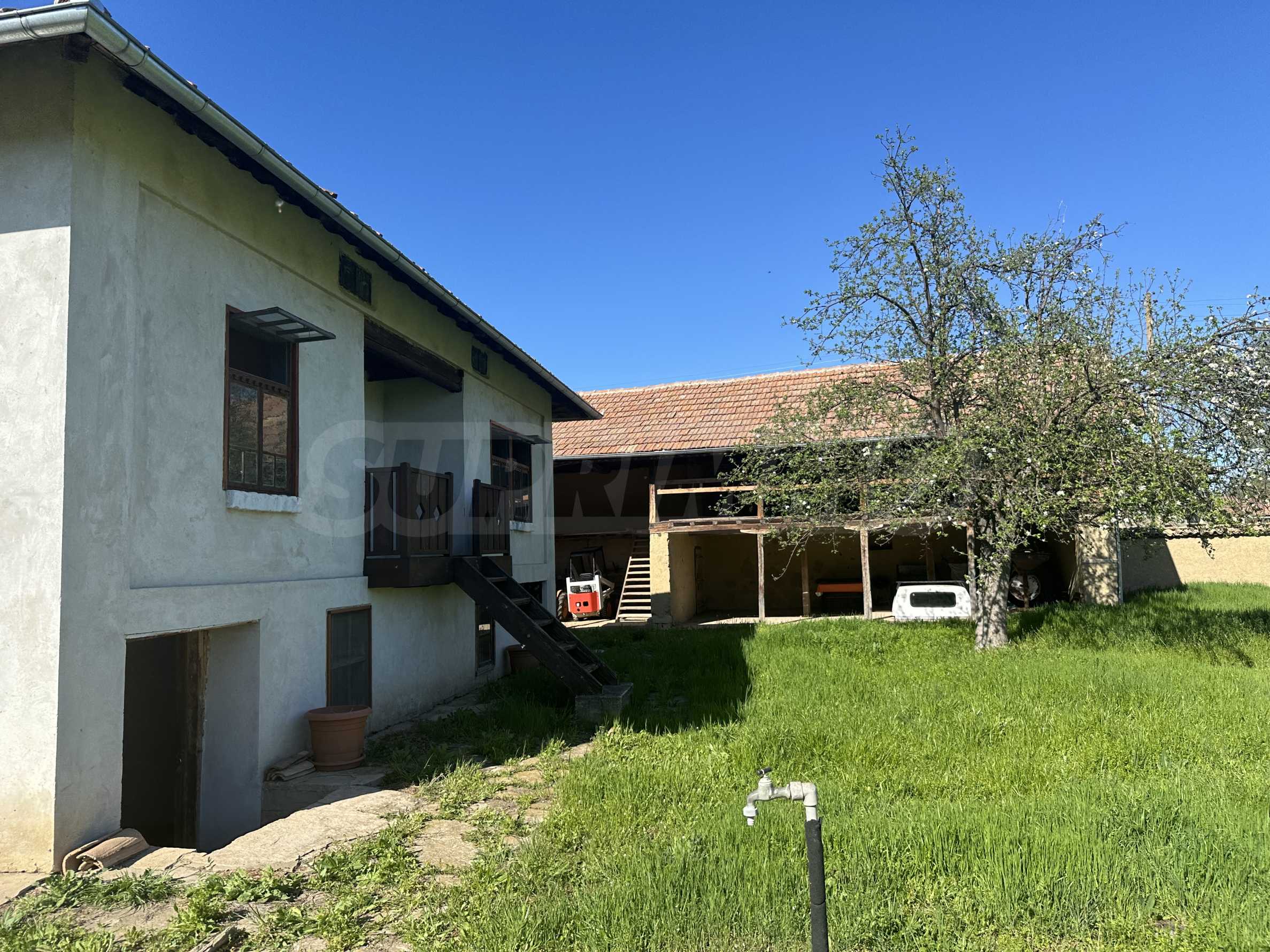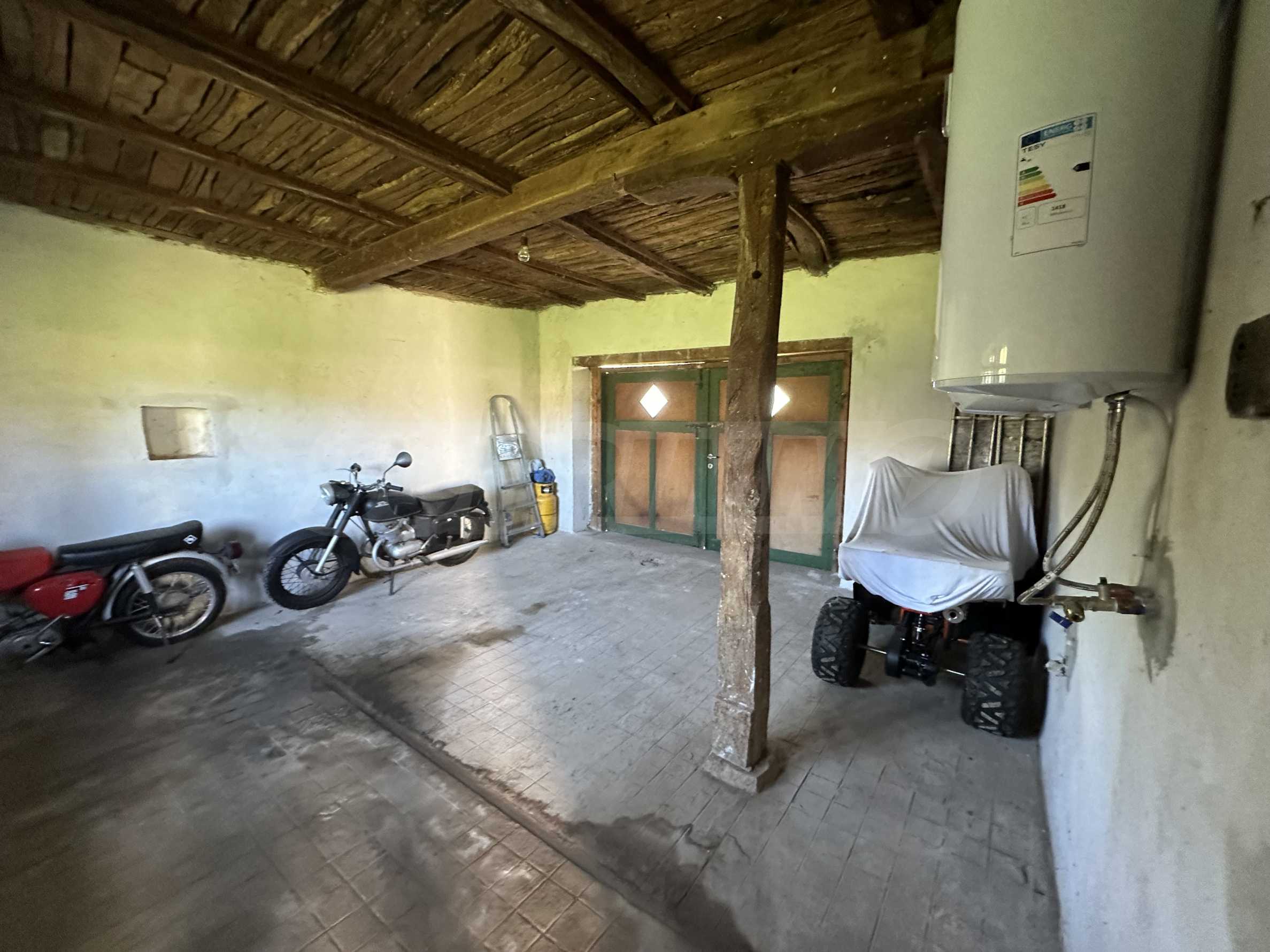 Прилежащи към имота са два гаража, склад, сайвант на две нива и 8 декара двор. Има изведена чешма за поливане в двора.