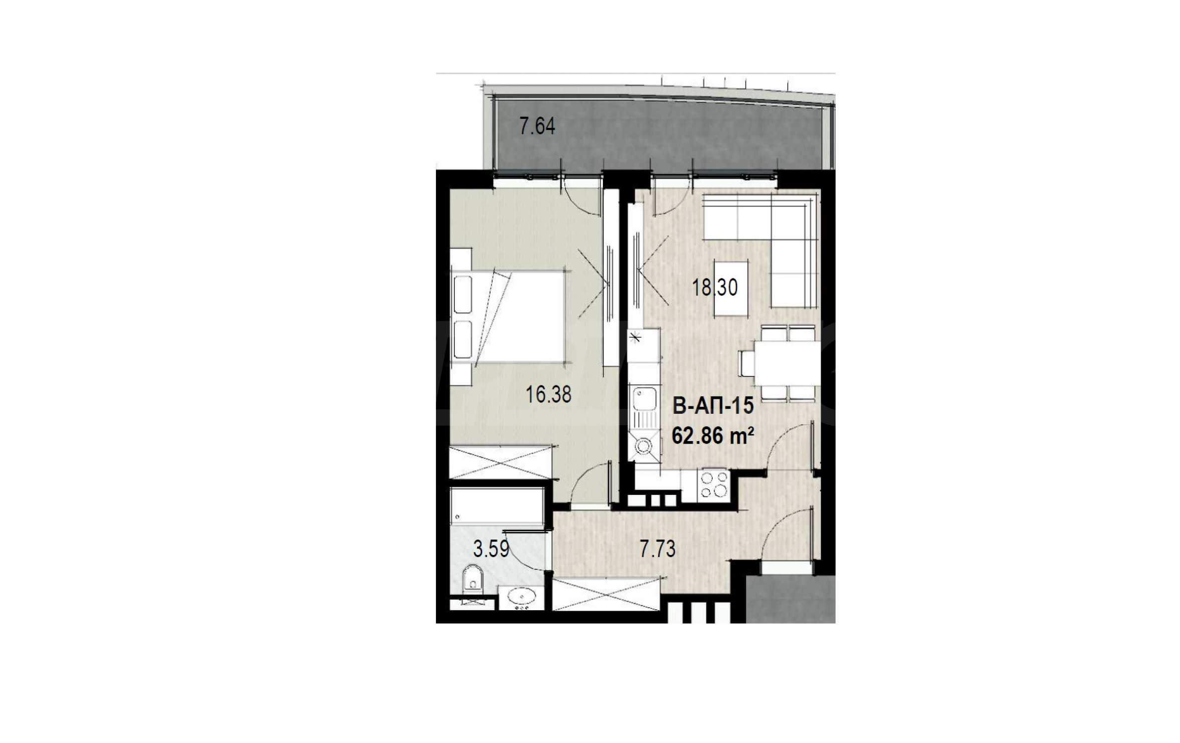 Имотът е ситуиран на 4-ти жилищен етаж, ориентиран е на североизток и предлага 74.95 кв.м обща площ. Състои се от антре, всекидневна, спалня, баня с тоалетна, тераса.
