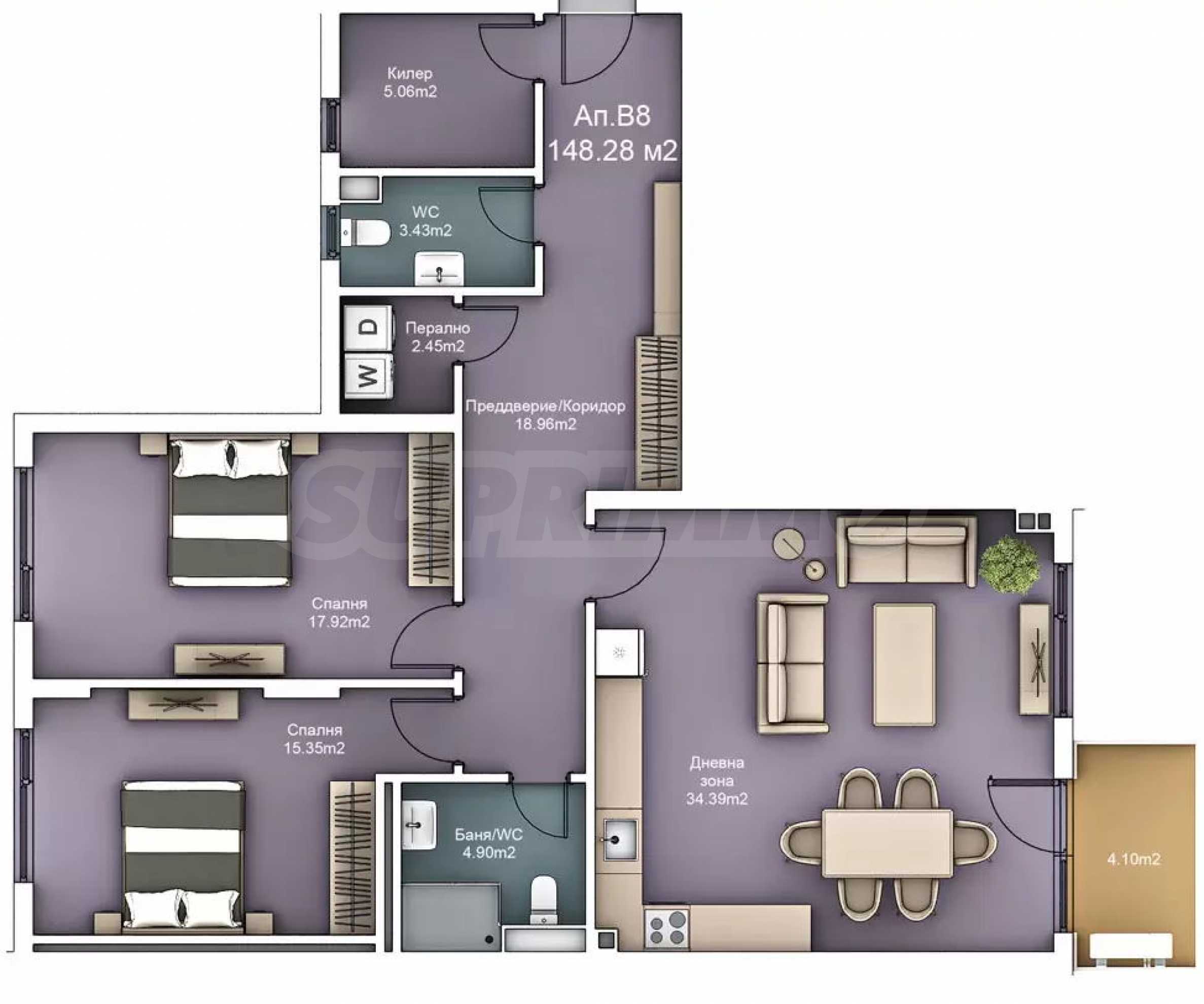 - дневна зона: 34.39 кв.м;