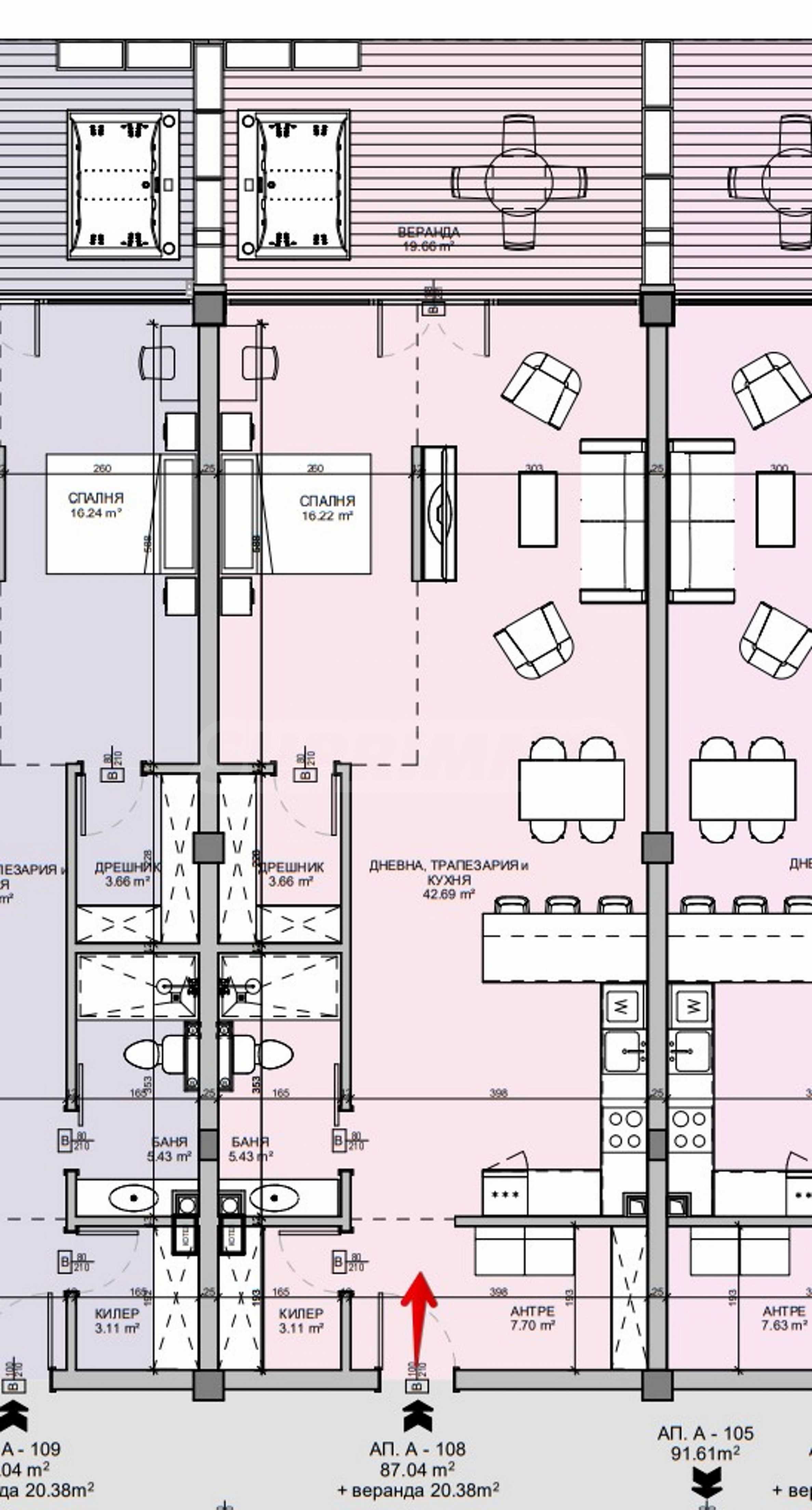 Разпределение: кухненски бокс, дневна/спалня, баня/тоалетна, дрешник, антре, обща площ 126.72 кв.м. (нетна площ 87.15 кв.м. + общи части 19.29 кв.м.), плюс градина/тераса от 20.28 кв.м. - включена в общата площ и която е ценообразувана на половината цена от цената на жилищната площ. Има възможност за преустройство на двустаен апартамент.