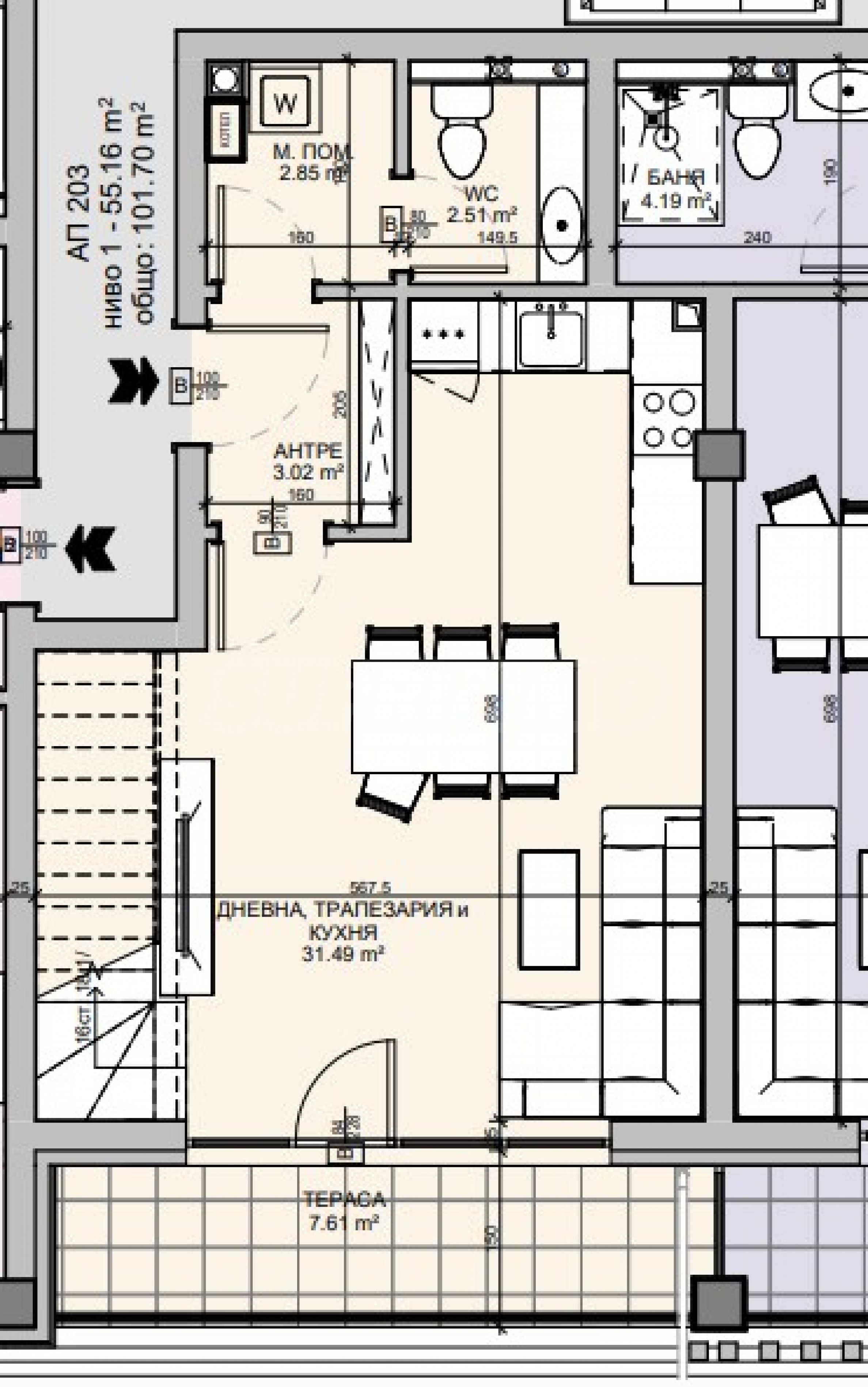 Имотът е ситуиран на 2-ри и 3-ти етаж и предлага 124.01 кв.м обща площ (нетна площ 101.92 кв.м + общи части 22.09 кв.м). На първото ниво са разпределени антре, всекидневна с кухня, тоалетна за гости, мокро помещение и тераса, а ниво две разполага със спалня, дрешник и баня с тоалетна.