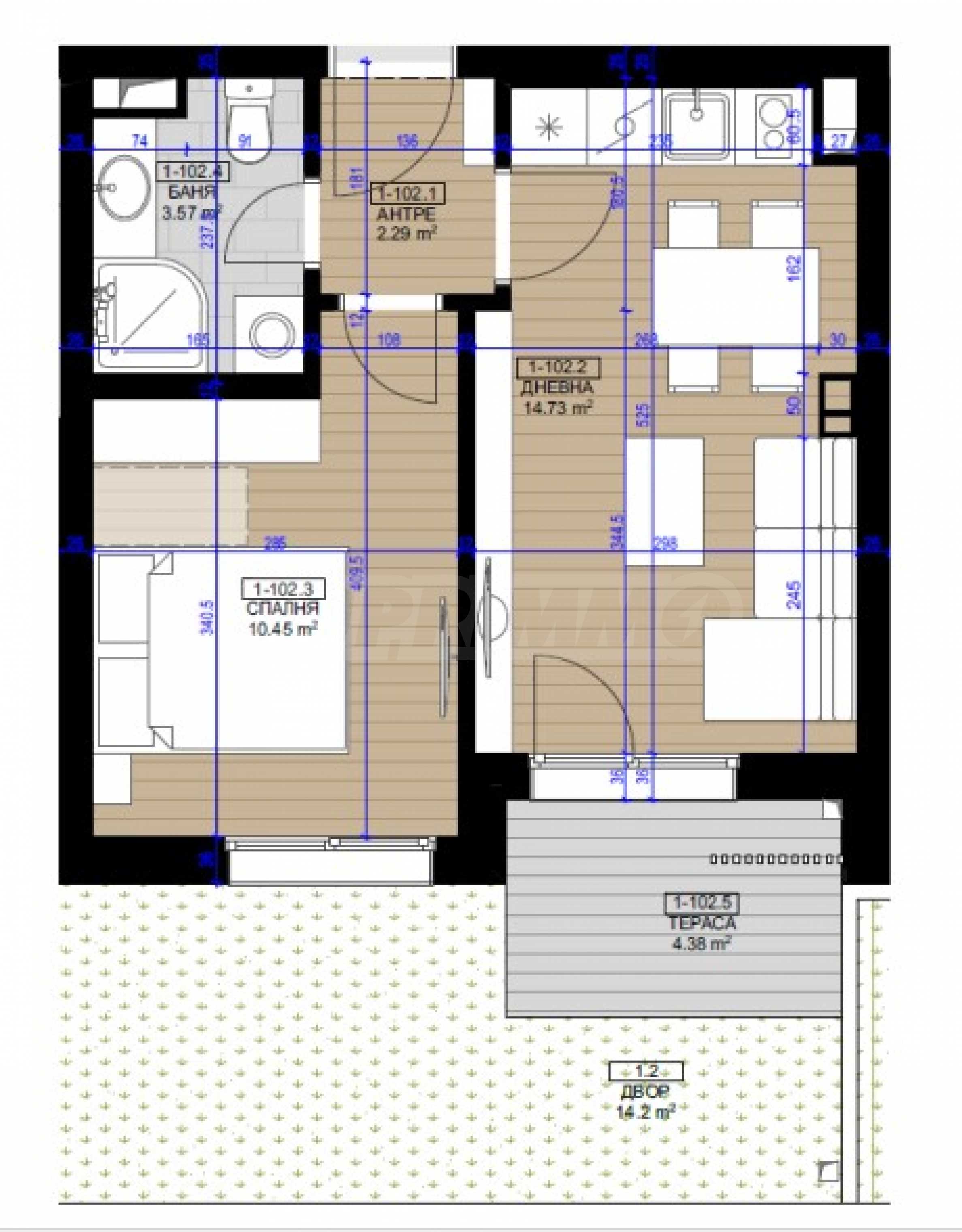 Представяме за продажба комфортен двустаен апартамент с двор, в нов комплекс до The Mall в София, кв. "Полигона".