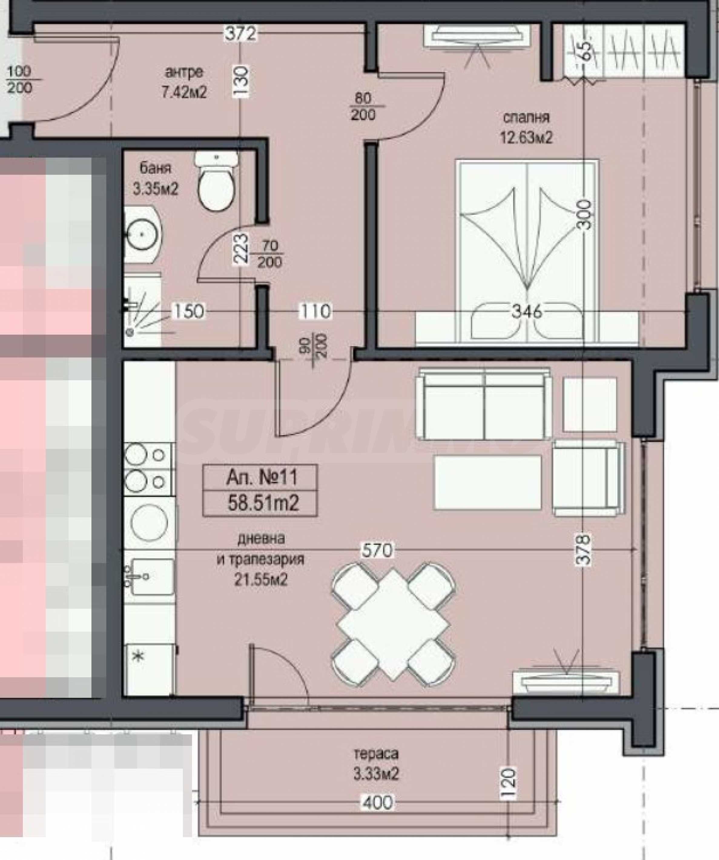 Имотът е разположен на 3-ти етаж и предлага 64,32 кв.м обща площ, разпределена в коридор, всекидневна с кухненска част, спалня, баня с тоалетна и тераса.