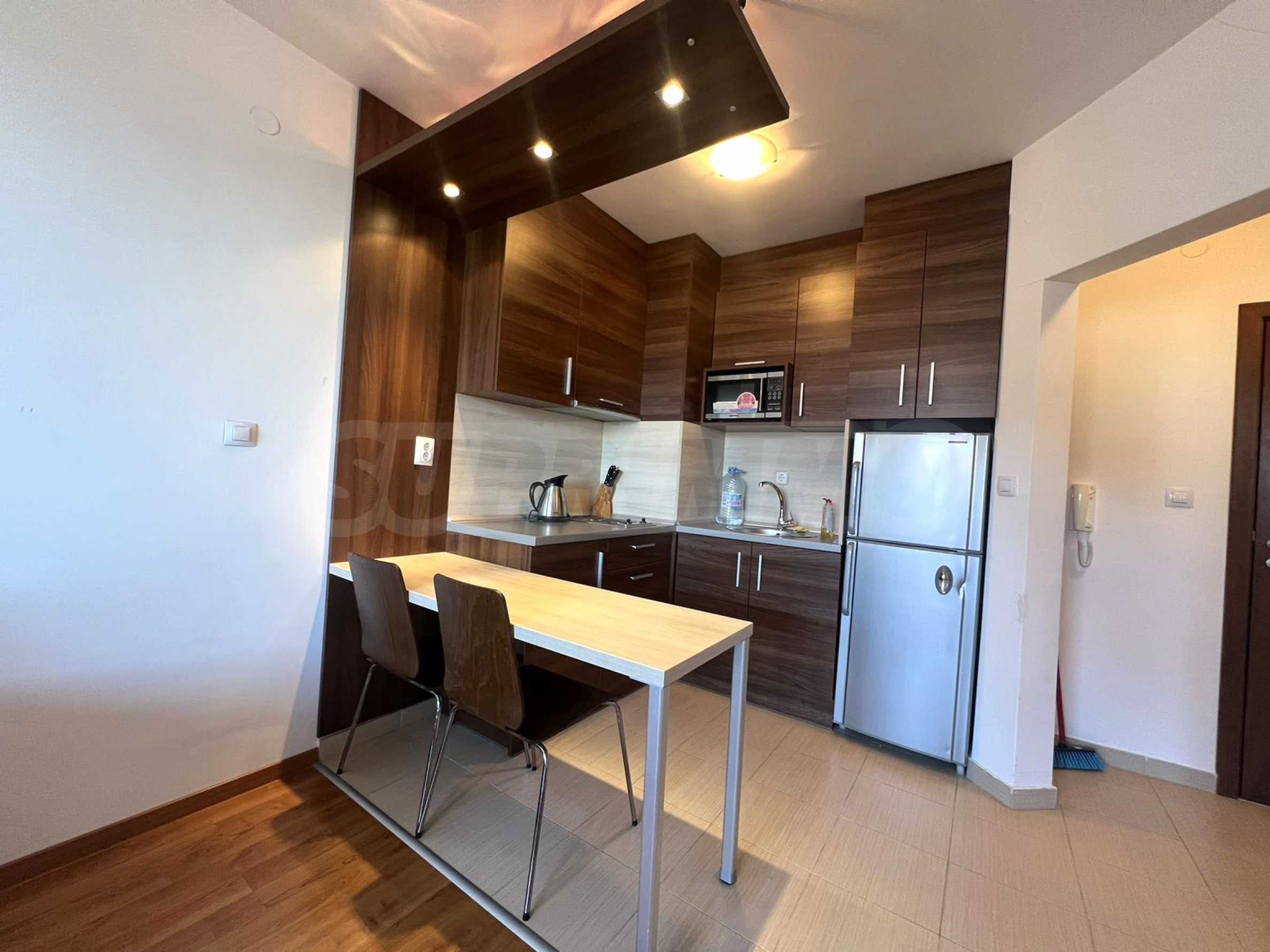 Кухня – напълно обзаведена и оборудвана с котлон (две гнезда), абсорбатор, микровълнова фурна, хладилник, бар-плот с два стола;