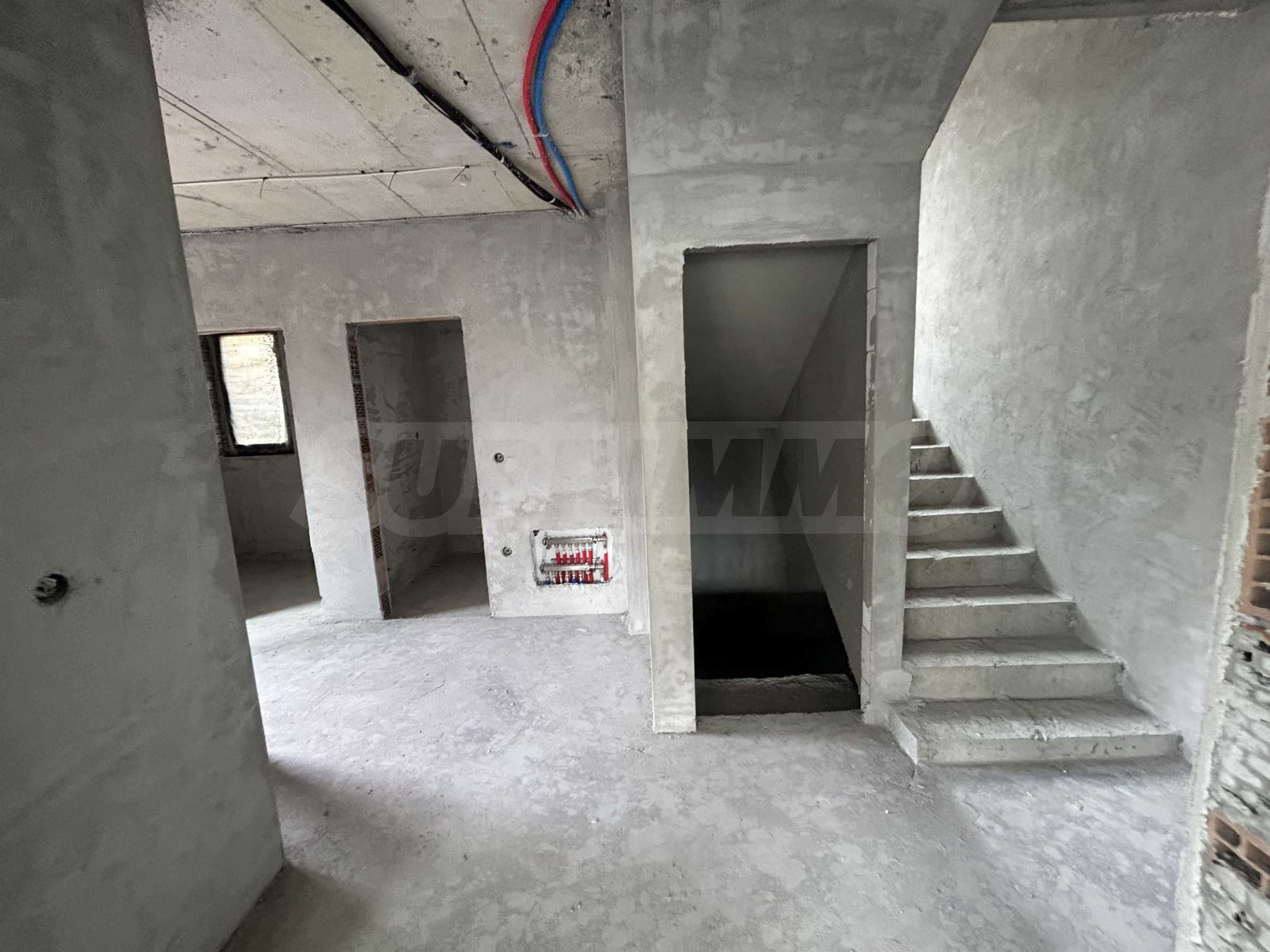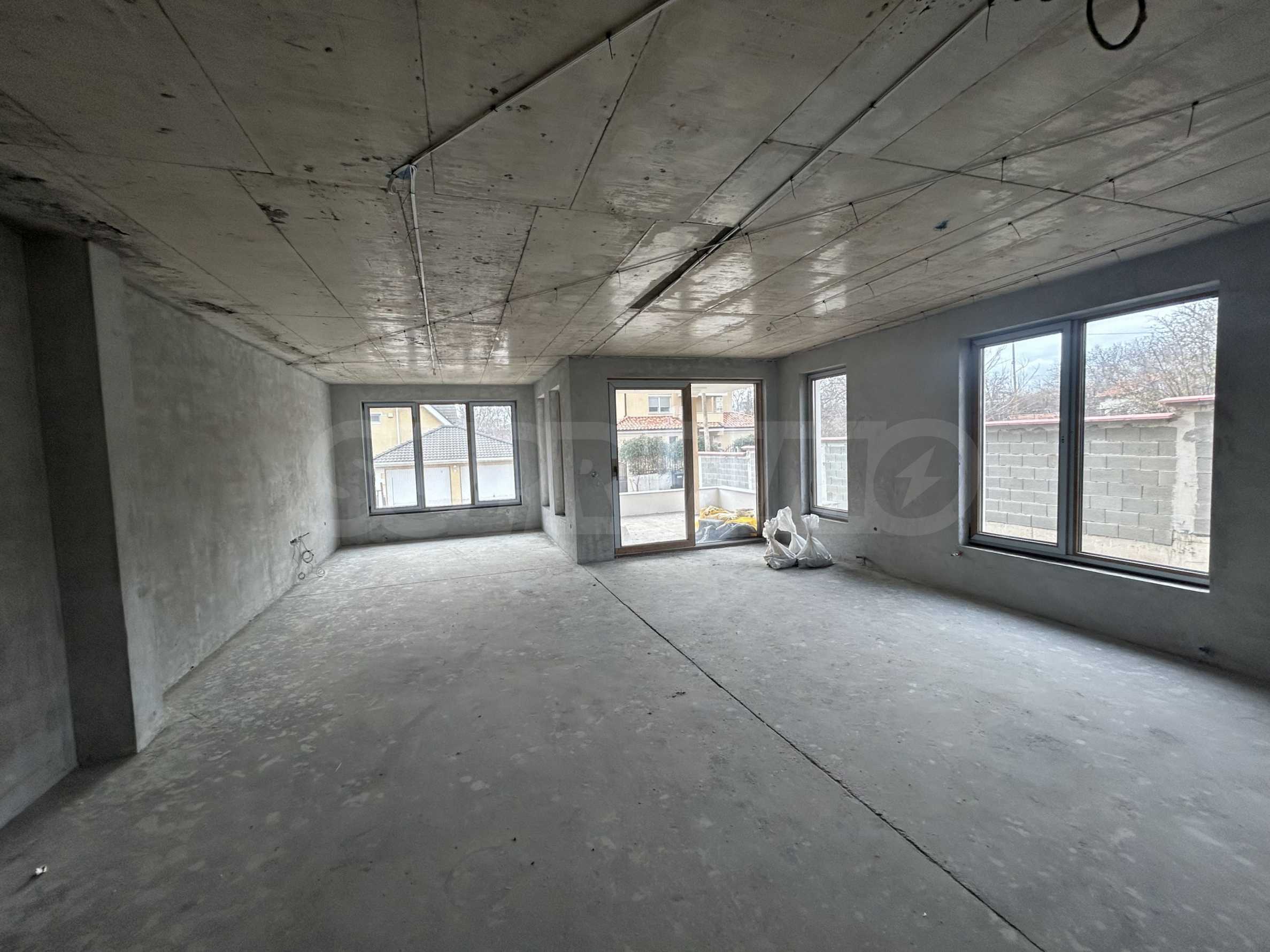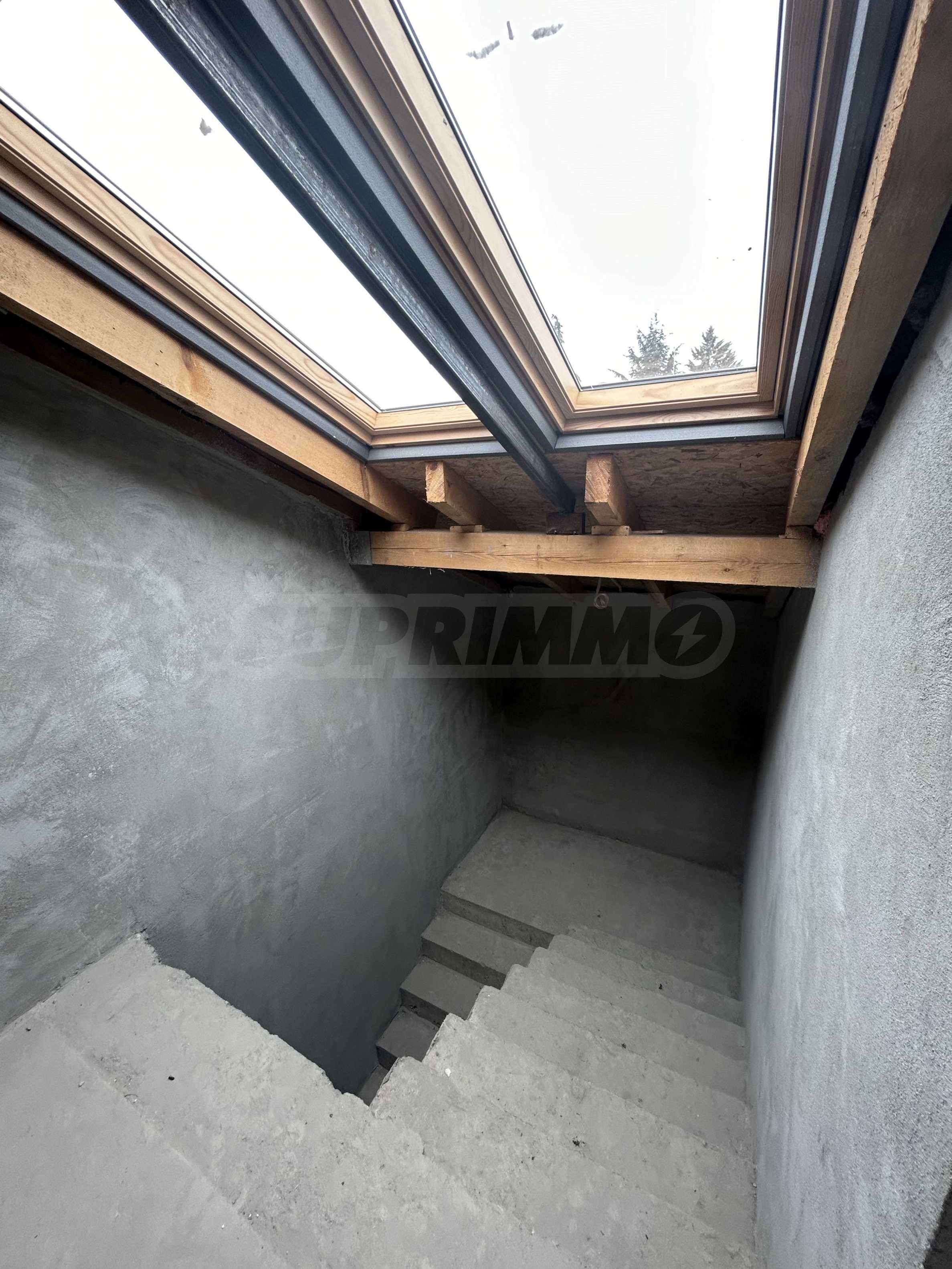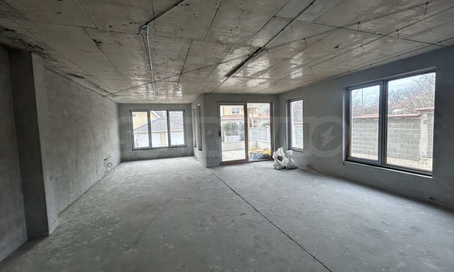 - първи етаж: входно антре, мокро помещение, баня/тоалетна, просторна всекидневна с кухненска част с площ от 56 кв.м, покрита тераса, вътрешно стълбище;