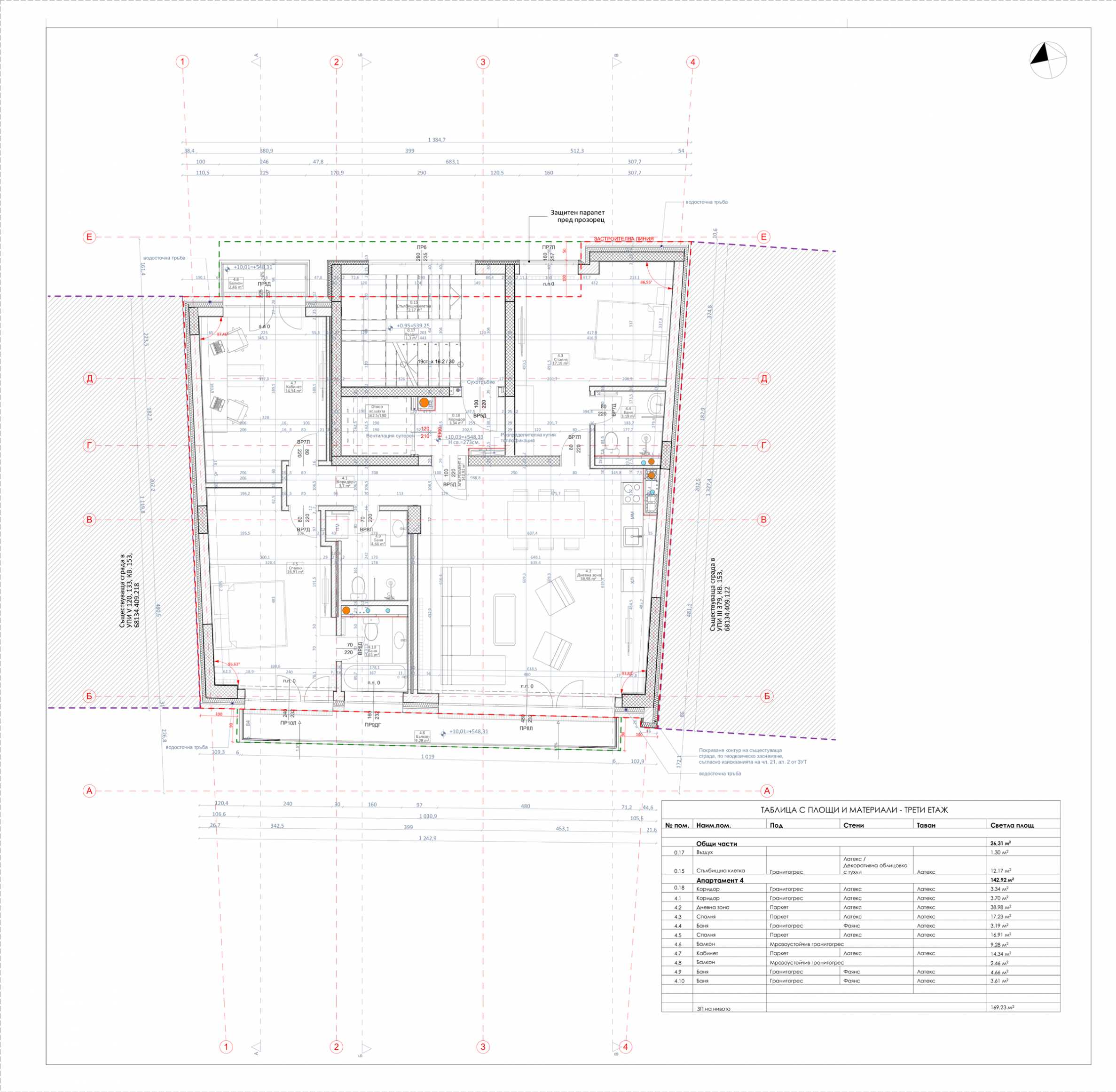 Имотът е с изложение юг/север и заема трети жилищен етаж от пет.