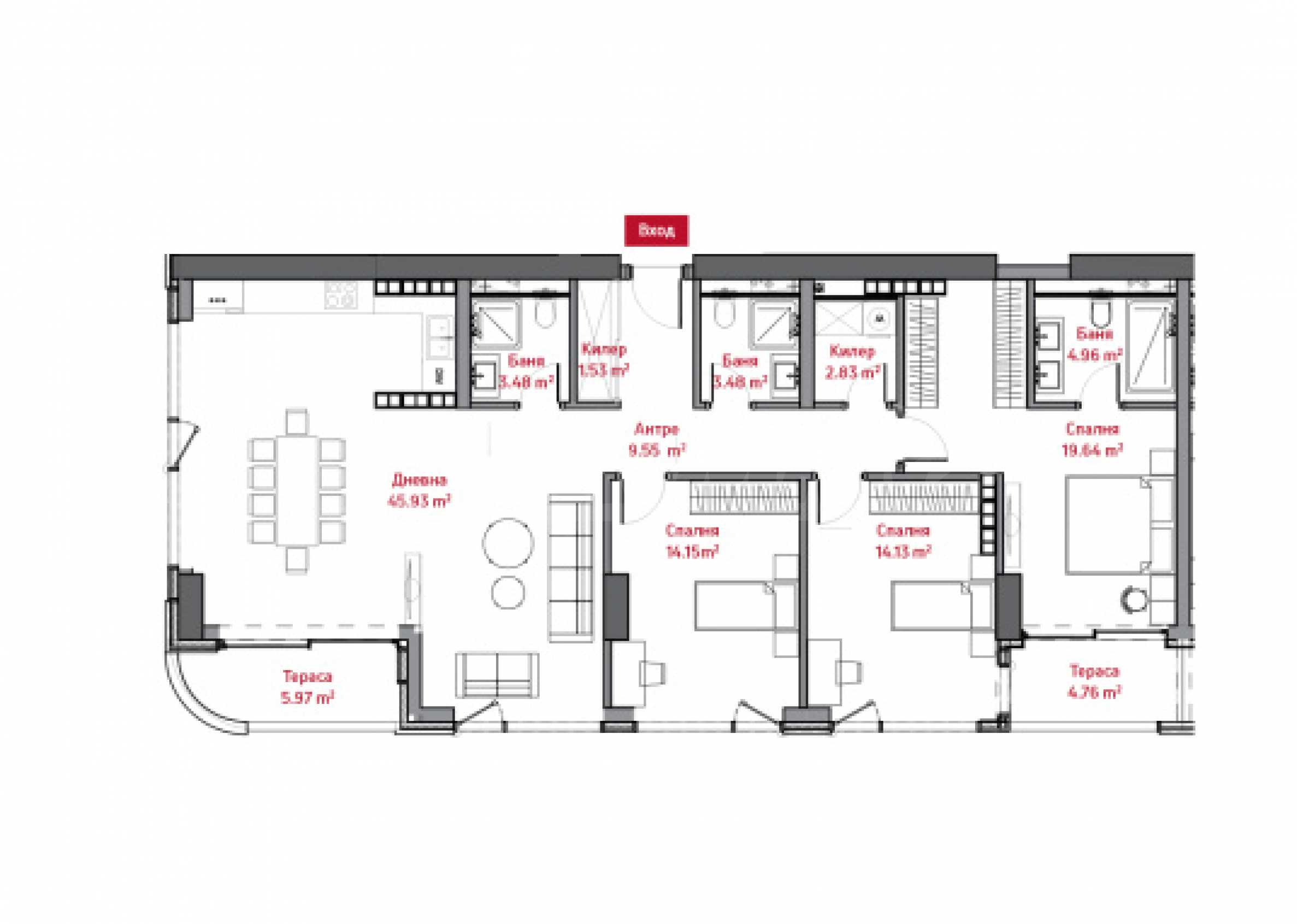 Вляво са разположени втора баня, голям килер, две спални с отличен размер от над 14 кв.м. всяка, както и голяма 20 кв.м. главна спалня със собствена баня и тераса.