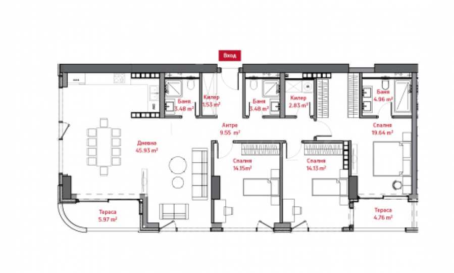 Разпределението на апартамента използва чистата жилищна площ от близо 160 кв.м. по изключително оптимален, функционален и практичен начин. Общата застроена площ на жилището е 181.95 кв.м.