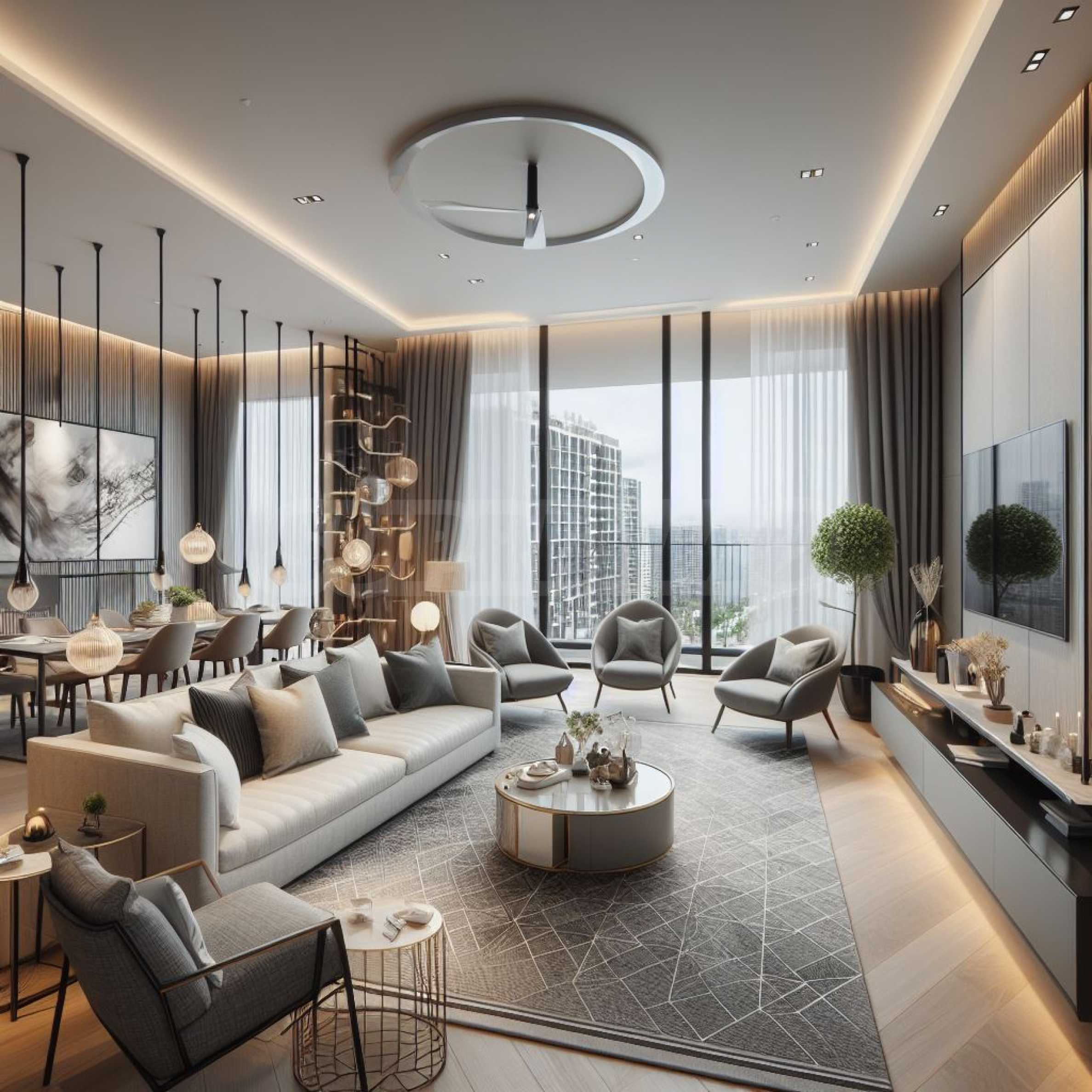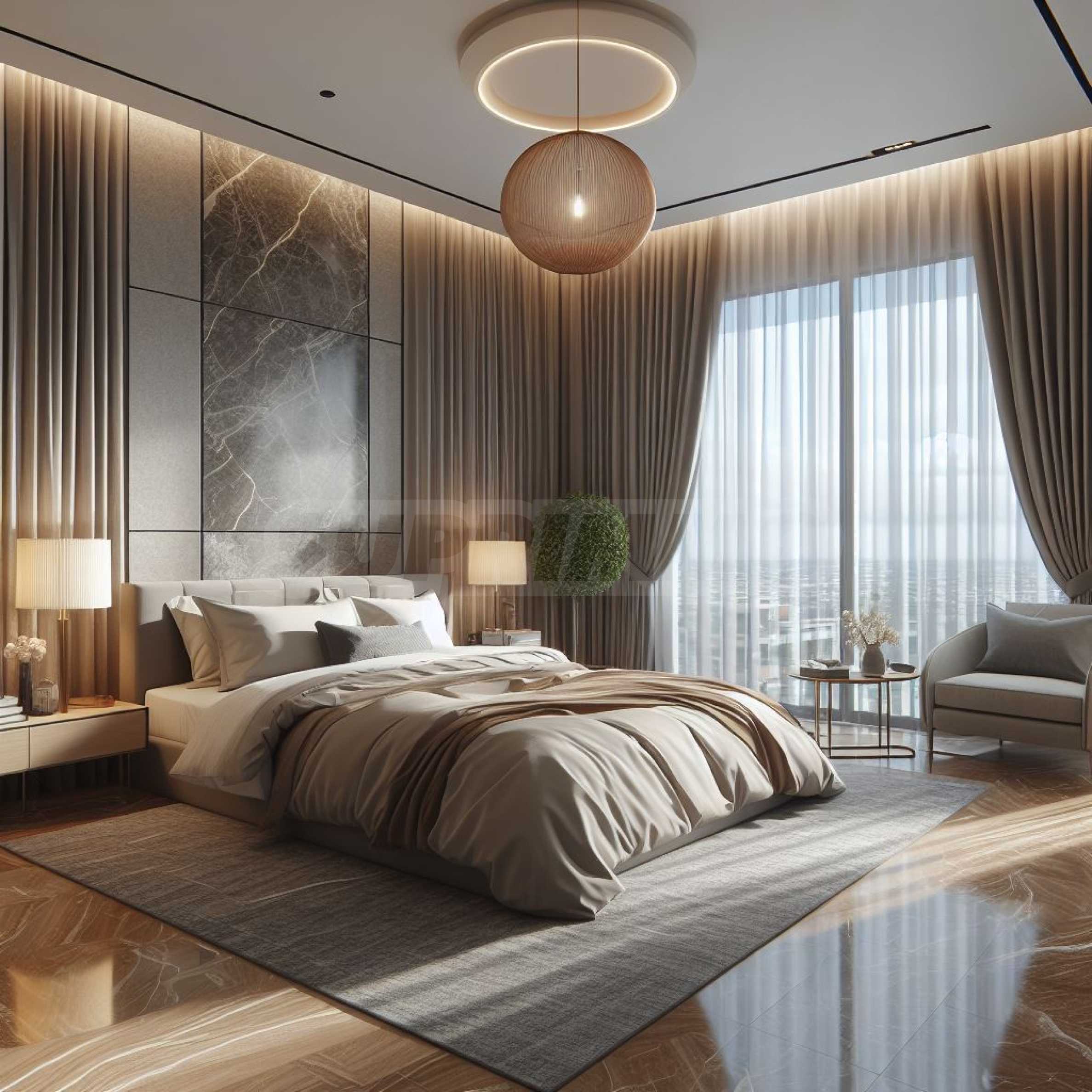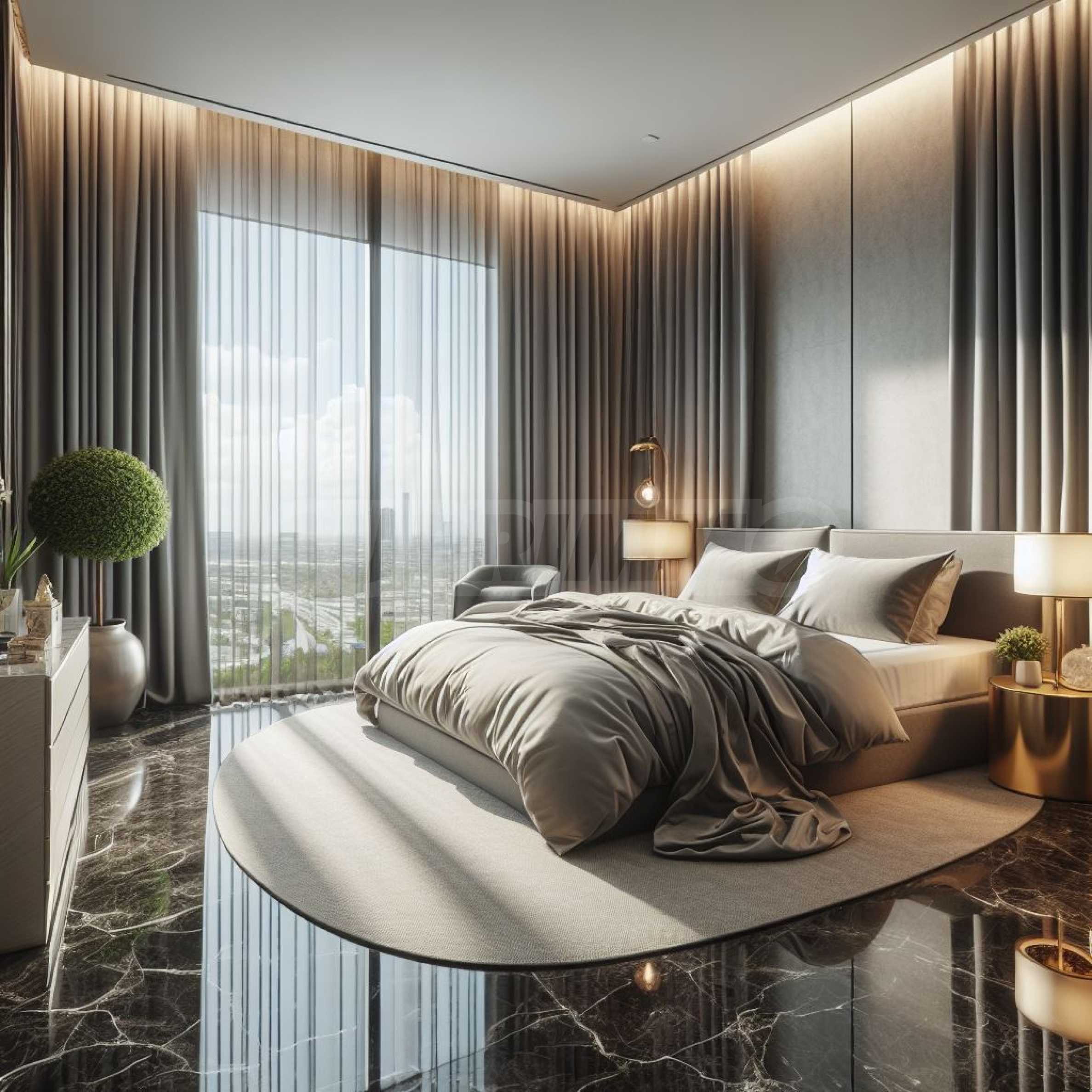 Апартаментът е разположен на 16-и етаж от общо 21 и предлага 196,05 кв.м обща площ и 170,38 кв.м. чиста площ. Жилището се характеризира с просторни и светли помещения, с изложение: изток-запад.
